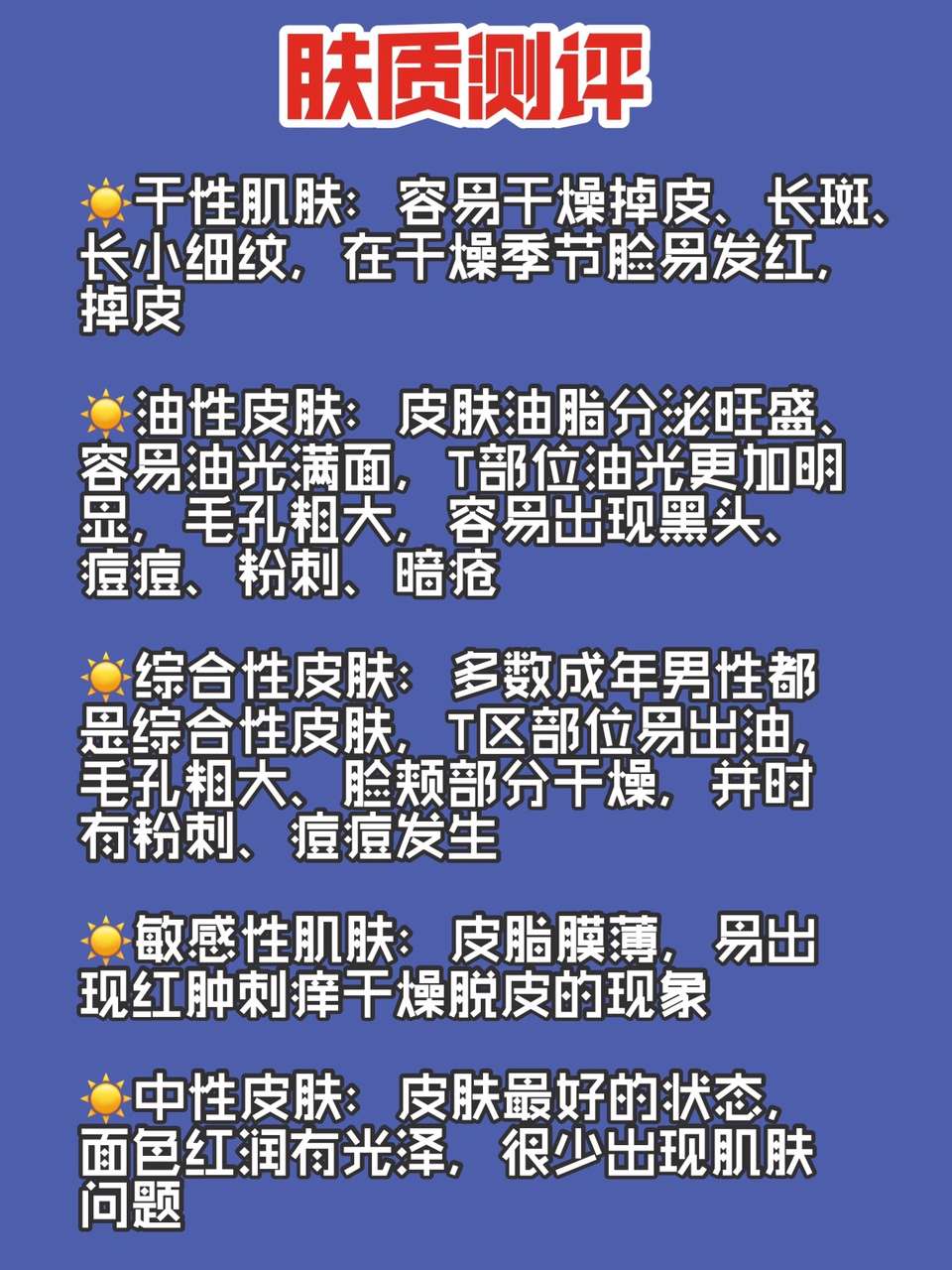 💙中性皮肤:皮肤最好的状态,面色红润有光泽,很少出现肌肤问题