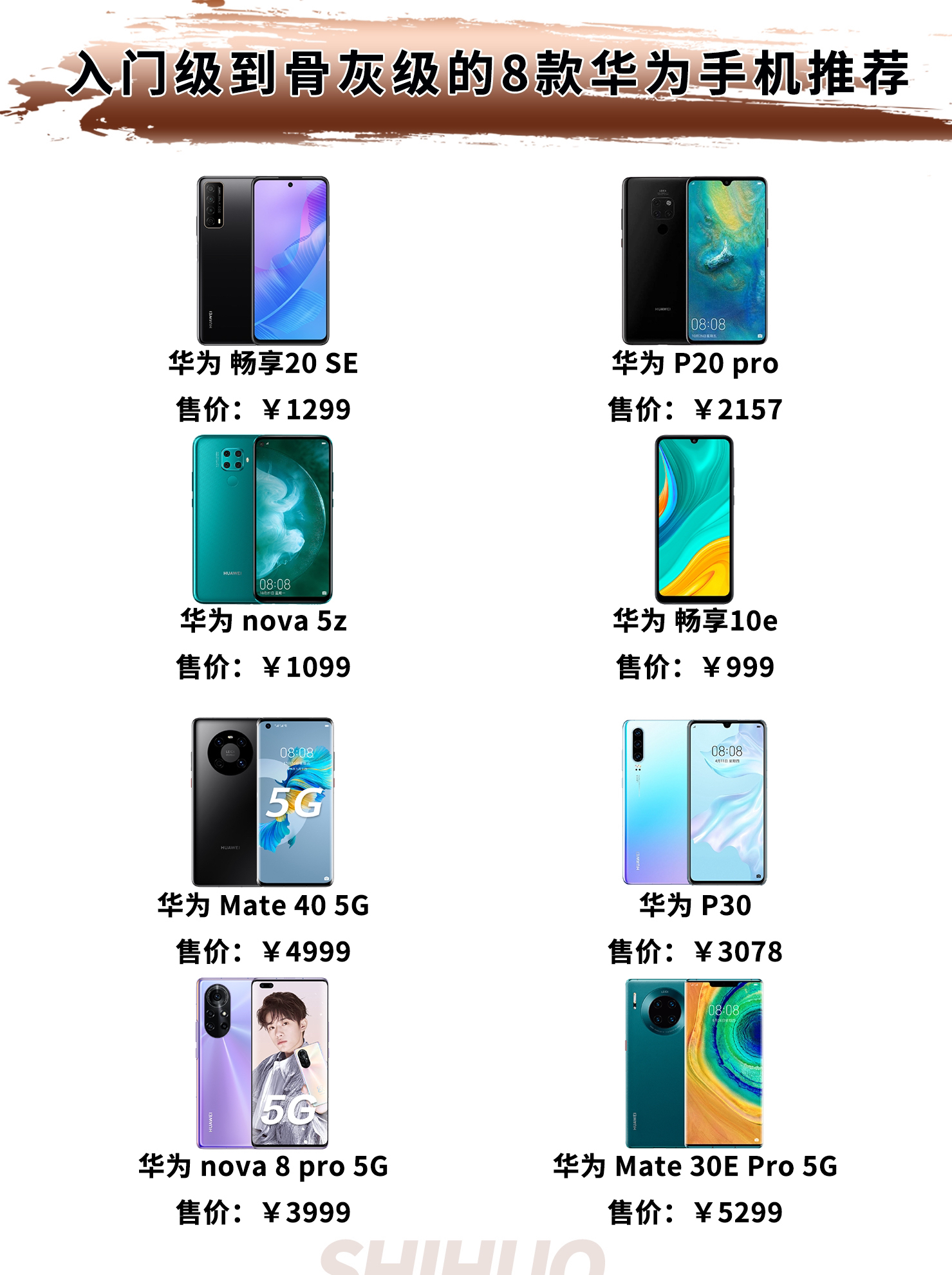 ☄️华为 畅享20 SE 售价:¥1598 发布时间:2021年1月 特色:华为畅享20SE 正面搭载6.67英寸的LCD挖孔屏,搭载麒麟710A 芯片 够用;最大亮点是20SE有5000毫安时大电池以及22.5W快充,续航给力,非常适合中老年人使用。 ☄️华为 P20 pro售价:¥2799 发布时间:2018年04月 电池容量:4000mAh 特色:搭载麒麟970处理器,屏幕采用6.1英寸18...