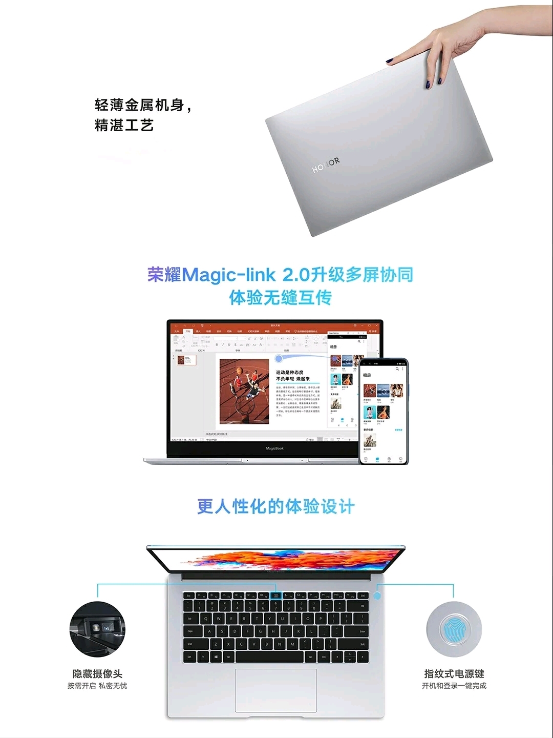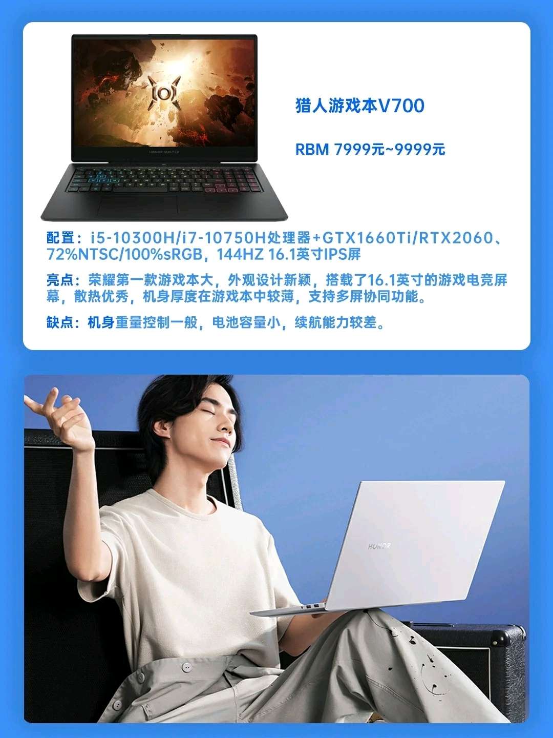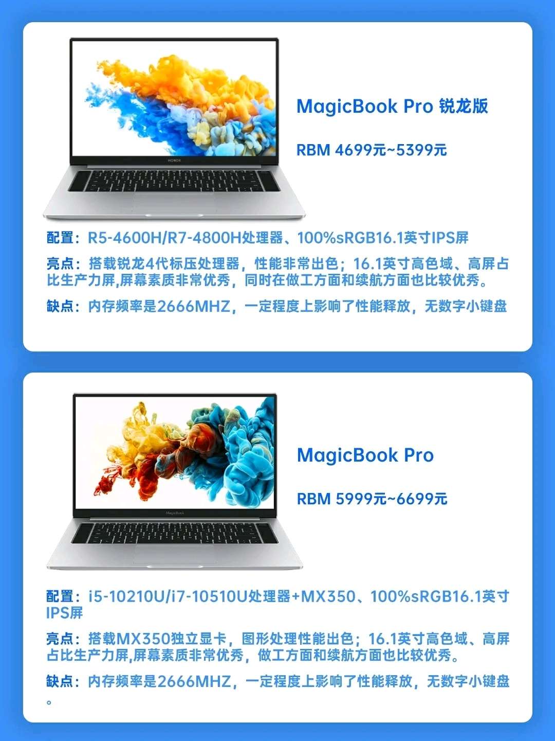 荣耀是华为旗下的子品牌,从开始的模仿小米,到逐步超越,背后是强大的华为品牌支撑和投入。华为进军PC市场就后,迅速取得了不错的市场反响。 荣耀笔记本💻和华为笔记本🖥️一样,支撑手机与电脑联动,独有的碰传方便用户在手机和电脑间传文件,提高效率。 目前荣耀笔记本目前覆盖了入门级轻薄本,大屏全能本和游戏本👇🏻👇🏻 🌈分别对应Magicbook数字系列、Pro系列和猎人V系列。 1⃣️荣耀Magic...
