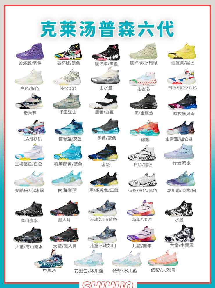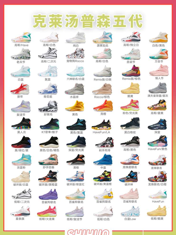 KT系列最近两年可谓风生水起,成为了国产实战鞋的代表。然而克莱在球场上却伤病不断,所以5代6代在鞋身设计上悄悄的开始注重保护性了,将原本的高帮变得更紧实,防侧翻等小细节也做得更好。在出色造型的加持下,部分配色甚至要加价较多才能购买,这足以说明其影响力。 KT5 发售时间:2019.9.20 识货价格:300~2200💰 配色版本:71双 A-web的鞋面加上厚实的填充,跟KT4的鞋面支撑强度完全...