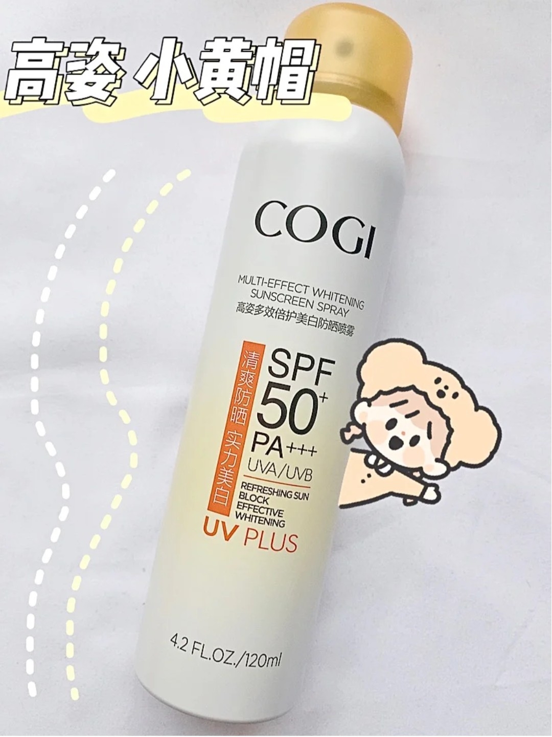 本篇笔记关联了COGI/高姿 小黄帽美白防晒喷雾 清爽不油腻防汗 【经典款】不油腻SPF50+等商品,为用户提供真实的使用体验和购买参考。