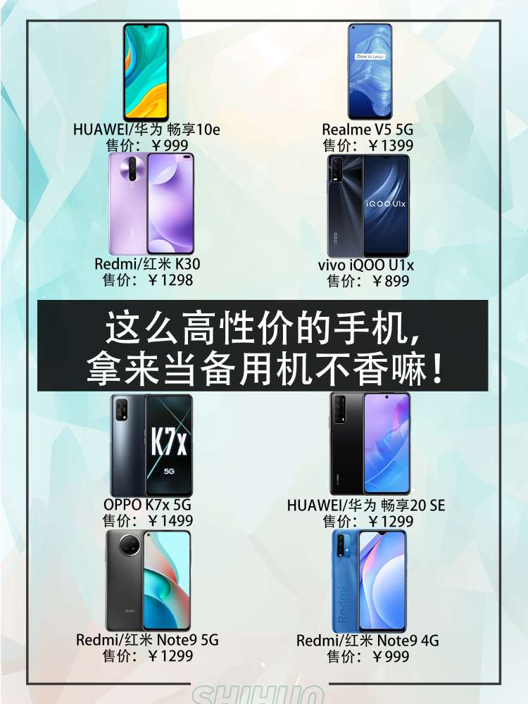 😊HUAWEI/华为 畅享10e 推荐指数:⭐⭐⭐ 😉特色:华为 畅享10e 正面搭载6.3英寸珍珠屏,颜值可以:背部是1300万像素主摄,足够应付日常使用;5000毫安时大电池,特别耐用,千元不到的价格,可以买来当作备用机。 😊Realme V5 5G 推荐指数:⭐⭐⭐ 😉特色:20年主流的千元机,屏幕更好,性能更强,5000毫安电池搭配30W快充,在千元机行列相当出色,AG材质背面也相当出色,...