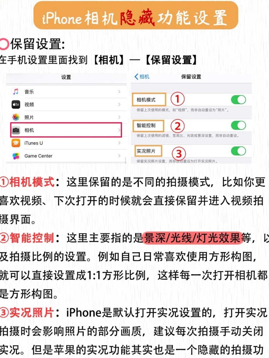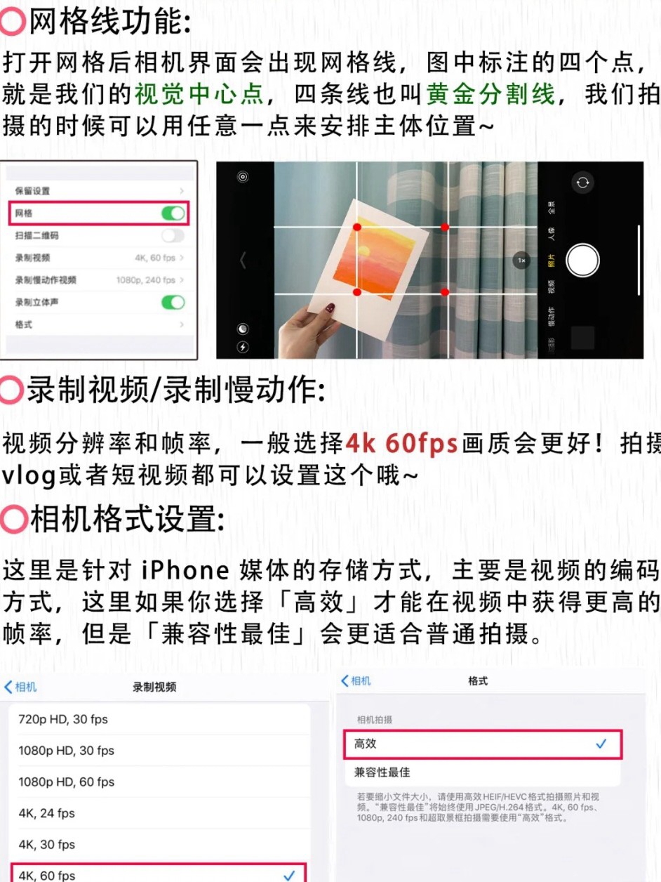 iPhone手机的隐藏功能和拍照技巧~让你的手机秒变单反 ‼️相机的基础设置✔️网格线:网格线会把画面平均分成九块,在中心块上四个角的点,用任意一点的位置来安排拍摄对象的位置。这几个点都符合”黄金分割定律”,都是很好的位置🌟✔️保留设置:全部打开就🉑✔️录制视频宝宝们录视频时,将视频分辨率和帧率调到4k 60fps画质会更好~ ✔️智能HDR:苹果手机的智能HER,无论是拍照还是录像,画面高光和阴...