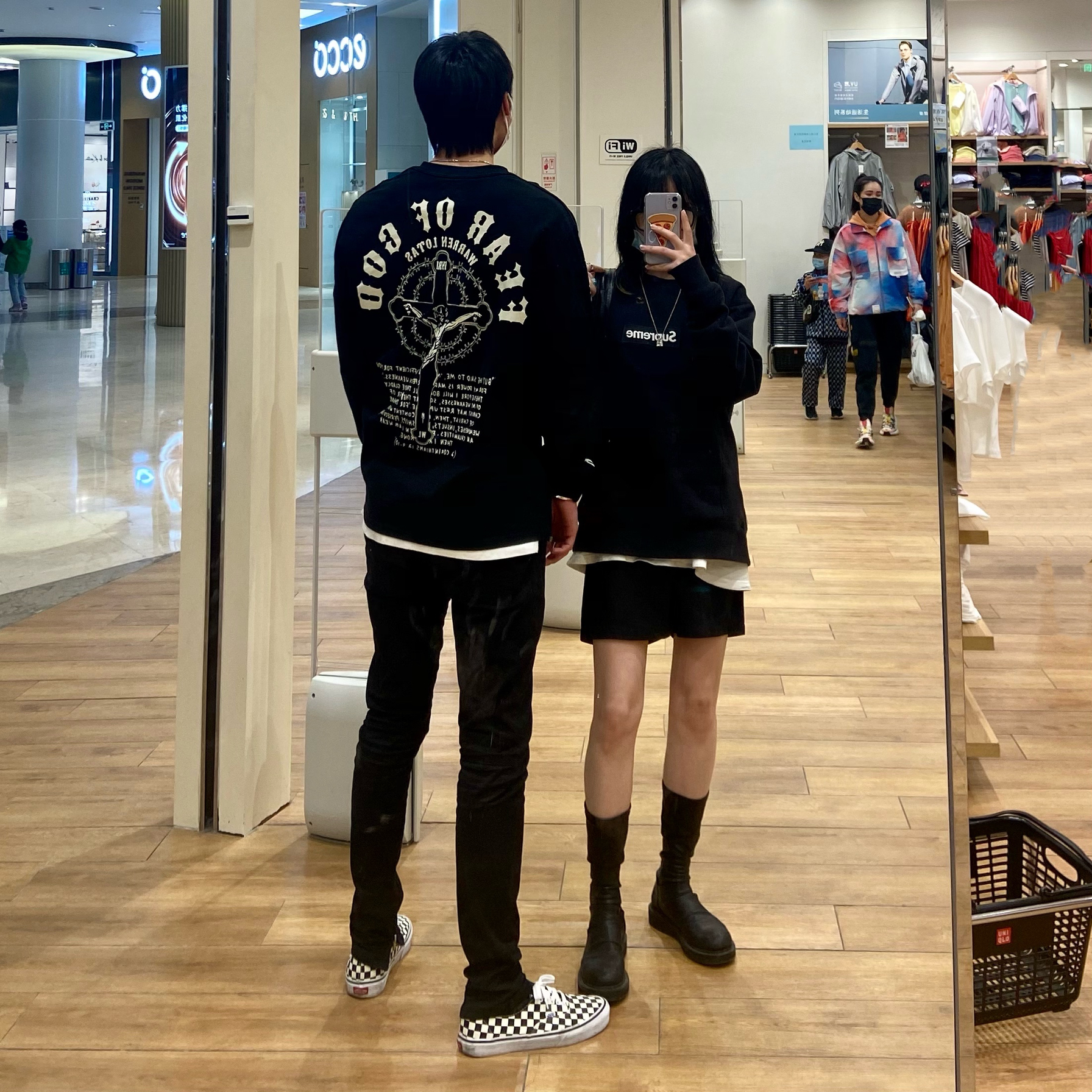 👔:supreme box logo fog 长袖 👖:都淘宝随便买的 👟:靴子(淘宝随便买的自主) vans棋盘格 今天两个人没有说好,但是不约而同的穿了all black 果然这种天气 一身黑总不会出错的 现在正是卫衣短裤的季节 整起来