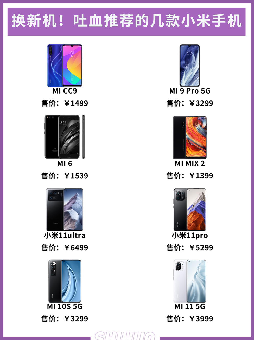 🟤"小米/MI CC9 售价:1499 特色:是小米与美图合作的一款主打拍照的手机,在极弱光情况下也能拍出高质量的美颜人像,采用4030毫安电池与18W充电器的搭配,并且支持MIUI 11,易用性非常强,仅重179g也非常轻薄。" 🟤"小米/MI MIX 2S 售价:¥1846 发布时间:2018年03月 推荐指数:⭐️⭐️⭐️ 特色:搭载了骁龙845处理器,配备了6GB起内存,以及64GB起的U...