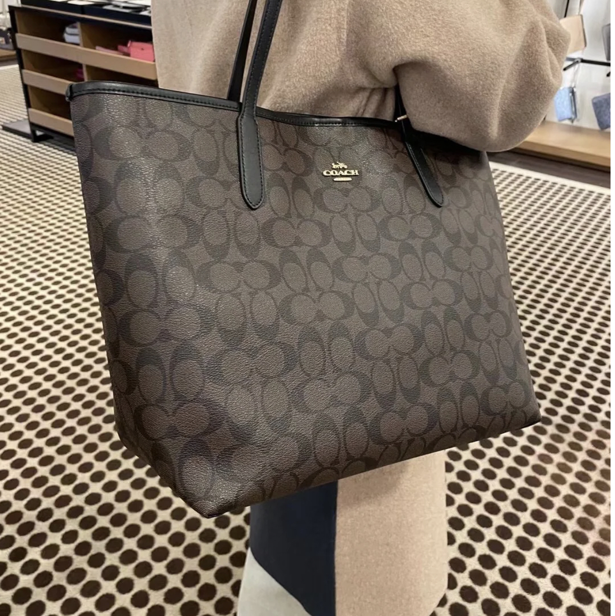 本篇笔记关联了Coach City Tote 33系列 大号 大容量PVC老花敞口撞色涂层帆布配皮按扣开合托特单肩手提包 深棕色 等商品,为用户提供真实的使用体验和购买参考。