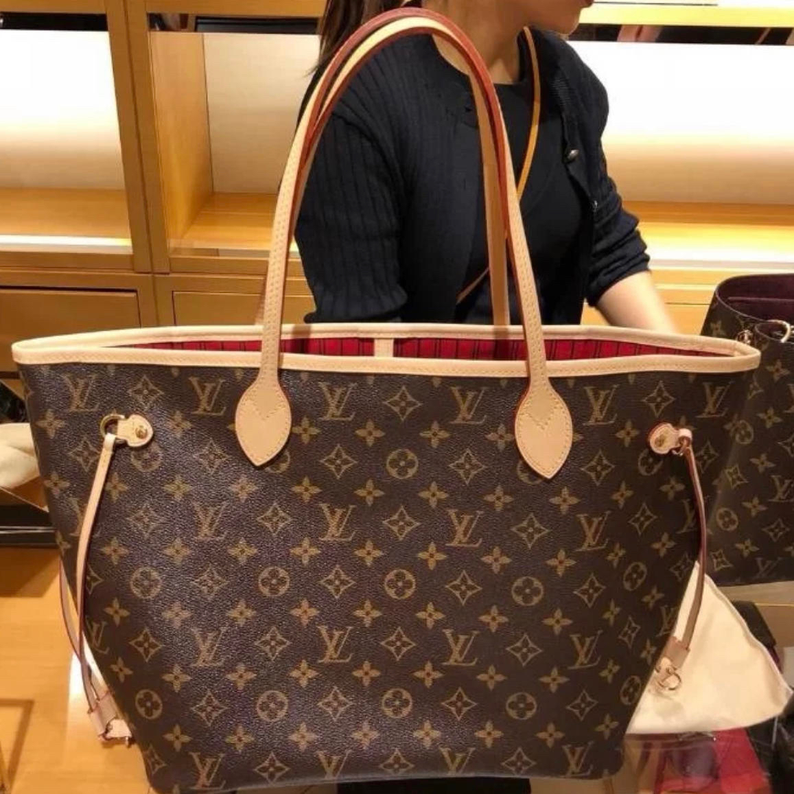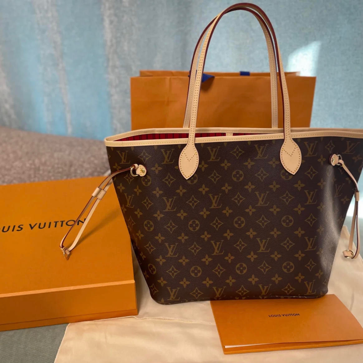 本篇笔记关联了Louis Vuitton/路易威登 Neverfull 中号 经典老花满印内里涂层帆布拼牛皮饰边购物袋单肩托特子母包手提包 牡丹红内衬等商品,为用户提供真实的使用体验和购买参考。