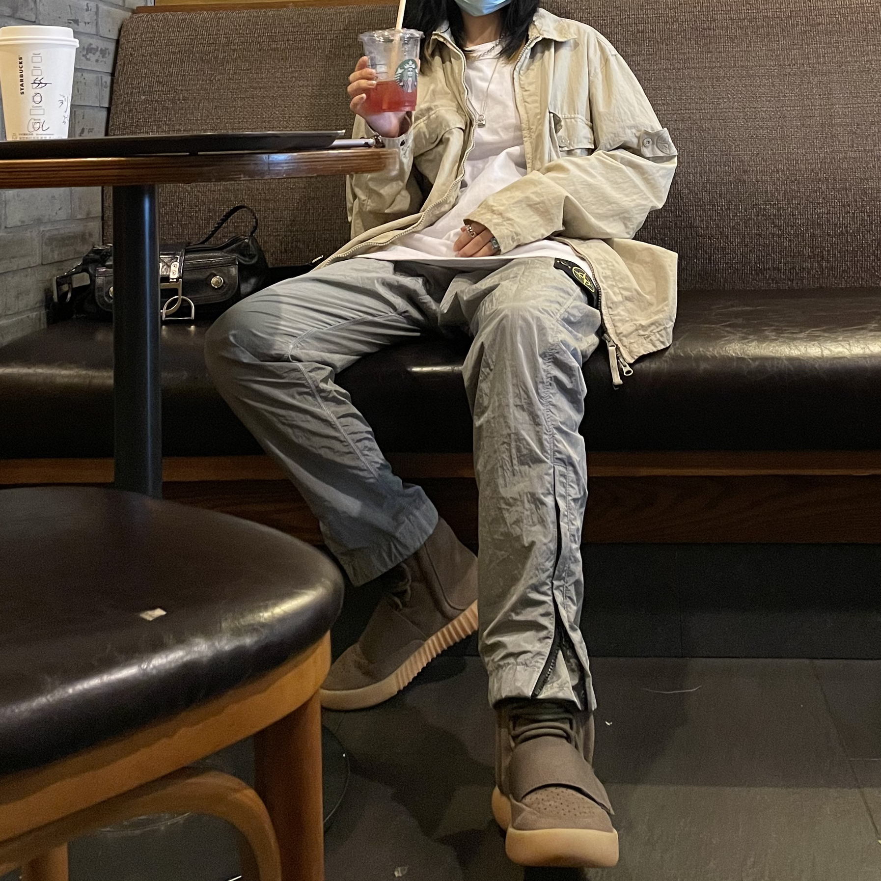 👔:stone island 基础纯色T恤 Travis Scott x McDonald's 卫衣 🧥:stone island 幽灵👻 👖:stone island 银色 🍑随便买的 👟:yeezy750 巧克力🍫 aj1兔八哥 今天一身保安服跟同事出来玩,这个天气石头岛穿着最舒服。