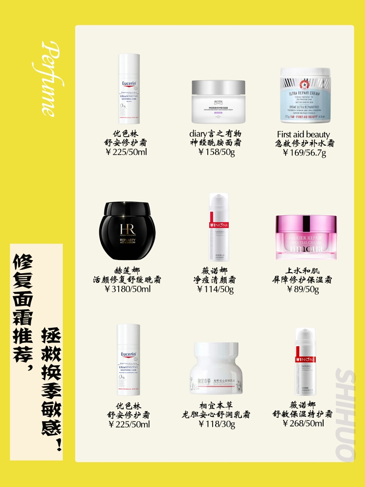 换季敏感肌的伙伴都知道用什么面霜来缓解肌肤问题吗,如果不知道,这里我给大家分享几款呀~ 1⃣优色林舒安修护霜 售价:¥225/50ml 推荐指数:4⭐ 配方温和,基质纯净,成分简洁,香料酒精都无添加,敏感肌可用。修护舒缓敏感肌、红血丝,皮肤屏障受损,晒后刺痛 2⃣diary言之有物神经酰胺面霜 售价:¥158/50g 推荐指数:3⭐ 质地很清爽,神经酰胺去修复受损的皮肤屏障,非常适合敏感肌肤 ...