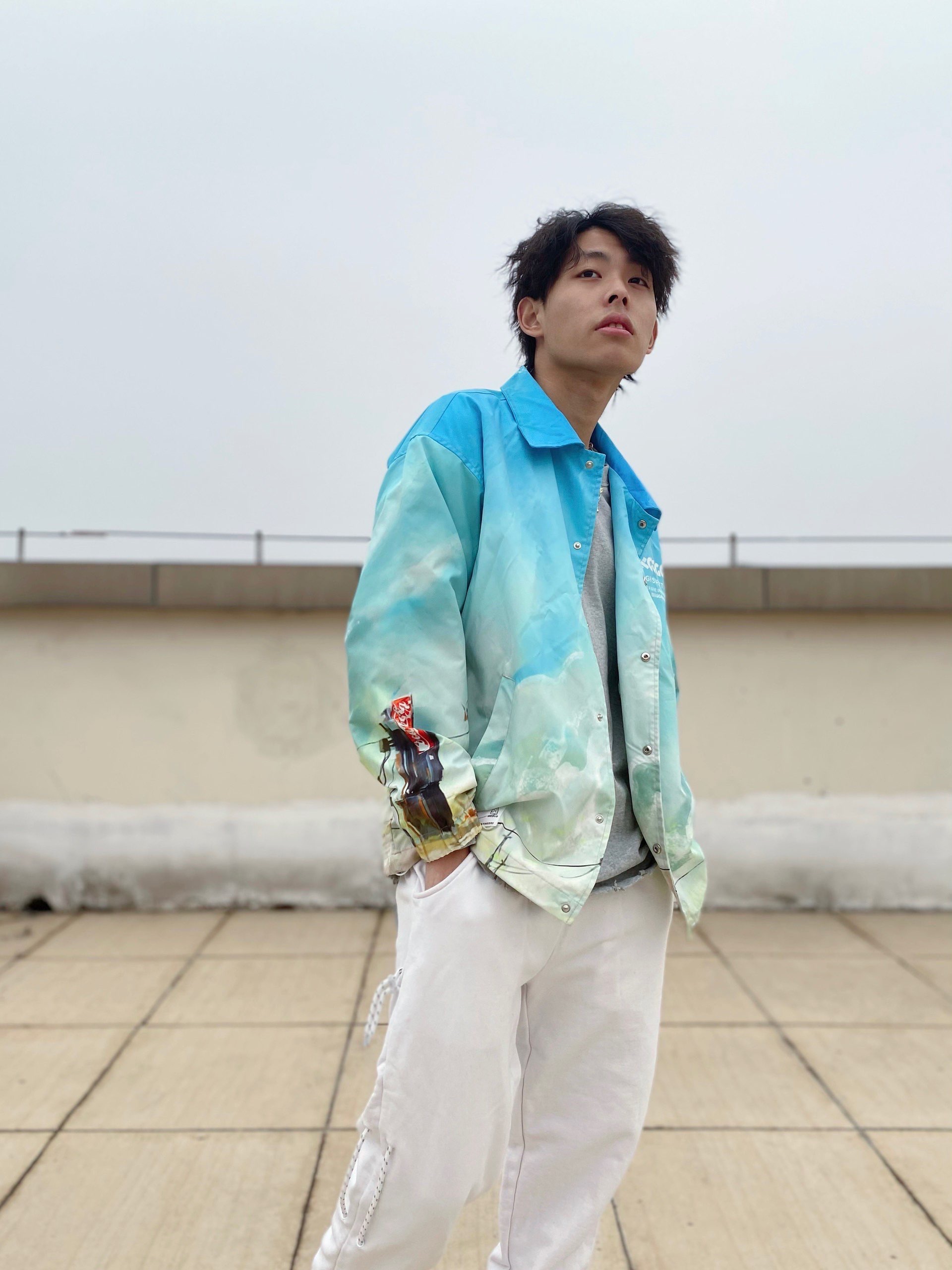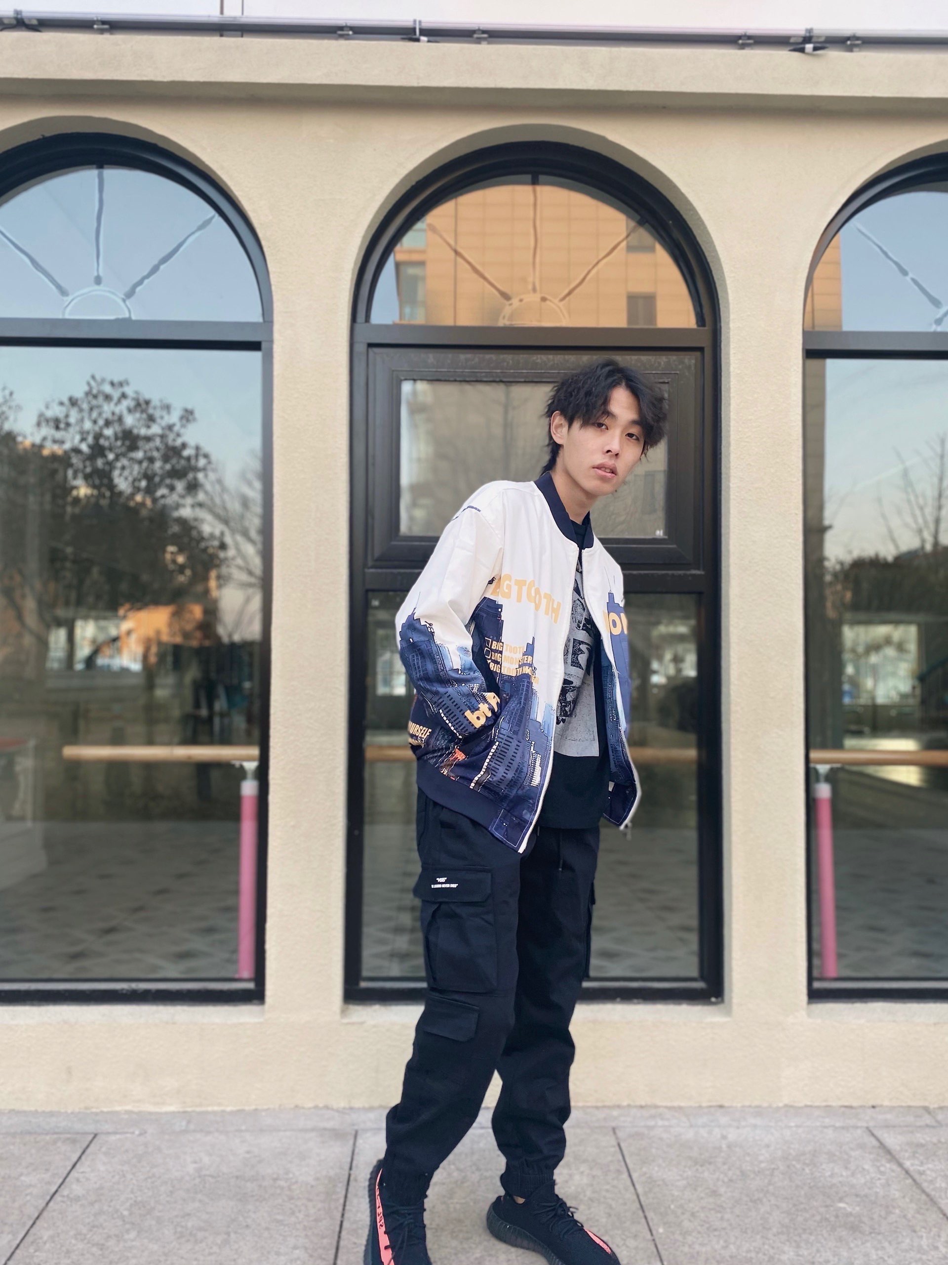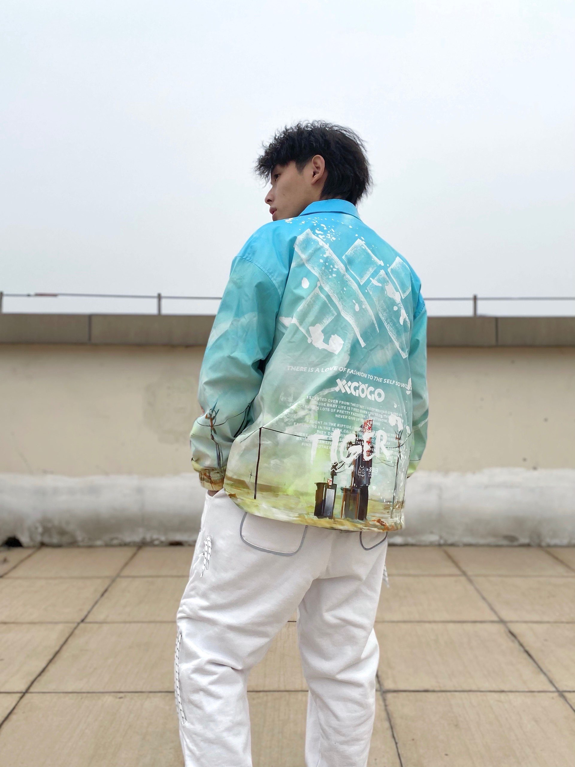 这套就舒服好多了,白色的裤子搭配青花的夹克效果不要太出众哦 非常适合春季中和的温度搭配一下