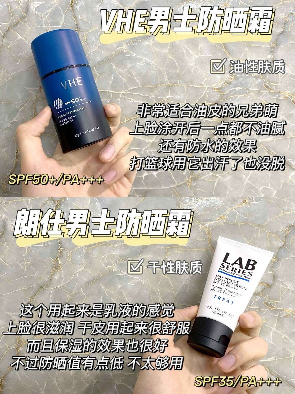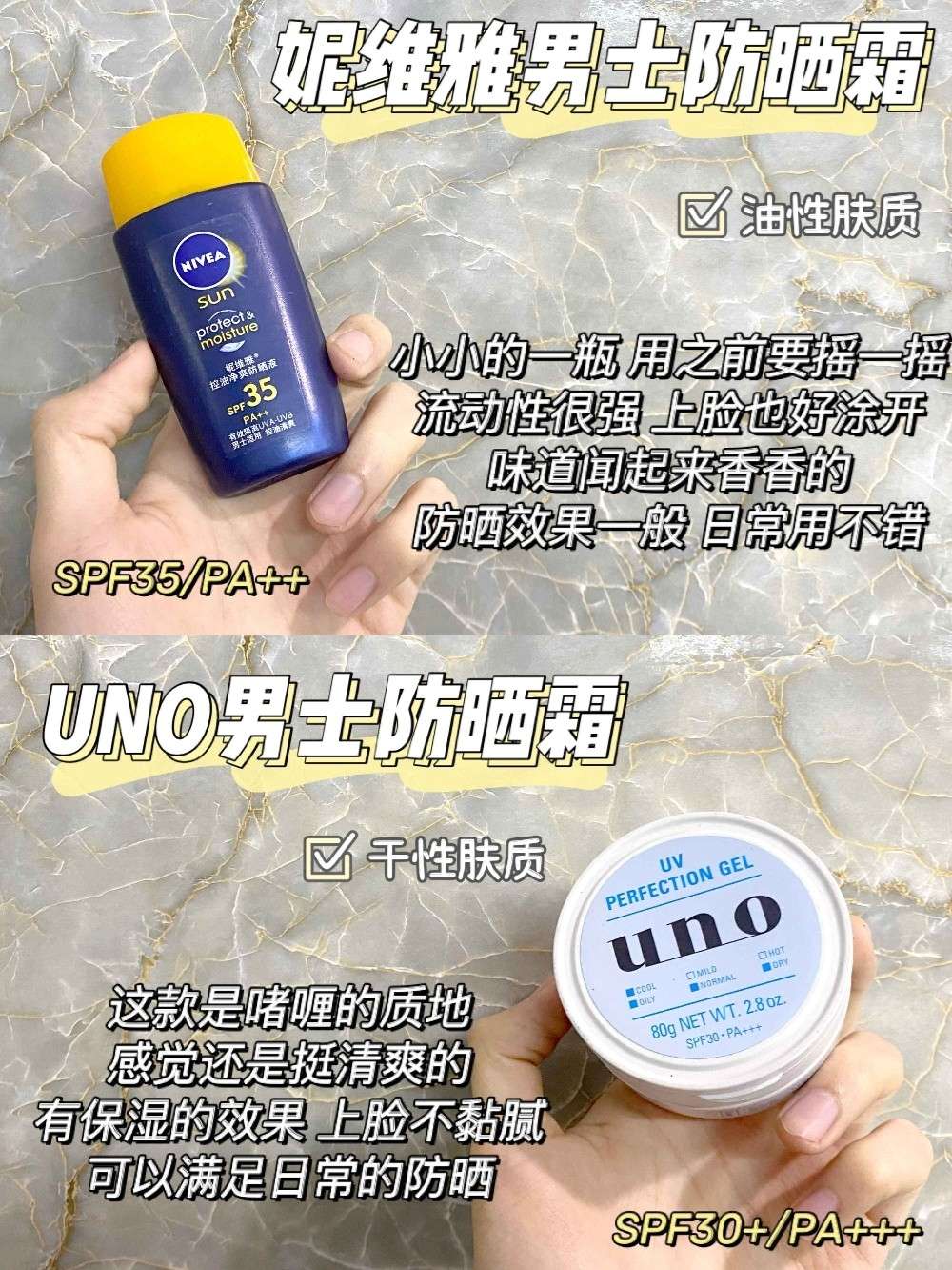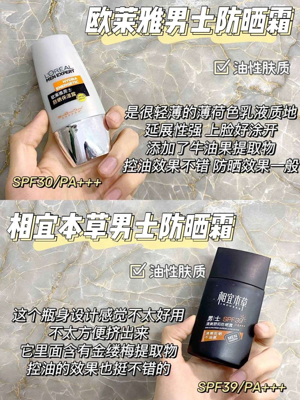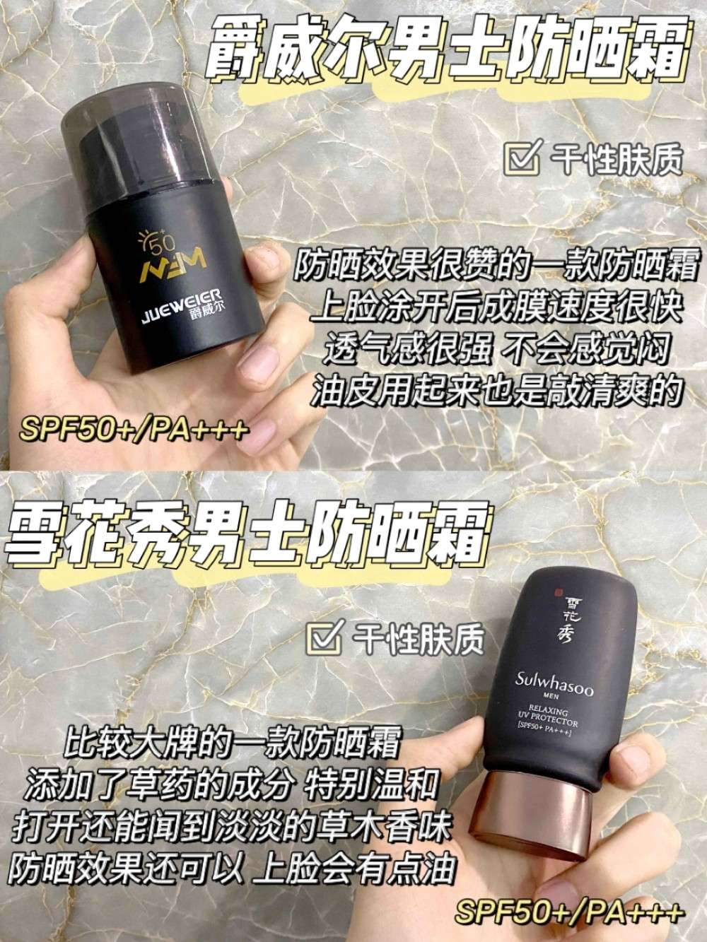 💫曼秀雷敦男士防晒霜 流动性很强的乳液质地,上脸涂开后也没有很厚重,防晒值挺高的,就是不防水成膜后有一点假白。 ☁️SPF50+/PA++++ 💫艾诺碧男士防晒霜 主打控油保湿的防晒霜,控油的效果确实挺不错的,油皮用一天脸上也不怎么油,不过干皮用起来可能会起皮。 ☁️SPF50+/PA++++ 💫妮维雅男士防晒霜 小小的一瓶用之前要摇摇,流动性很强,上脸也好涂开,味道闻起来香香的,防晒效果一般...