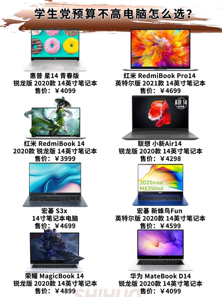 HP/惠普 星14 青春版 锐龙版 2020款 售价:4099 特色:非常轻薄的移动办公本,在性价比相对非常高,对预算有限的朋友非常友好,预算有限的小伙伴们可以考虑。 Redmi/红米 RedmiBook Pro14 英特尔版 2021款 售价:4600 特色:屏幕素质极佳,并且带有DC调光,整机比较轻薄,质感不错,作为小米笔记本的回归之作,这次小米的确是在堆料上下了血本,推荐核显I5的那一...
