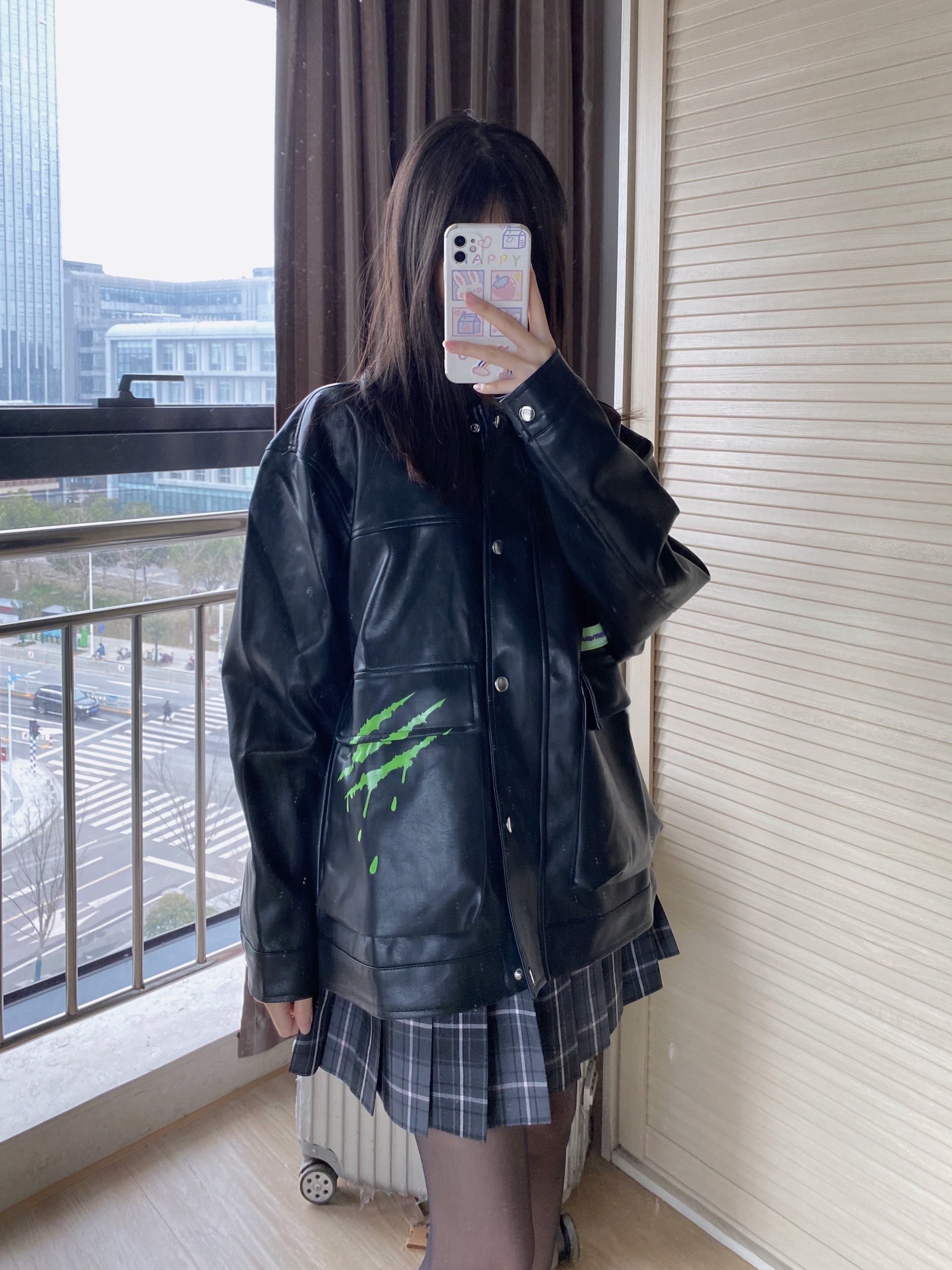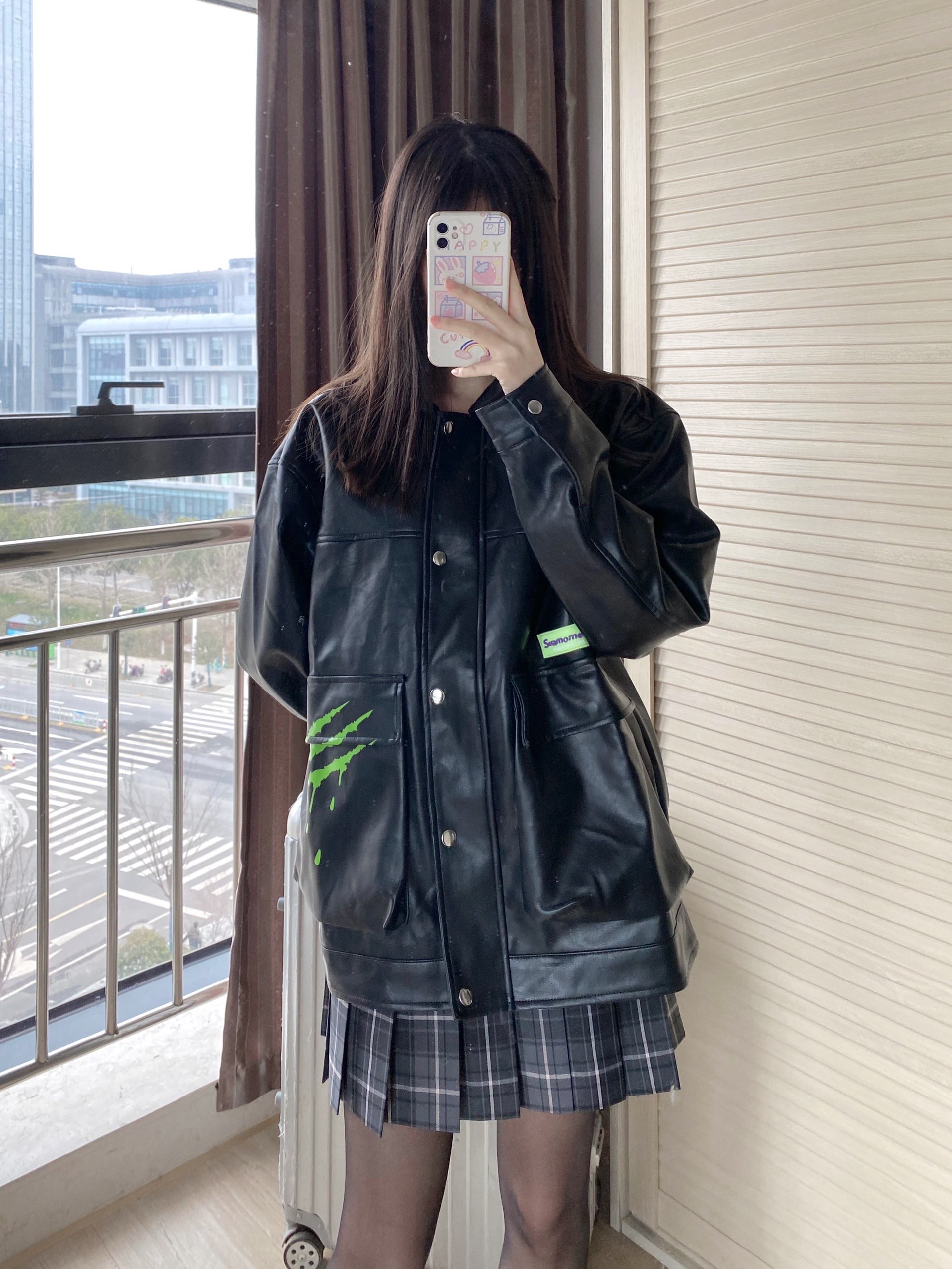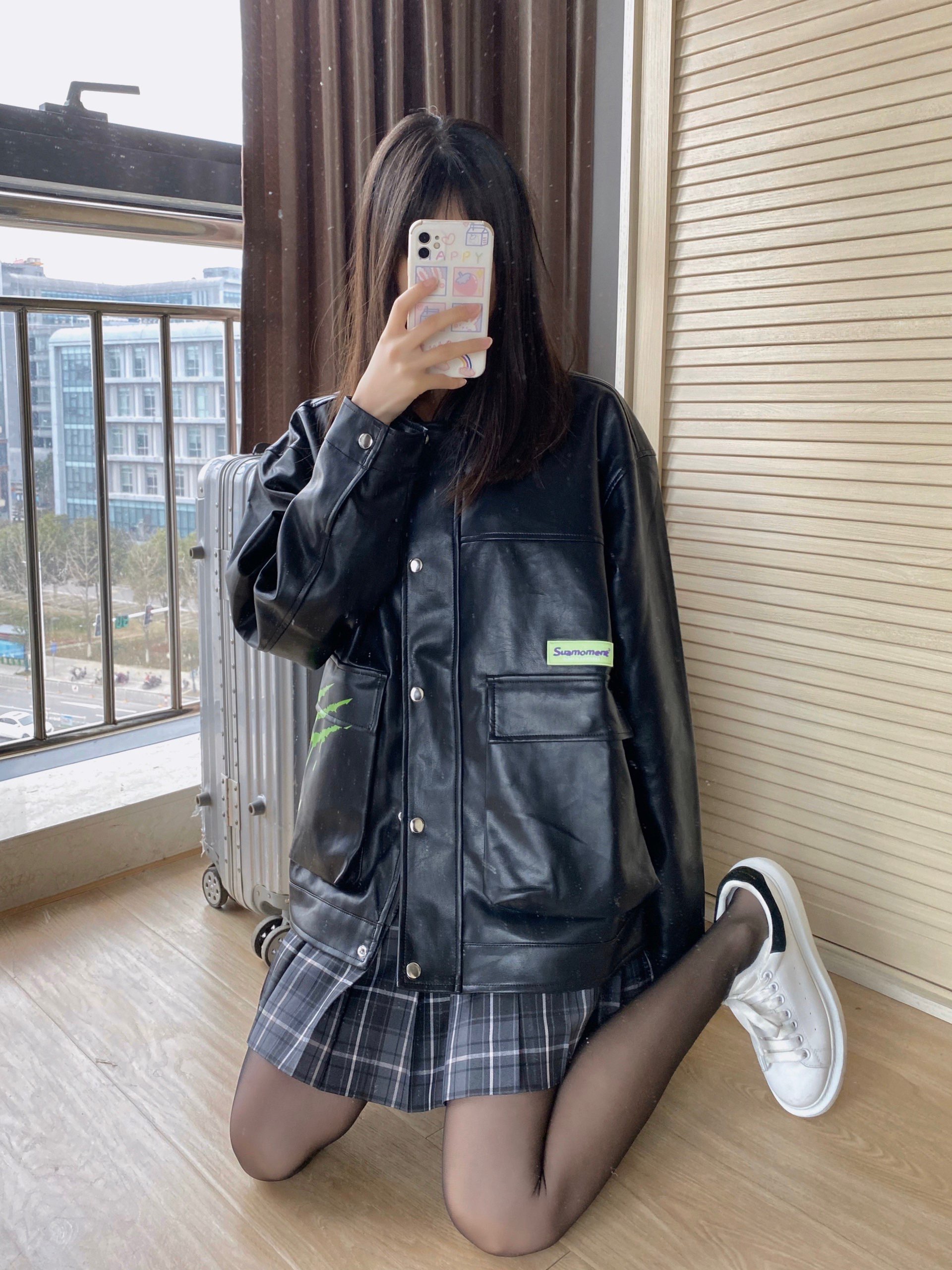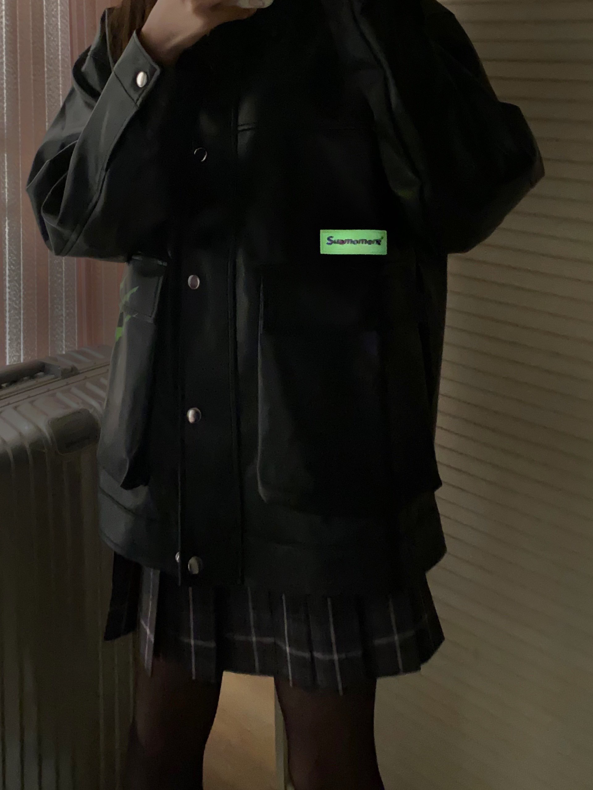 👔:suamoment夜光logo皮质外套 👗:中牌烟灰 👟:麦昆黑尾#Alexander McQueen 黑色超帅的呀 标居然是夜光的 在暗一点的地方就会发光 我穿的是s码