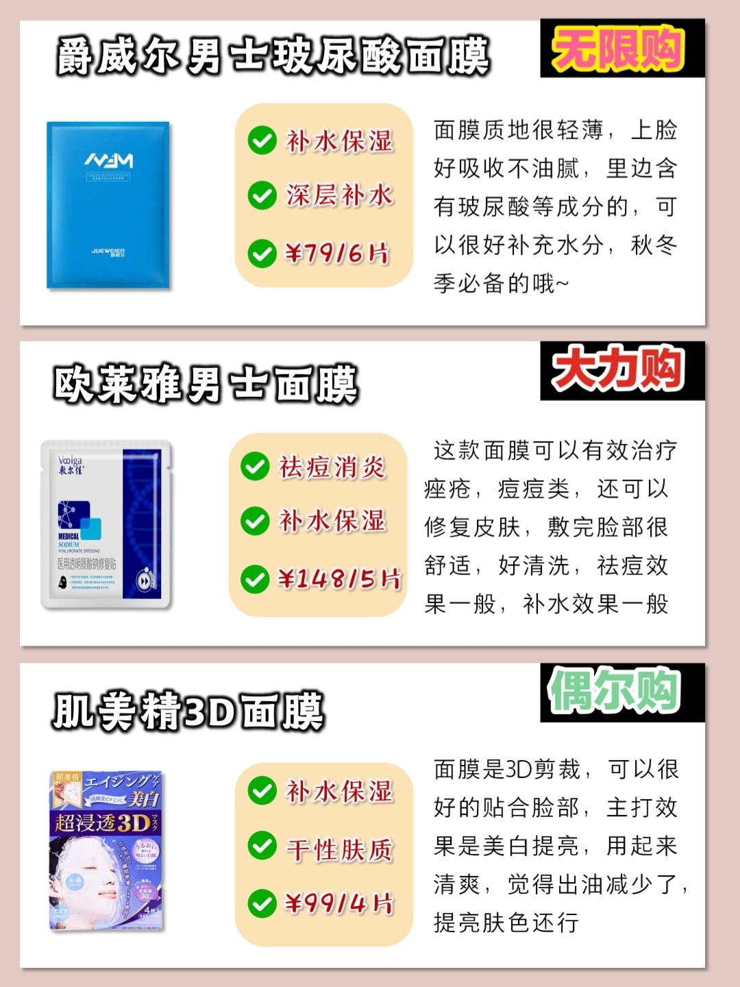 |||自用新品男士面膜推荐🎉 控油补水男士面膜 自用男士补水合集 爱惨了敷面膜的感觉 这个季节正是敷面膜的好时候、我也是一个比较喜欢敷面膜的男士面膜 今天我就来分享一波 ☁️海洋至尊男士面膜 能够调节水油平衡的一款面膜,适合脸.上毛孔粗大的人,它里边还含有烟酰胺的哦,还能体亮肤色,改善皮肤暗沉 ☁️欧莱雅男士囿膜 这款比较适合油皮,火山岩的成分让它清洁力比较好,保湿能力还行,可以吸附毛孔垃圾,...