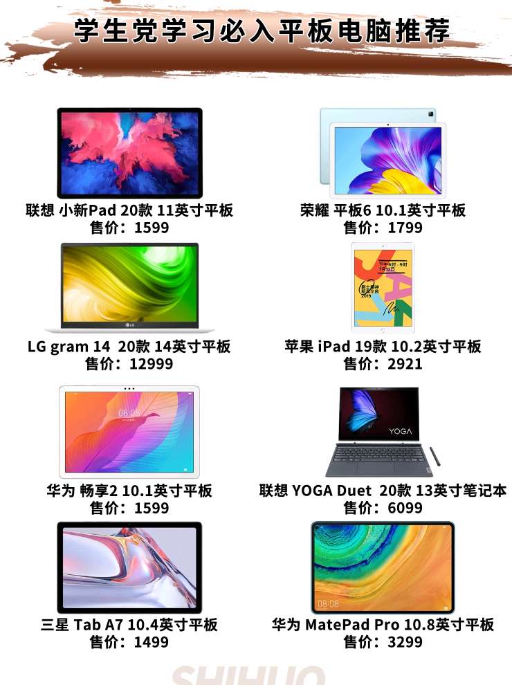 Lenovo/联想 小新Pad 2020款 售价:1599 特色:2K的屏幕比较细腻,6+128的大内存,杜比音效的支持,大电池,自带特殊的电脑模式,一键变成电脑桌面的模样,目前溢价严重,需加价购买。 HONOR/荣耀 平板6 售价:1799 特色:10寸的便携性不如8英寸的,荣耀这款平板处理器不算顶级,但是平时孩子看看网课,玩玩游戏也足够了。自己网上买了皮套和钢化膜,使用感觉非常流畅。 ...