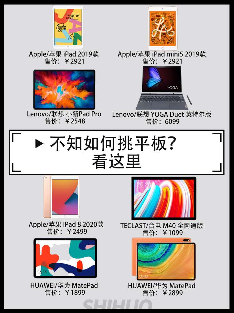 不知道怎么选平板电脑❓那你一定不能错过这一篇👇 ✅苹果 iPad 2019款 10.2英寸平板电脑 售价:2921 推荐指数:⭐⭐⭐ 特色:作为最便宜的标准款ipad,2000就能体验ios的丝滑,作为网课和影音娱乐工具是一个不错的选择。 ✅苹果 iPad mini5 2019款 7.9英寸平板电脑 售价:2921 推荐指数:⭐⭐⭐⭐ 特色:Xs同款芯片性能强劲,体积大小适中,7.9是一个完美...