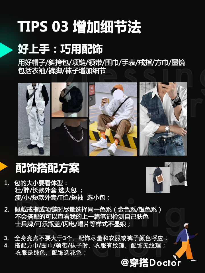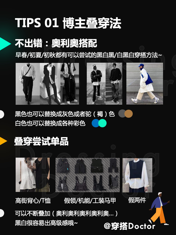 >>TIPS 01 博主叠穿穿搭法 1)不出错穿搭:奥利奥搭配 早春/初夏/初秋都有可以尝试的黑白黑/白黑白穿搭方法~ 黑色也可以替换成灰色或者驼(褐)色 白色也可以替换成各种彩色 2)叠穿穿搭尝试单品 a.高街背心/T恤 b.假领/机能/工装马jia c.假两件衬衫 可以不断叠加(奥利奥利奥利奥利奥…)黑白很容易出高级感哦~ >>TIPS 02 清爽时尚感穿搭 1)穿搭显干...