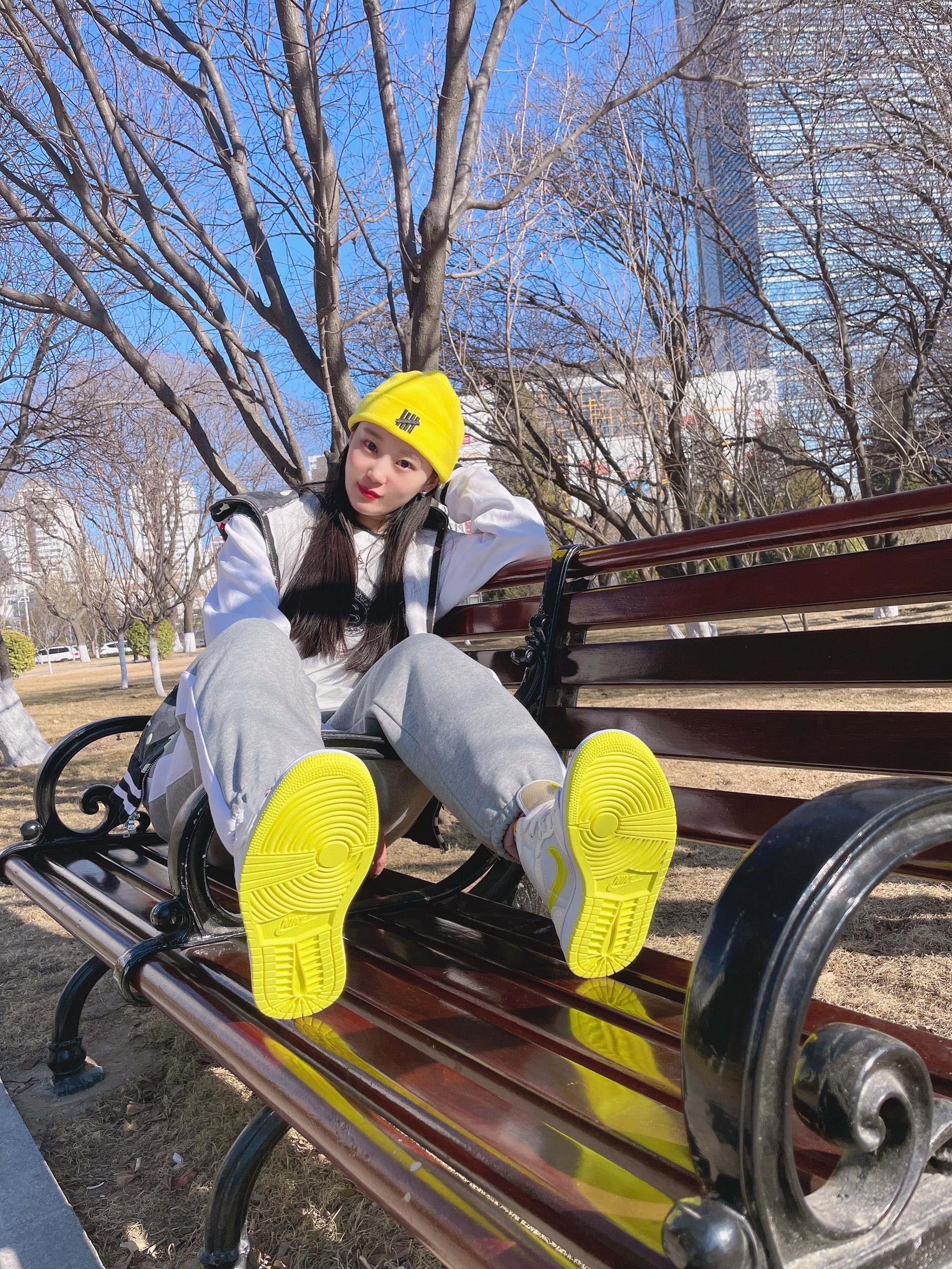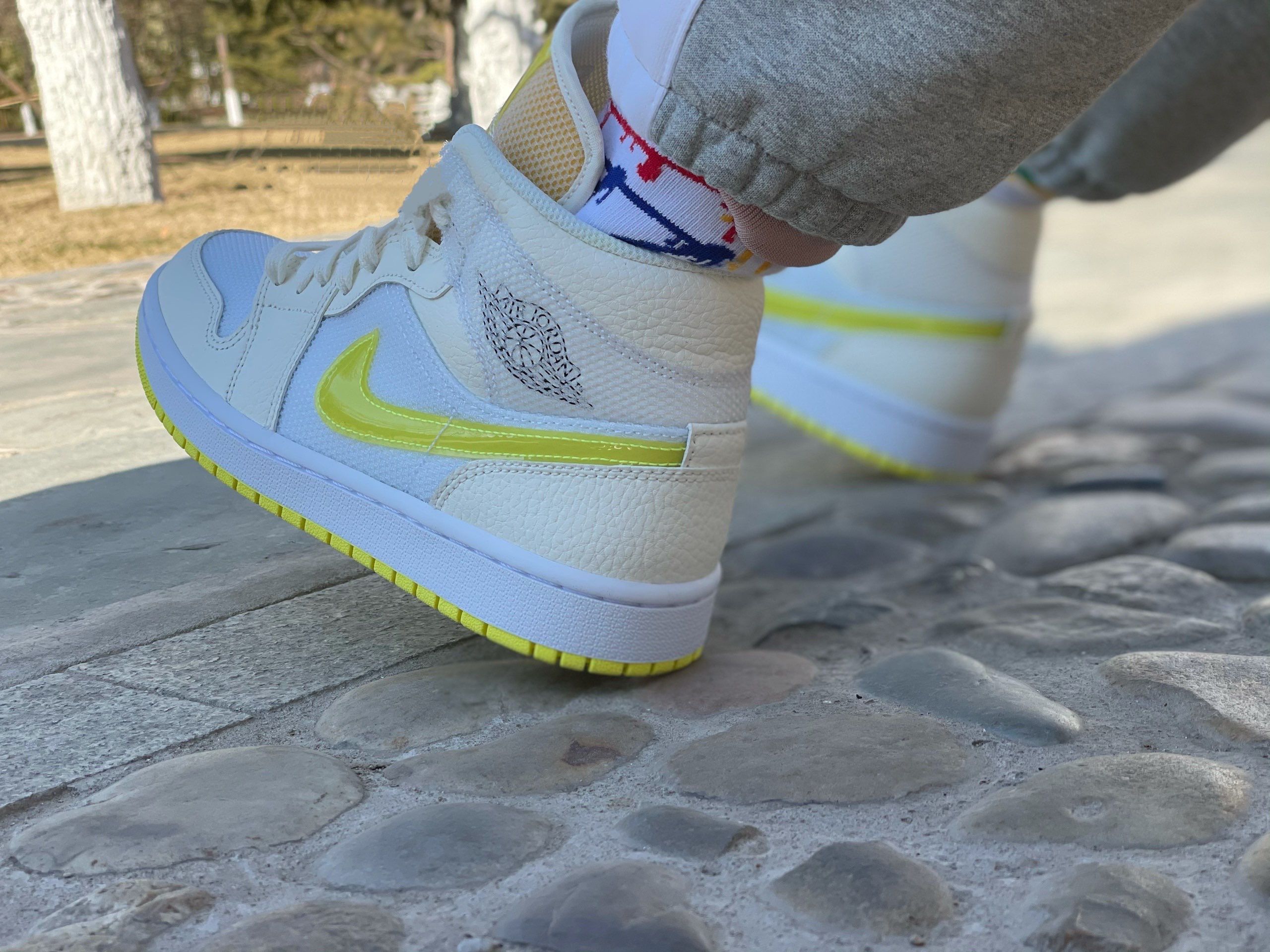 帽子 undefeated#UNDEFEATED 外套 bape#A BATHING APE 内搭 stussy x nike#Stussy 裤子 nike#Nike 鞋 aj1 mid#Jordan 这双mid的配色太适合女生了!鞋身的swoosh和鞋舌的是透明橡胶材质的 荧光黄色的大底超级醒目 鞋身是皮革和网面结合的材质 整体非常小清新 价格也非常美好