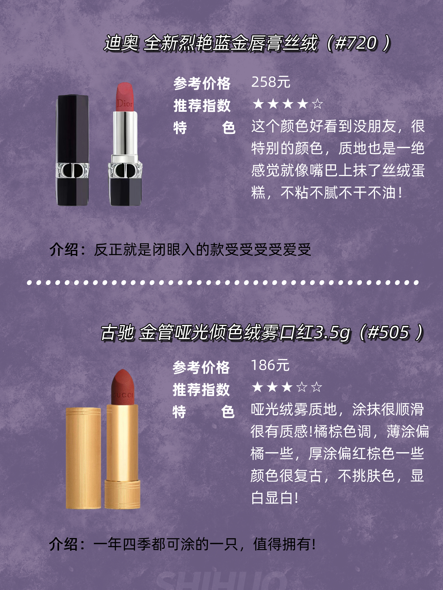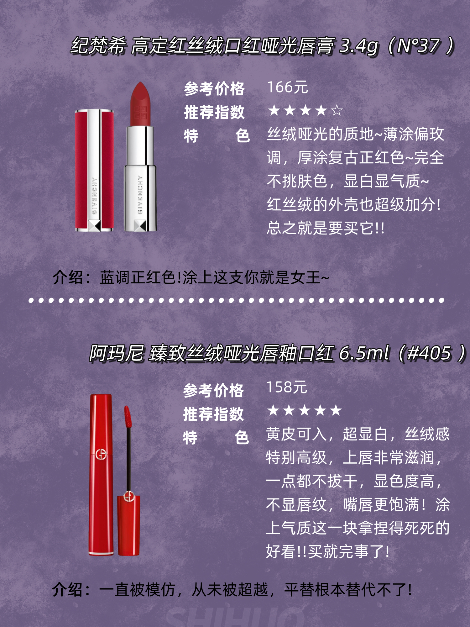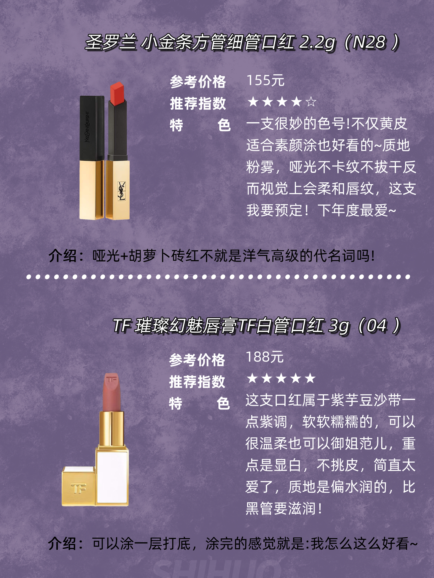 本篇笔记关联了YSL/圣罗兰 小金条细管哑光口红 显白丝绒 2.2g 28高阶胡萝卜、GIORGIO ARMANI/阿玛尼 红管系列臻致唇釉 柔雾丝绒哑光显白雾面 6.5ml 405番茄红SULTAN、Gucci/古驰 竖纹金管倾色绒雾口红 哑光雾面丝绒 3.5g 505复古珍妮特等商品,为用户提供真实的使用体验和购买参考。