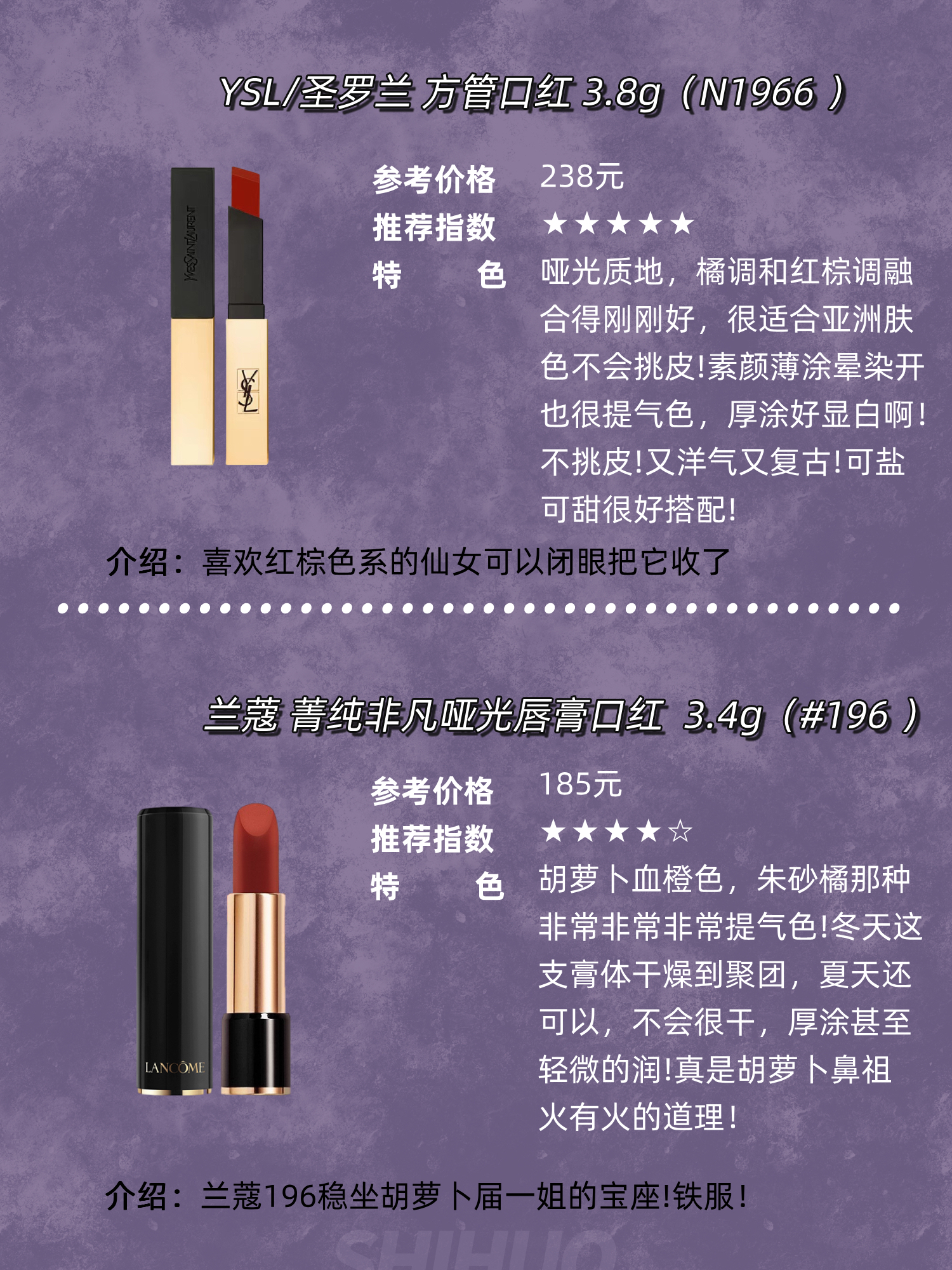 ❤️520买上到来,肯定有很多小哥哥又头疼了,在想该送什么给女朋友,尤其是想送口红不知道选哪种颜色哪个色号,520神仙口红色号推荐!!这不来了嘛 ❤️我站在女生角度上,列出了一些我比较想收到的口红牌子及色号,小哥哥们不用发愁啦,这几只口红绝对赢得女朋友的喜欢哈哈哈,一起来看! 💎YSL/圣罗兰 方管口红 3.8g(N1966 ) 新品!YSL太会了!小金条版1966美哭! YSL1966暖...