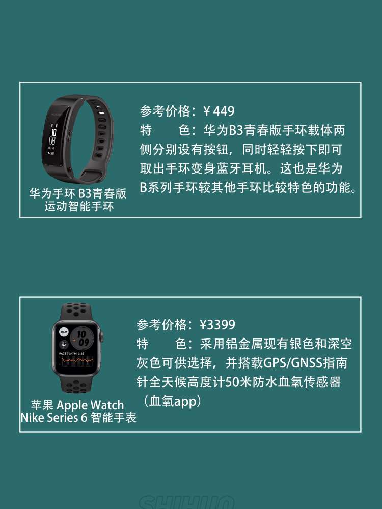 ❶小米/MI 小米手环6 售价:222元 特色:心率监测离线支付睡眠监测50米防水心率预警零星小睡支付宝游泳可佩戴30种运动模式6种运动模式自动识别磁吸式充电14天超长续航轻触即可充电长续航模式可使用19天1.56”跑道全面屏🌪️🌪️ ❷华为手环 B3青春版 运动智能手环 售价:449 特色:B3青春版手环的左、右侧。右侧为手环主体的唯一物理按键,切换屏显信息以及接听拒接电话、搜索蓝牙等功能都可...