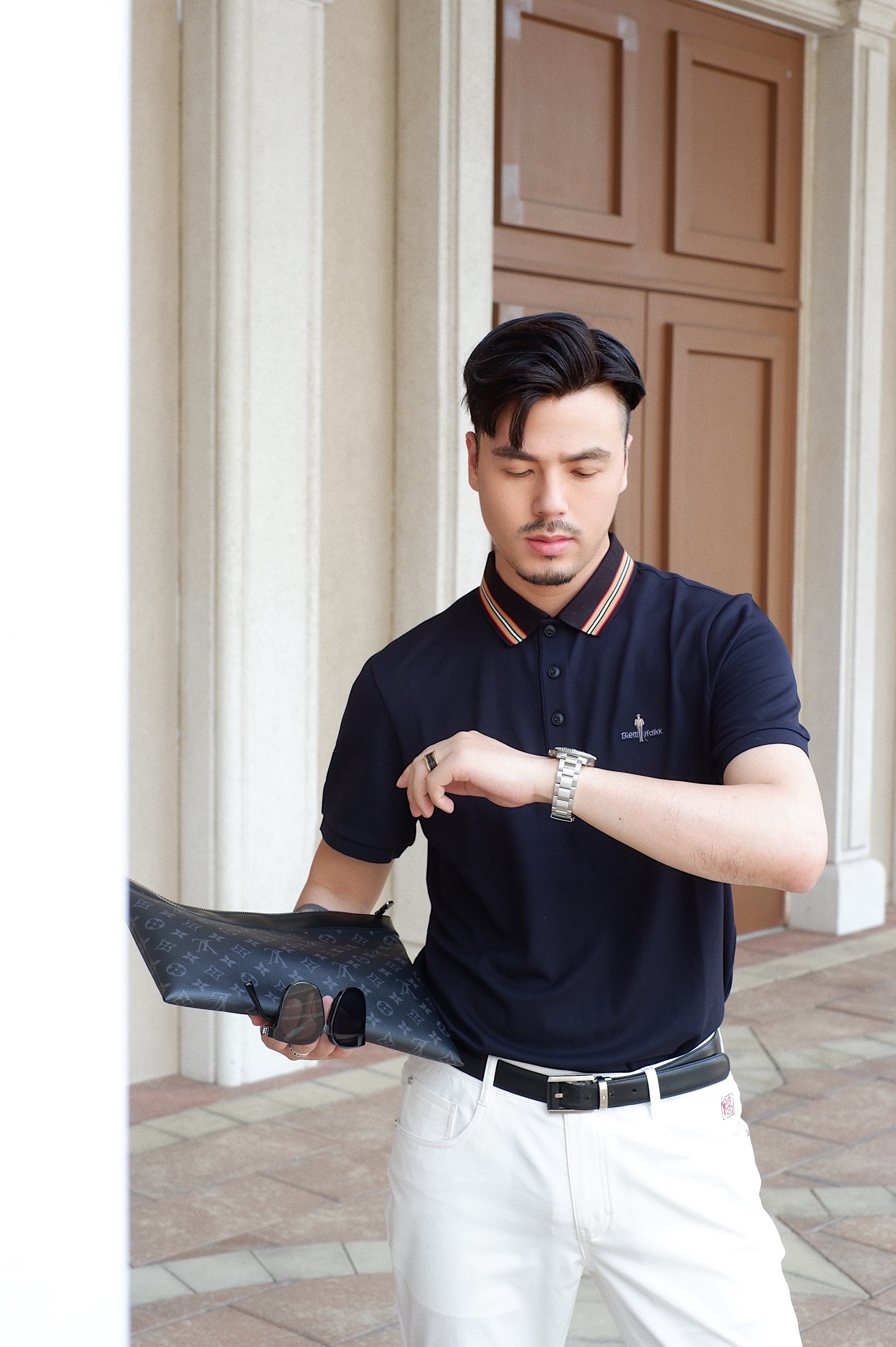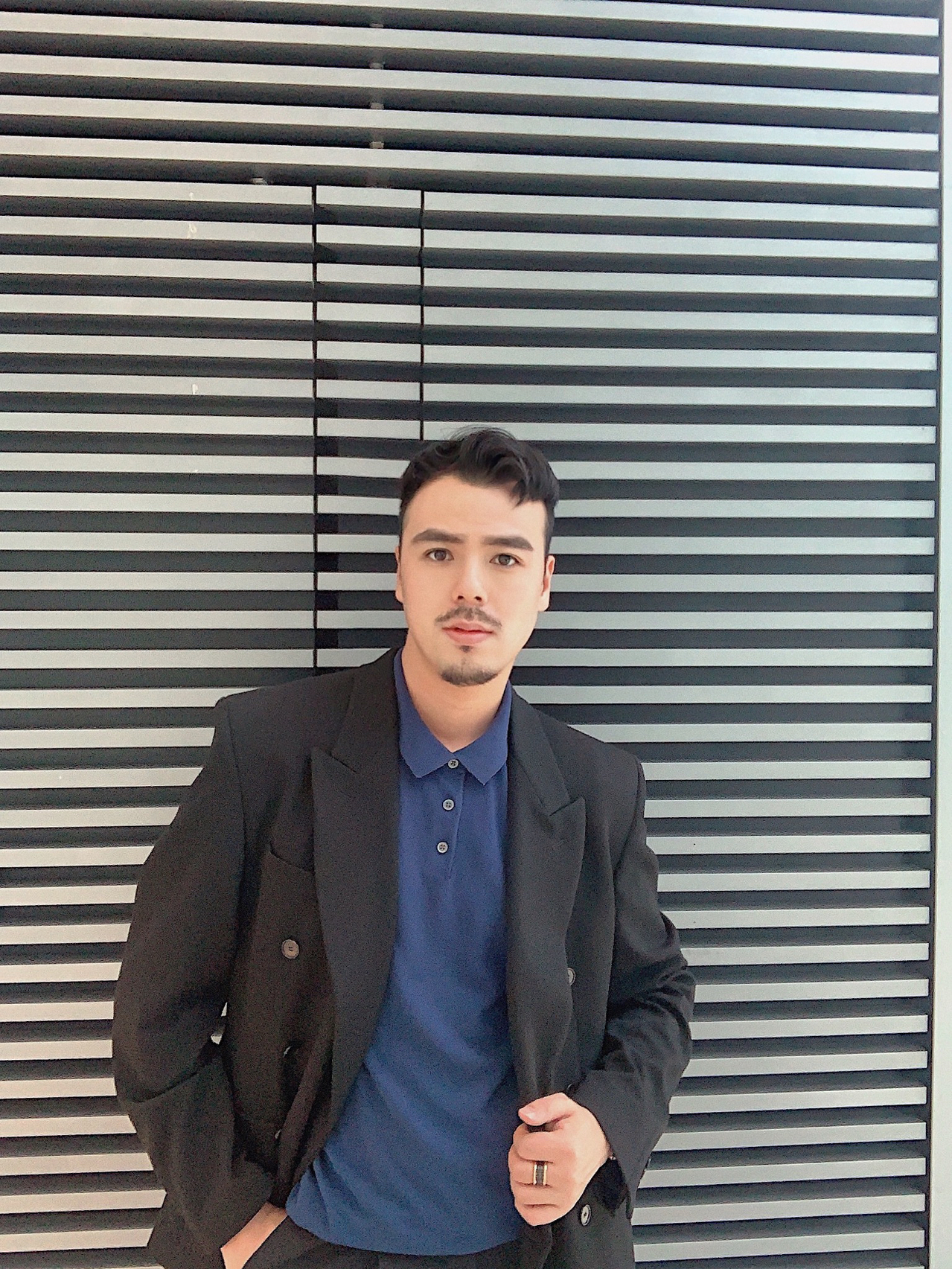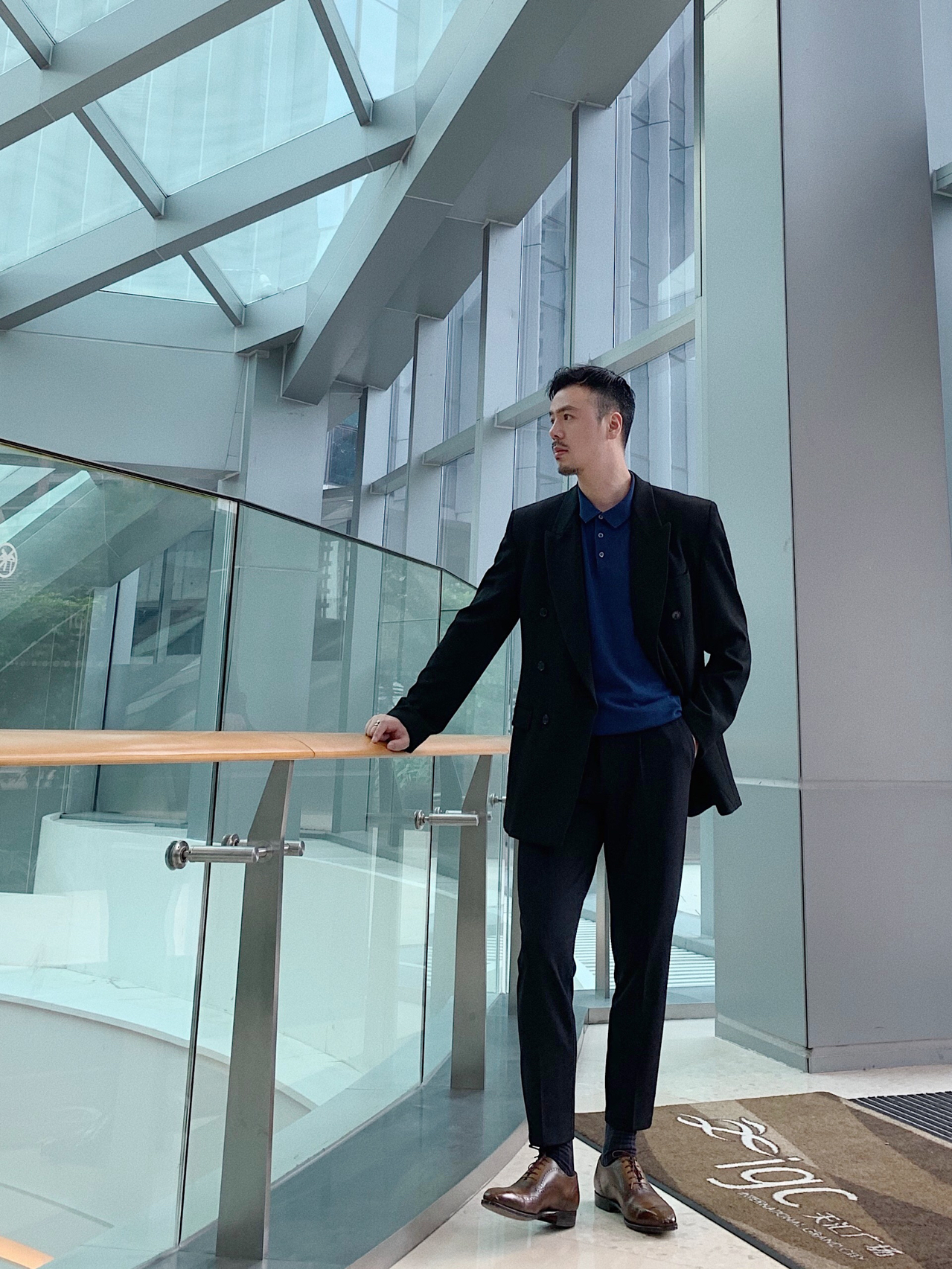 平日周末我也会选择比较休闲的商务范穿搭,这款黑色大西装较休闲风,敞开式双排扣西装外搭让整体着装看起来不那么呆板!九分西裤也很显腿长,内搭宝蓝色polo短袖让整体黑色有了点睛之笔!再➕一双棕色布洛克风手工定制皮鞋,有了走路带风的感觉!