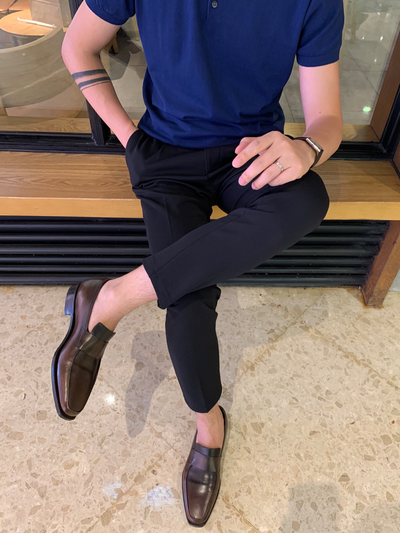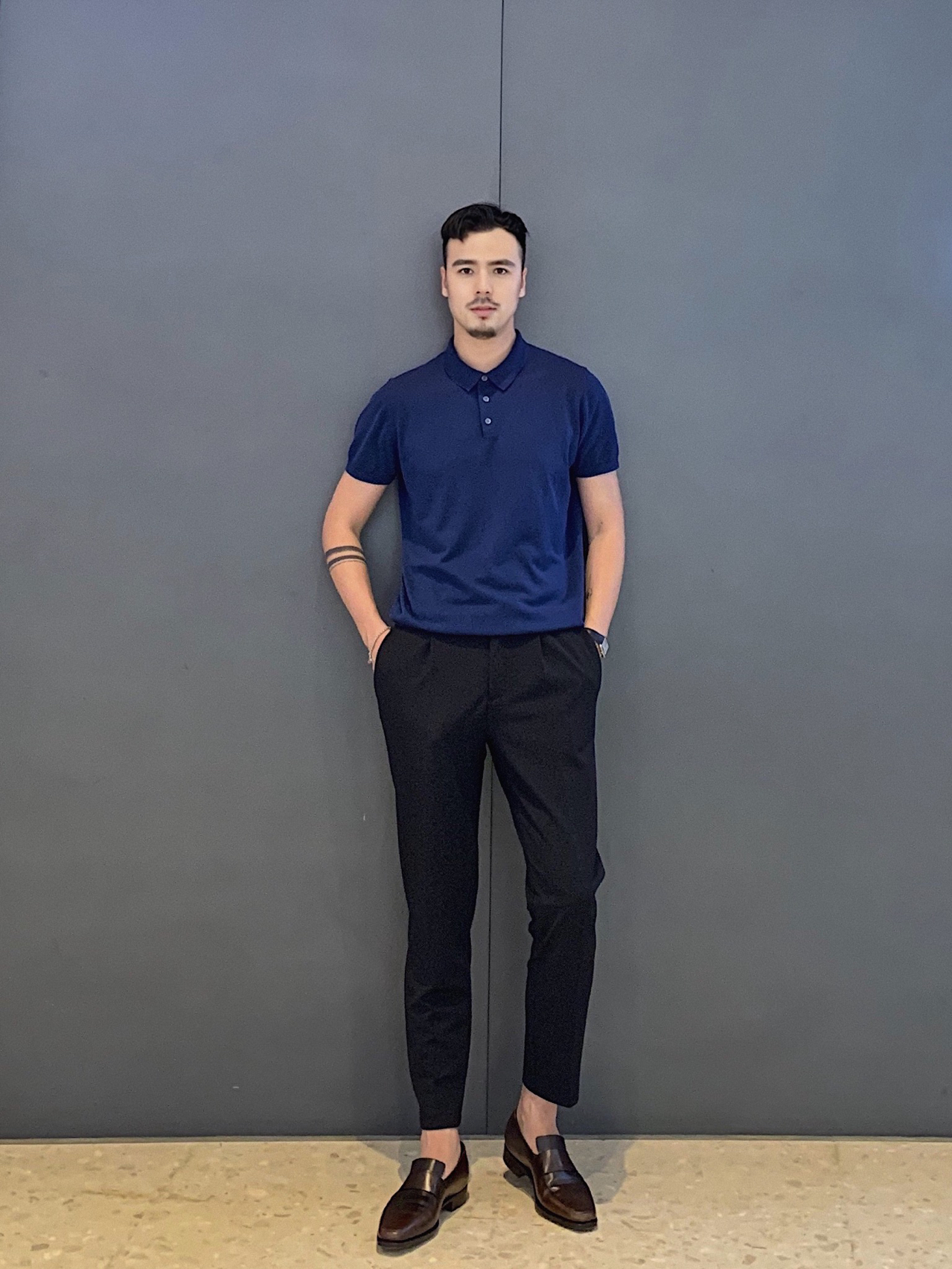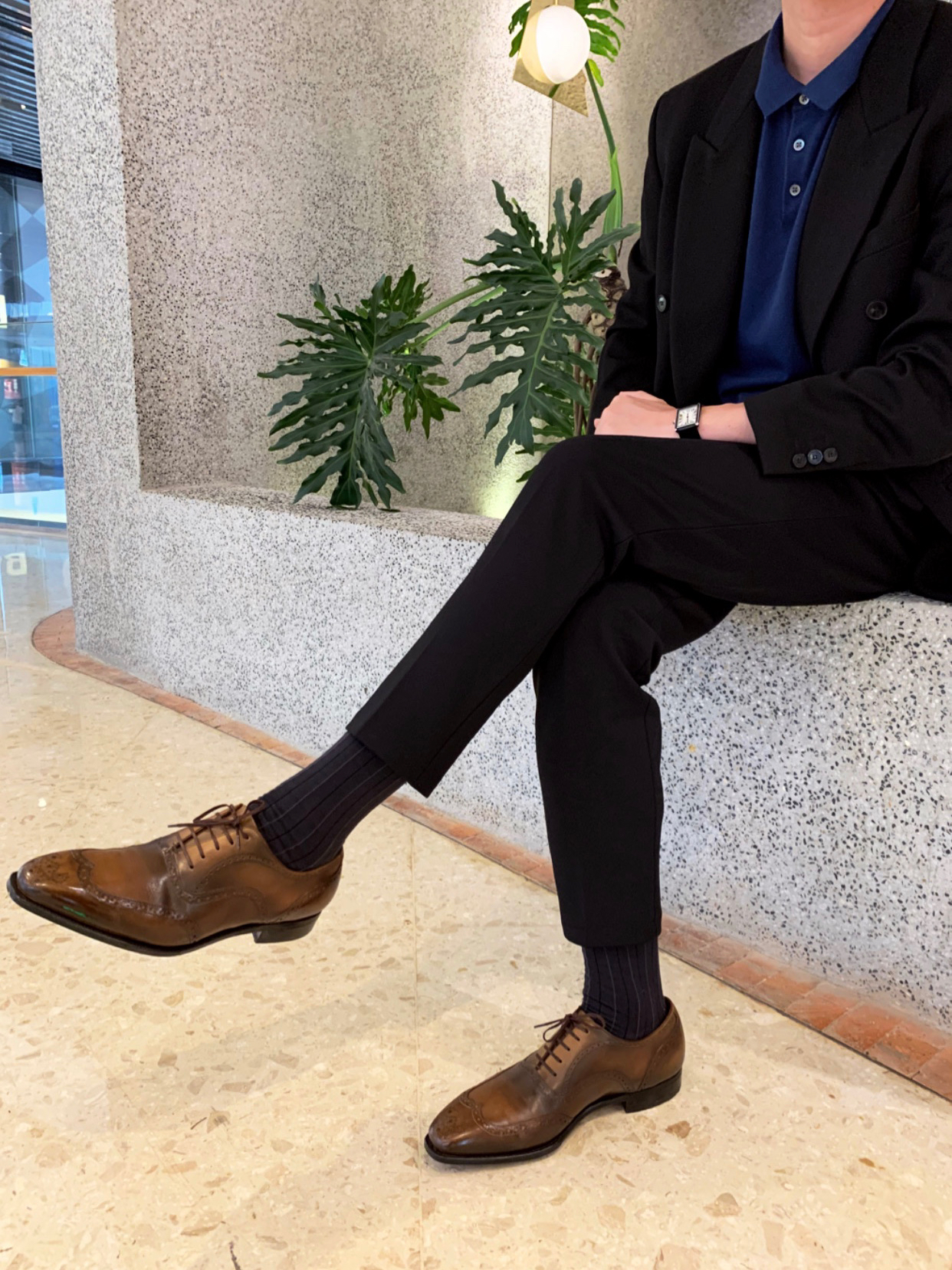 黑色大西装➕黑色九分西裤➕宝蓝色polo针织短袖➕棕色绑带布洛克风皮鞋