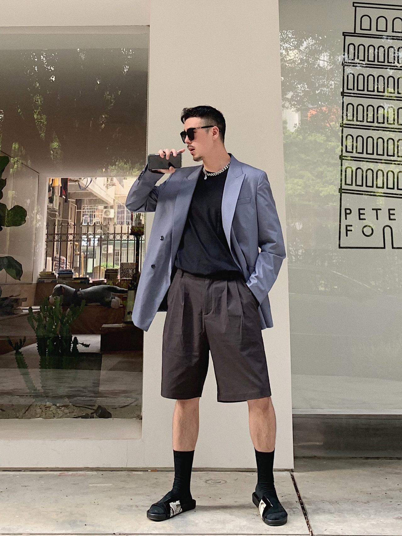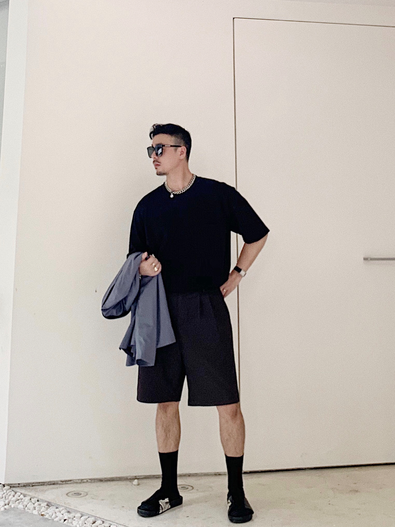 雾霾蓝大西装➕黑色短Tee➕黑色阔腿短裤➕多材质拼皮拖鞋➕黑色长袜