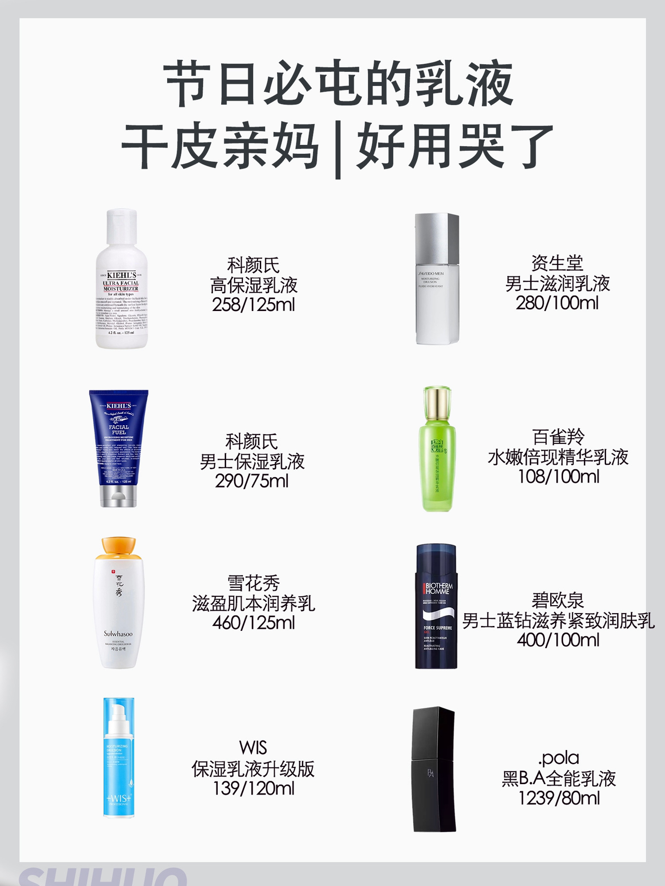 1😀 雪花秀 滋盈肌本润养乳 官方旗舰店售价:460/125ml 推荐指数:⭐ ⭐ ⭐ ⭐ 内含百花百合鳞茎、地黄根、莲花等多种植物提取物,有补水保湿、美白祛斑、调理肌肤的效果。 2😀 百雀羚 水嫩倍现精华乳液 官方旗舰店售价:108/100ml 推荐指数:⭐ ⭐ ⭐ ⭐ 益母草、忍冬花、草景天,3重草本精华,补充肌肤水分,让肌肤喝饱水。 3😀 科颜氏 高保湿乳液 官方旗舰店售价:258/1...