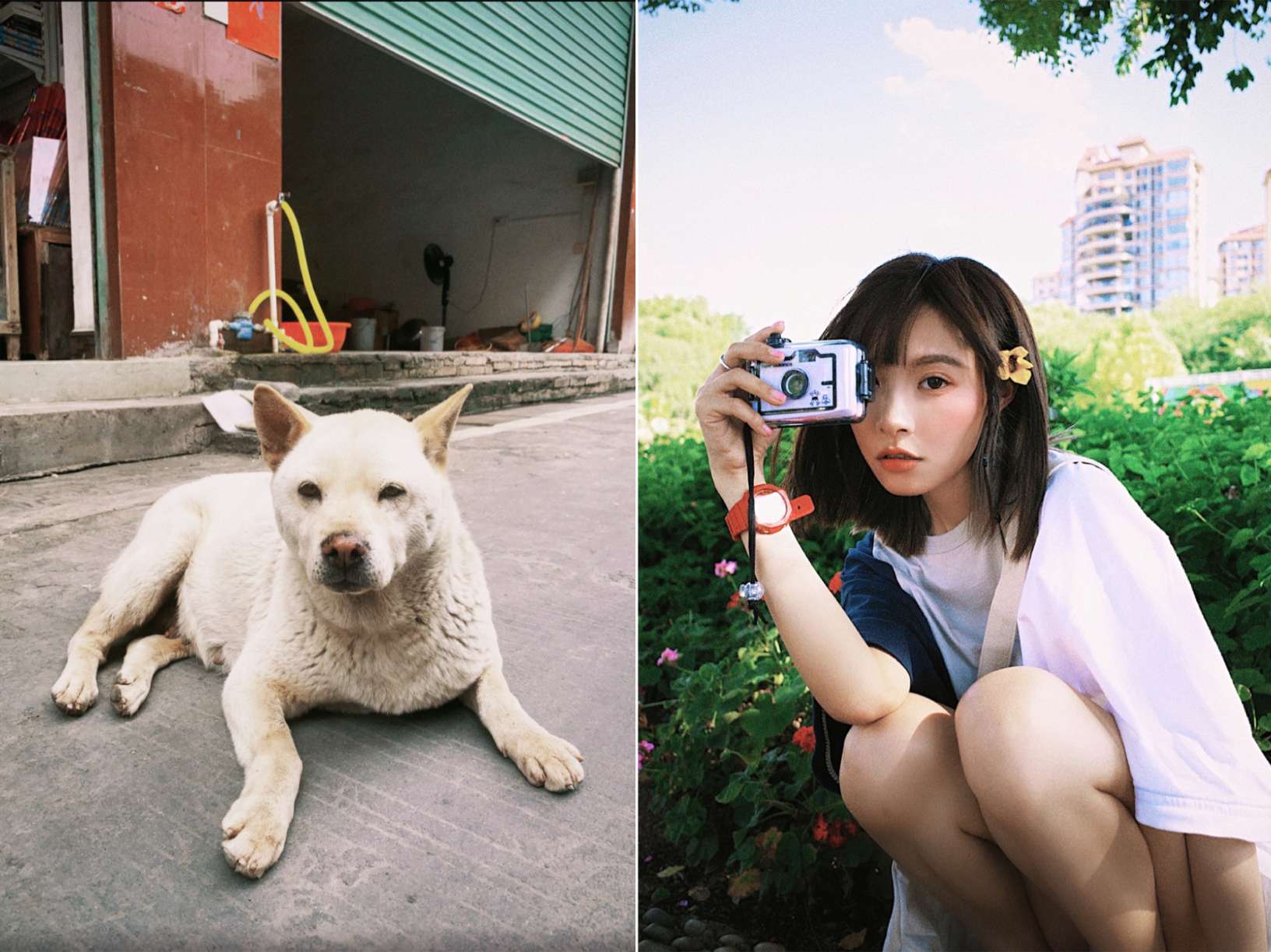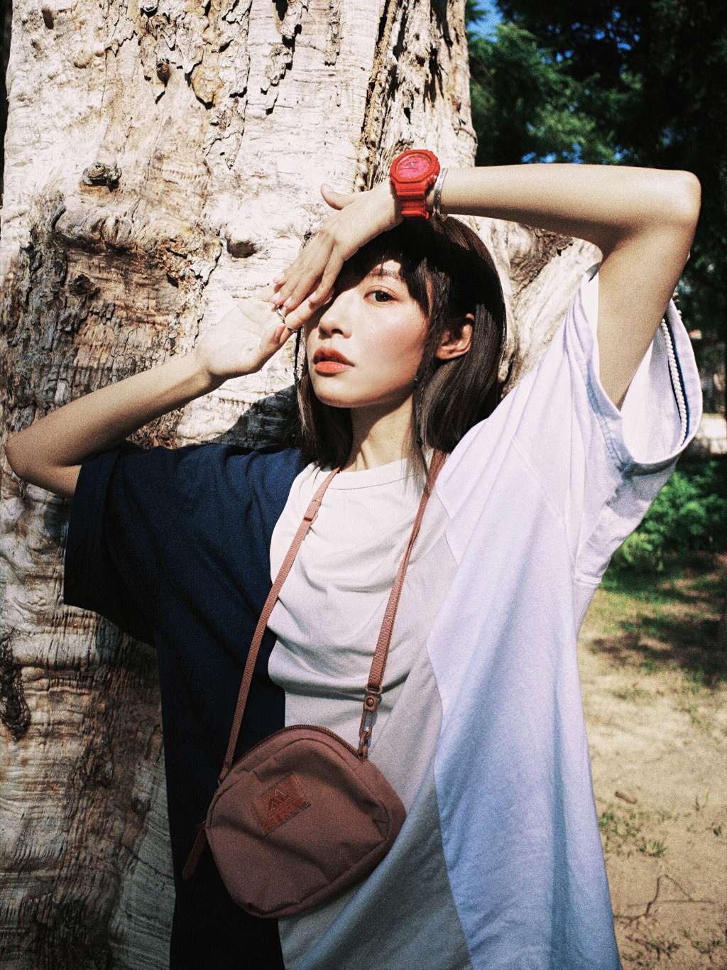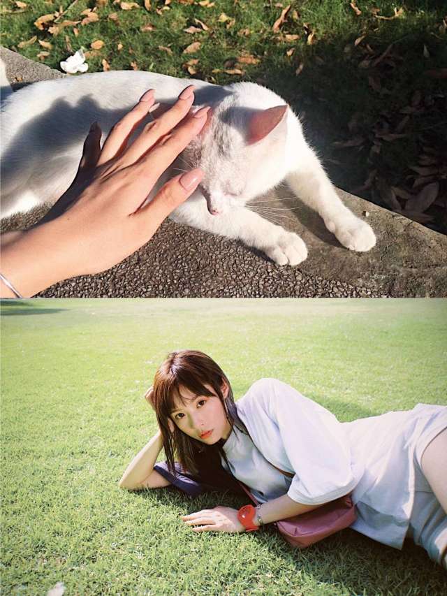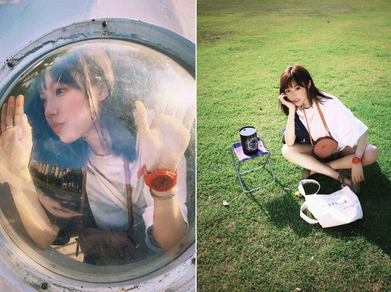 嘟嘟嘟 赶上末班车 带上的小相机和好心情 来get Noritake同款拍照动作咯! 扫街最好玩的就是总能遇到可爱的猫猫狗狗 最有趣的是他们也很会配合拍照 嘻嘻 今天穿的这件小众3色撞色短袖 emmm….应该目前没人同款吧! 亚麻面料的短袖 所以我会选一个帆布包和凉鞋来做搭配 红色lover’s code手表做点缀 帆布包图案是我自己动手画的哦!!!