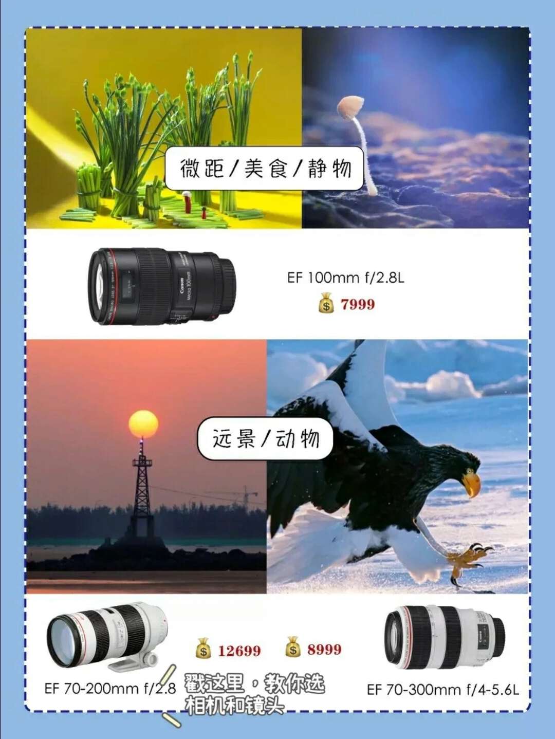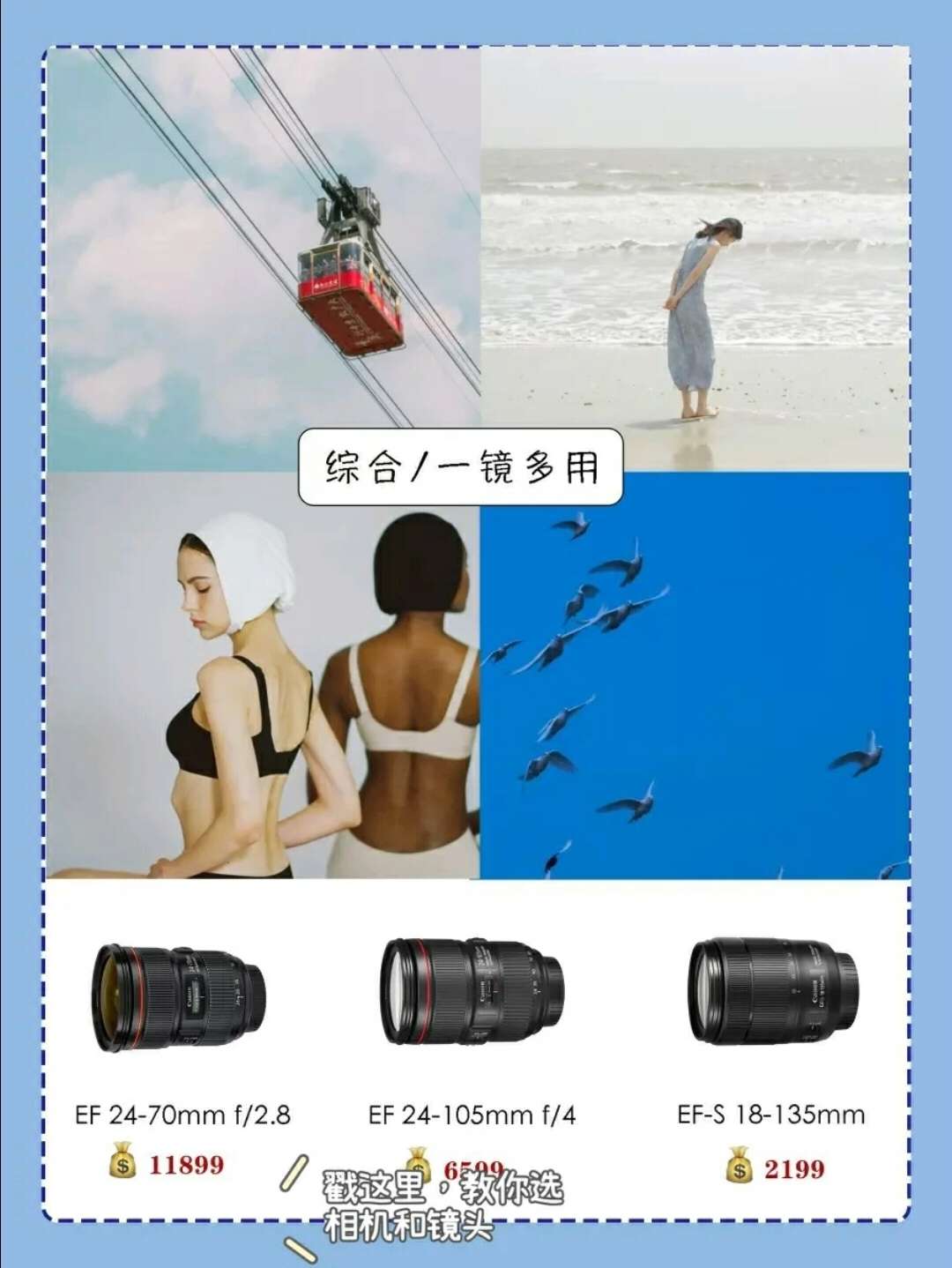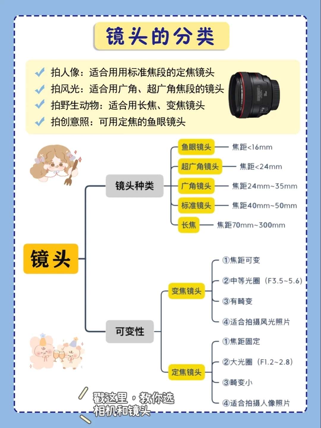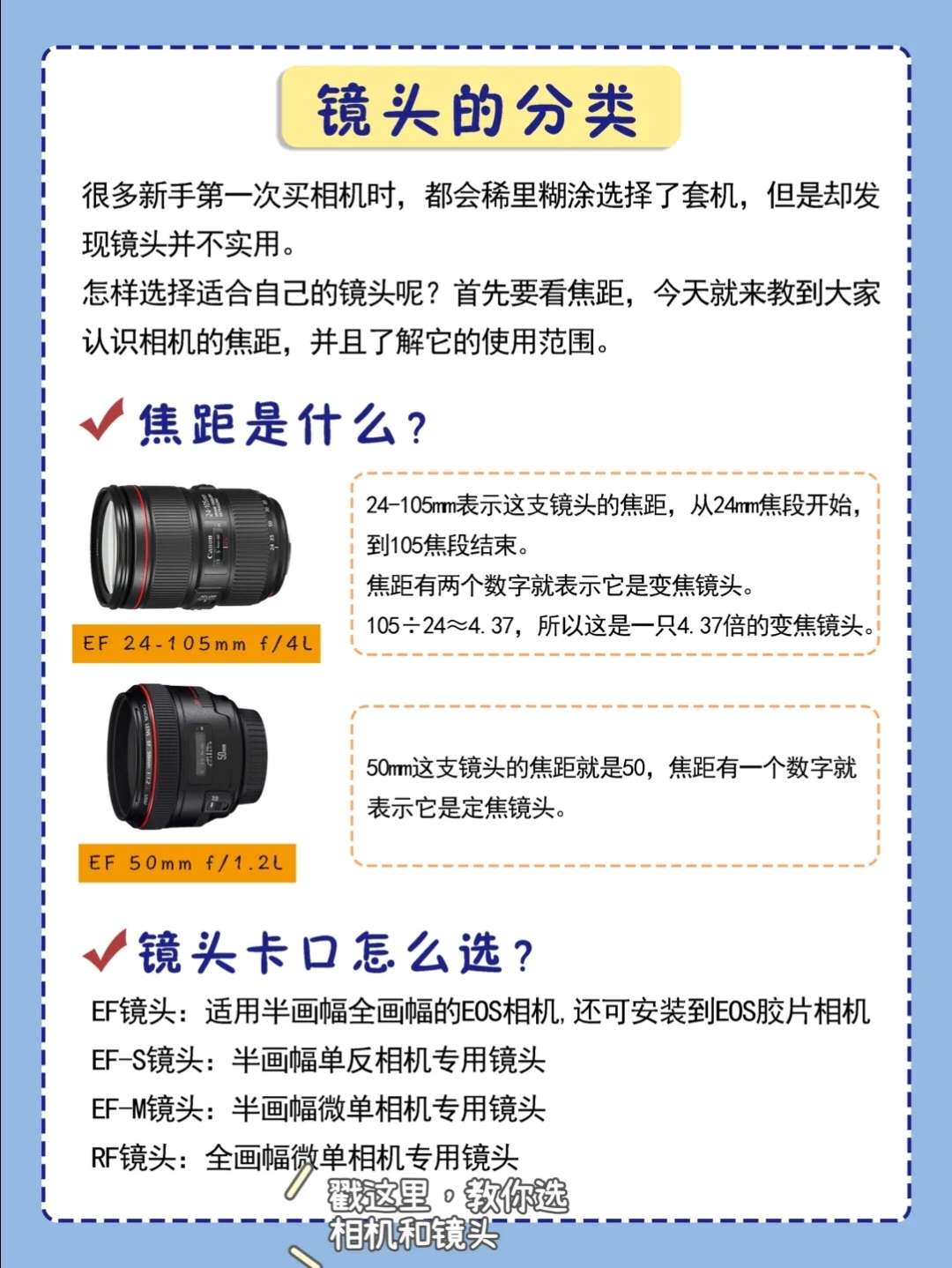 有的拍人物的话,用钉胶比较好,如果拍视频的话,可以用变焦镜头,具体的我弟弟和你说吧! 2天前 单反镜头推荐💥新手第一只镜头怎么选❓ 关注 啾啾 46 38 11 🙈这几天总有小伙伴来问我,单反微单相机镜头型应该怎么选? 大多数人第一次入手相机时都会选择套机镜头,但往往套机镜头的性价比都是很低的💥 用什么样的镜头,主要取决于你拍什么,所以今天啾啾就来和大家聊聊,相机镜头到底怎么选‼️ . ⭐️镜...