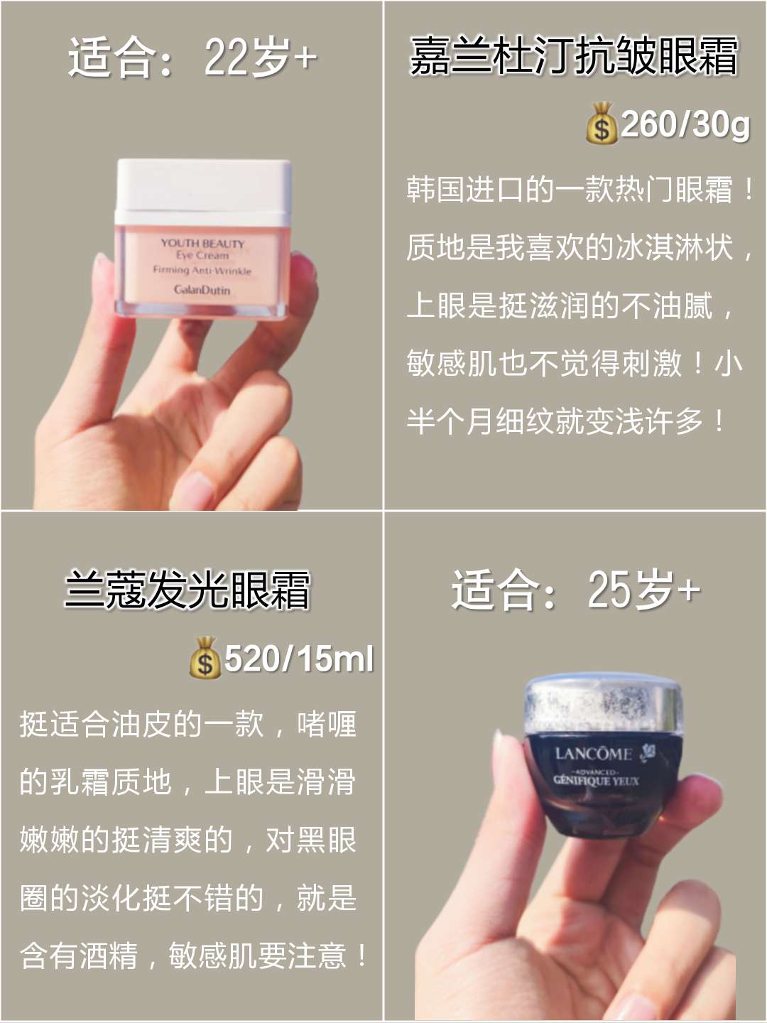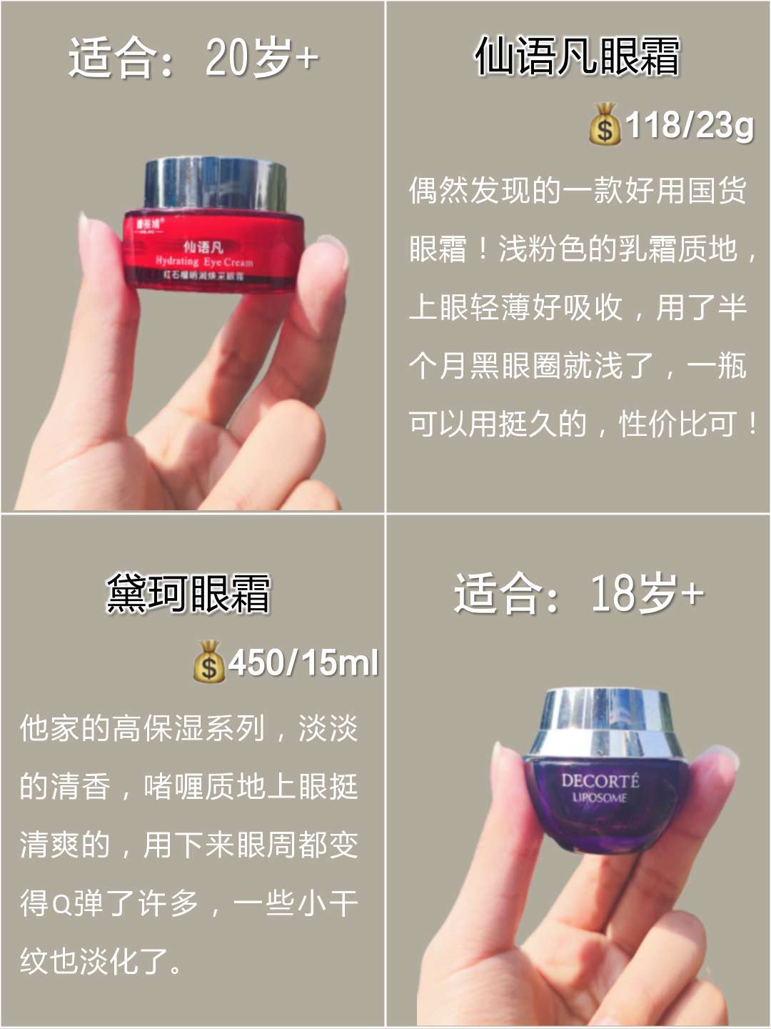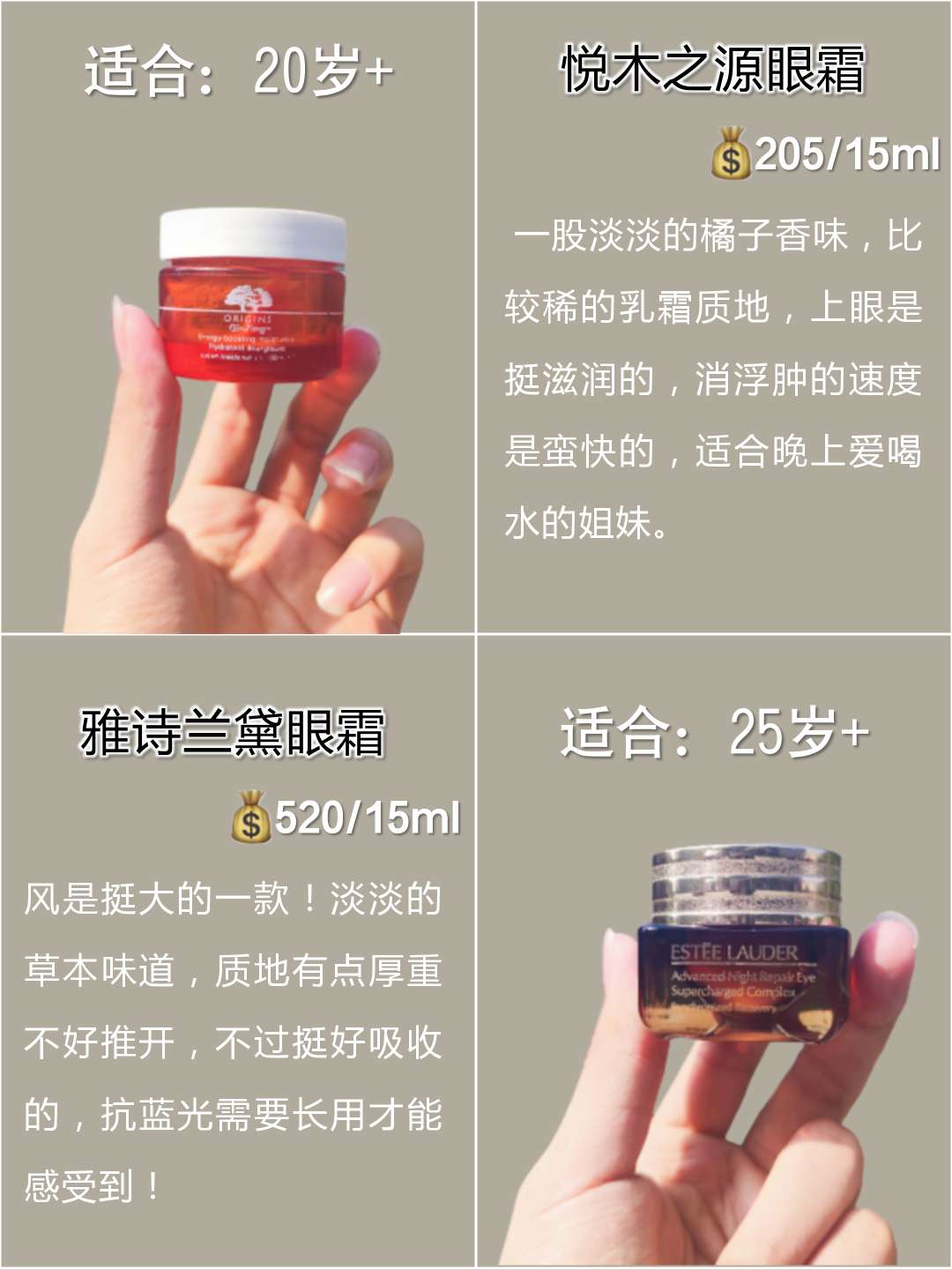 本篇笔记关联了Estee lauder/雅诗兰黛 小棕瓶熬夜眼霜 保湿抗皱淡化黑眼圈紧致提亮特润 第四代、悦木之源 人参活力焕亮眼霜 焕亮眼周、黛珂 保湿赋活眼霜 正装等商品,为用户提供真实的使用体验和购买参考。