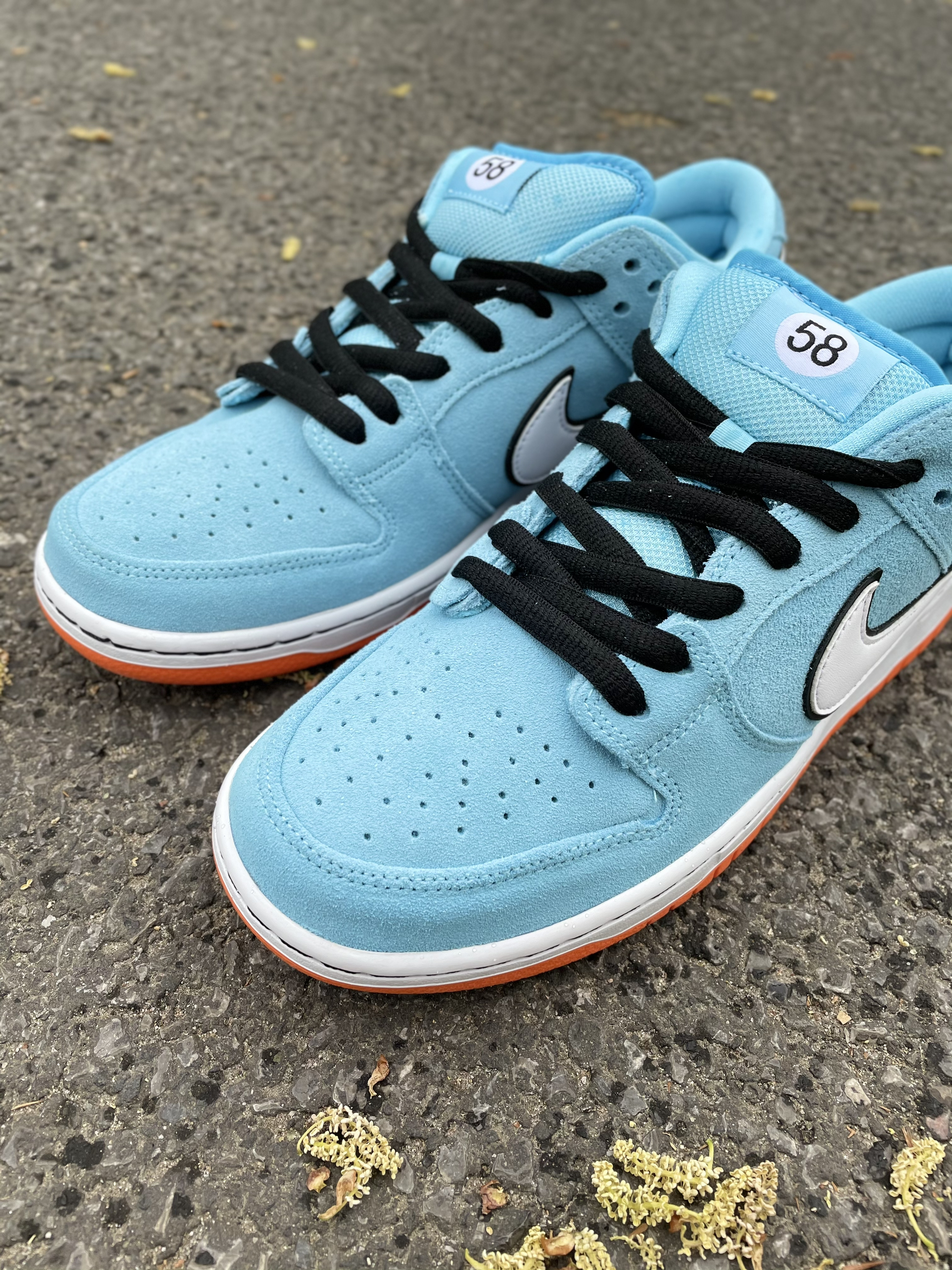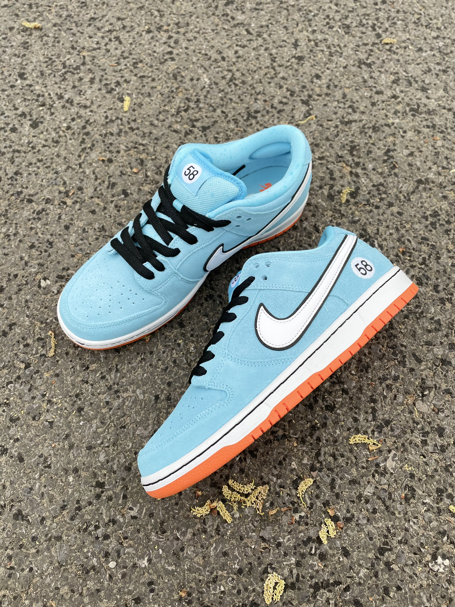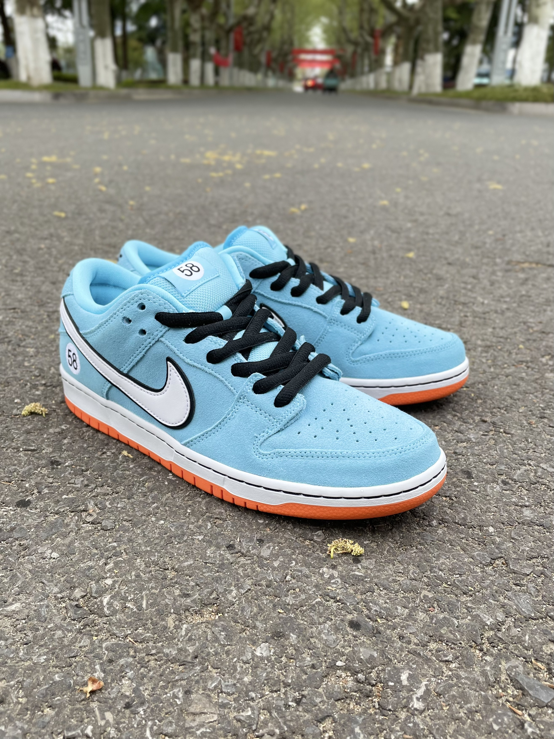 设计灵感来源于,保时捷917海湾石油涂装(图三),配色很相似完美还原,搭配的很好看,非常好看的配色,少见的有赛车主题元素。 ——鞋身一览😇 采用海天蓝色调,让人眼前一亮。搭配白色Swoosh以及黑色细节点缀外加橙色底部,也是体现了经典复古气质。麂皮与皮革材质塑造也是DunkSB球鞋的标配。后跟处“58”号数字则致敬18年的SB Blazer Mid“Club 58”。 ——码数情况 DUNKSB ...