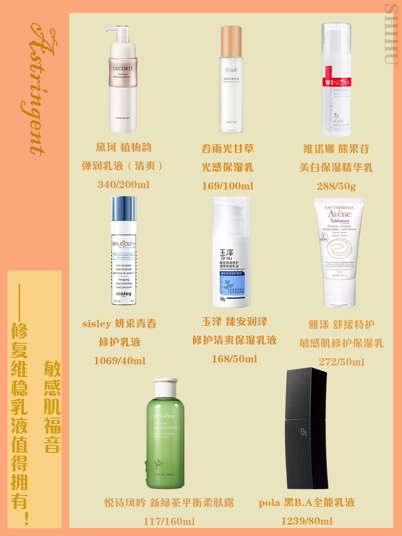 1😀 sisley 妍采青春修护乳液 官方旗舰店售价:1069/40ml 推荐指数:⭐ ⭐ ⭐ ⭐ ⭐ 内含有豌豆精粹和大豆胜肽精萃等抗氧化成分可以有效抵抗外界环境的侵害,能够提高肌肤的保湿能力,减缓肌肤衰老速度。 2😀 谷雨 光甘草光感保湿乳 官方旗舰店售价:169/100ml 推荐指数:⭐ ⭐ ⭐ ⭐ ⭐️ 核心成分有光甘草根提取物、甘草酸二钾、牛油果树果脂、透明质酸钠,有强韧屏障、提炼肤色...
