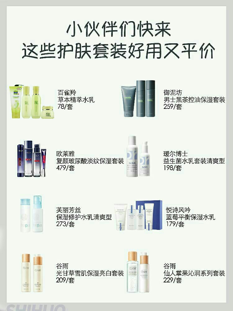 推荐几款好用又不贵的护肤套装,有需要的集美看看嘻嘻 💛百雀羚 草本精萃水乳 价格:78/套 推荐:4⭐️ 不是很油,很湿润,晚上涂明早不干,质地手感挺细腻的,吸收效果还可以 草本护肤产品 💛欧莱雅 复颜玻尿酸淡纹保湿护肤套装 售价:479/套 推荐:3⭐️ 保湿补水效果不错的,干皮和偏干性肌肤可以入手 主打玻尿酸美白,效果可以。乳液有点儿黏,后续上妆的话会搓泥 💛芙丽芳丝 保湿修护水乳护肤套...
