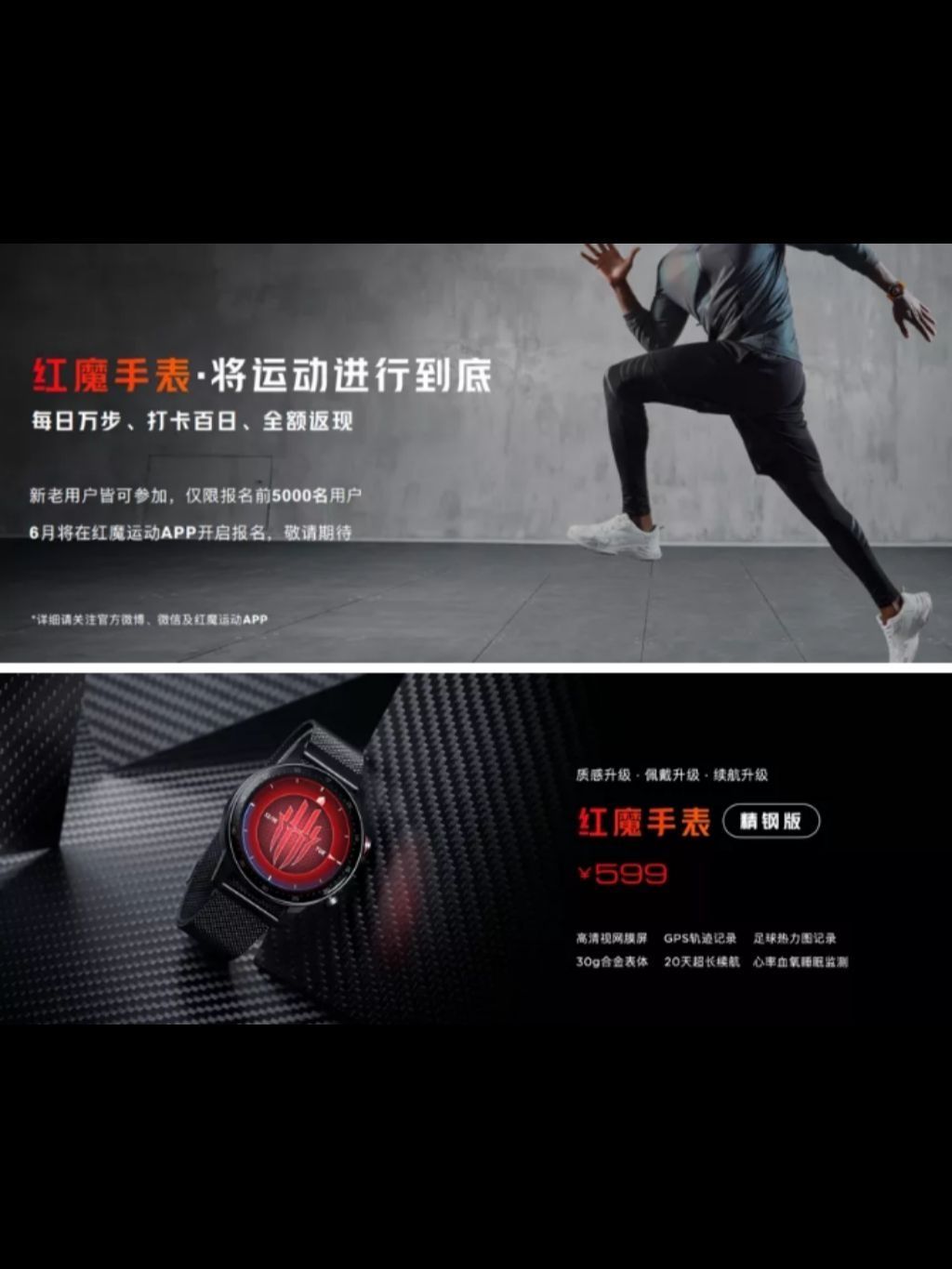 本次发布会上还有红魔手表精钢版亮相,其采用不锈钢材质,配备高清视网膜屏幕,裸重仅30g,佩戴更舒适,续航最长可达20天。功能方面,具备GPS轨迹记录、心率血氧睡眠监测,其售价为599,感兴趣的可以关注!😍