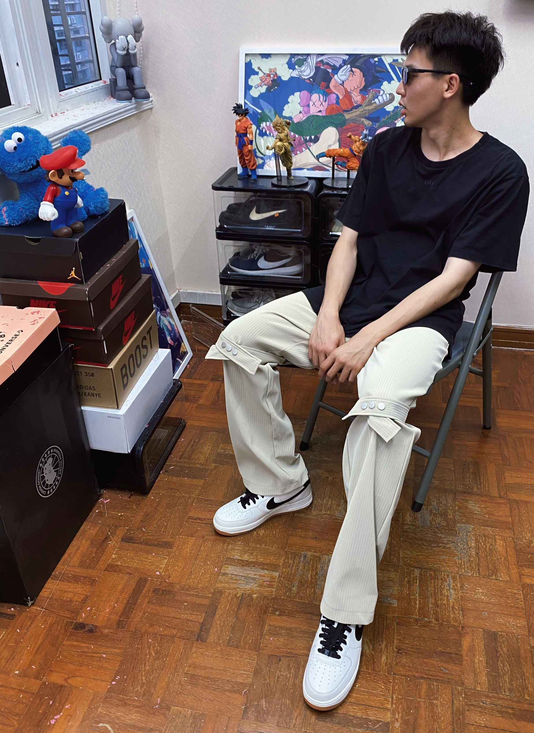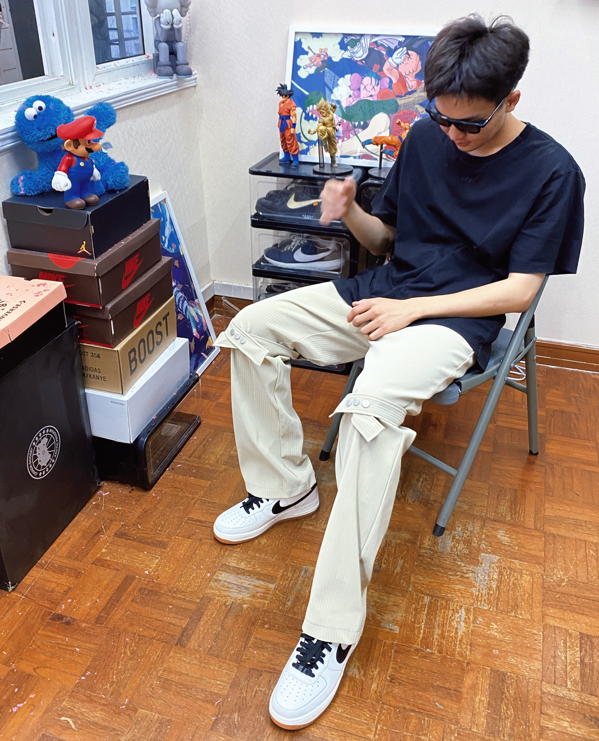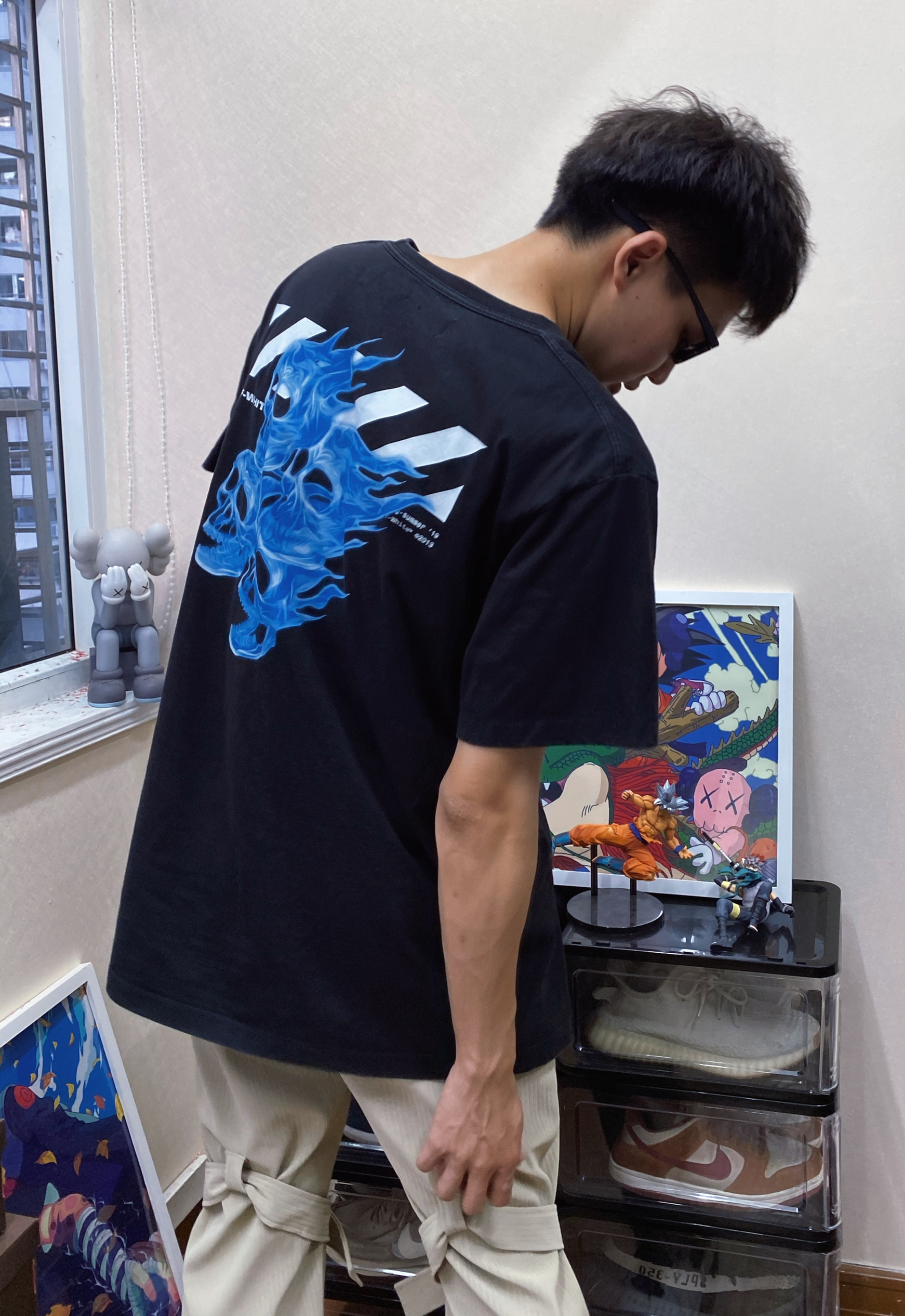 #球鞋穿搭 👔OW 超酷的Logo!版型偏大很显瘦! 质量一般!但是整体上身效果很酷! 👖TEAMGEEK 超酷的褶皱条纹裤子! 应该是PU皮!料子很高级! 夏天穿也没有很热! 上身很有型! 绑带的设计很完美!可以自己调节! 👟 AF1 自己定制的空军一号!很有意义!