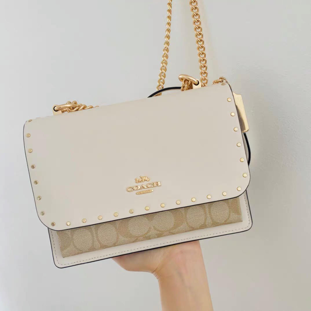 coach的经典印花+铆钉 五金精致 不辣手 适合淑女风和复古风 搭配日常通勤完全可以 西装搭配也可 蔻驰这款链条小包真的太好看了也太好搭了 在我的印象里我认为链条包只适合那种精致的穿可可爱爱的裙子小姐姐背才会合适!但是蔻驰这款链条小包真的绝了!平时穿的很随便背出来也完全OK的! 大家快冲!这个包真的啥风格都可以用! ! !我觉得可以!!!!! 大家可以冲一下哦