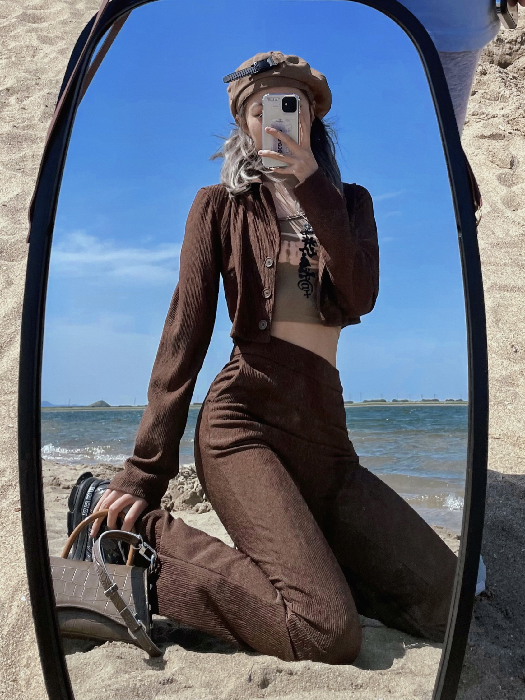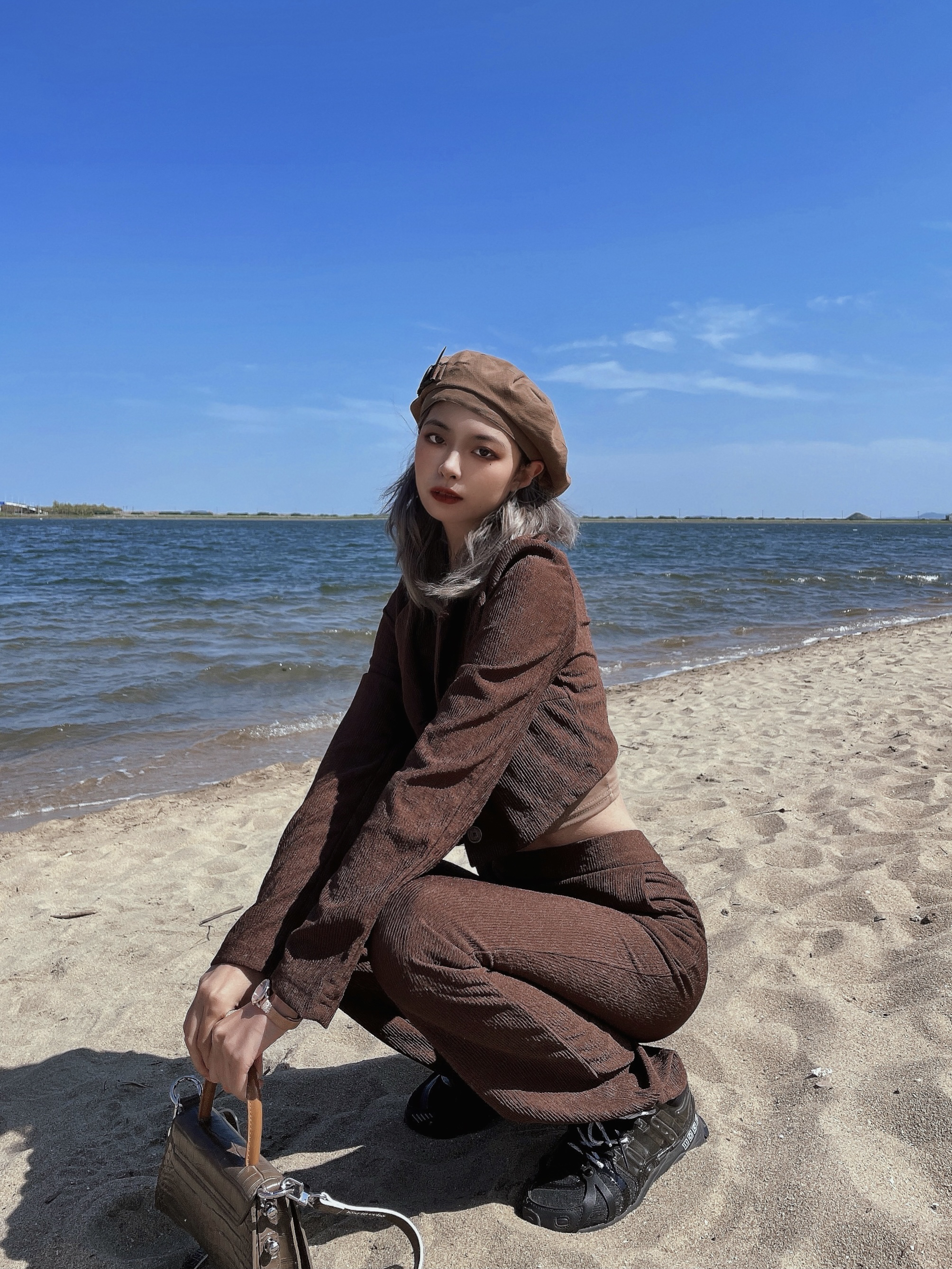 海边拍照可太出片啦!!这套辣妹套装我先爱住 卡其色和褐色谁穿谁辣 自带内味儿 一整套同色系 强迫症穿搭爱好者的福音😇 套装:HGOFFICIAL 贝雷帽: umamiism 潮流合伙人联名 好看好看好看 👜: lost in echo 👟: 李宁