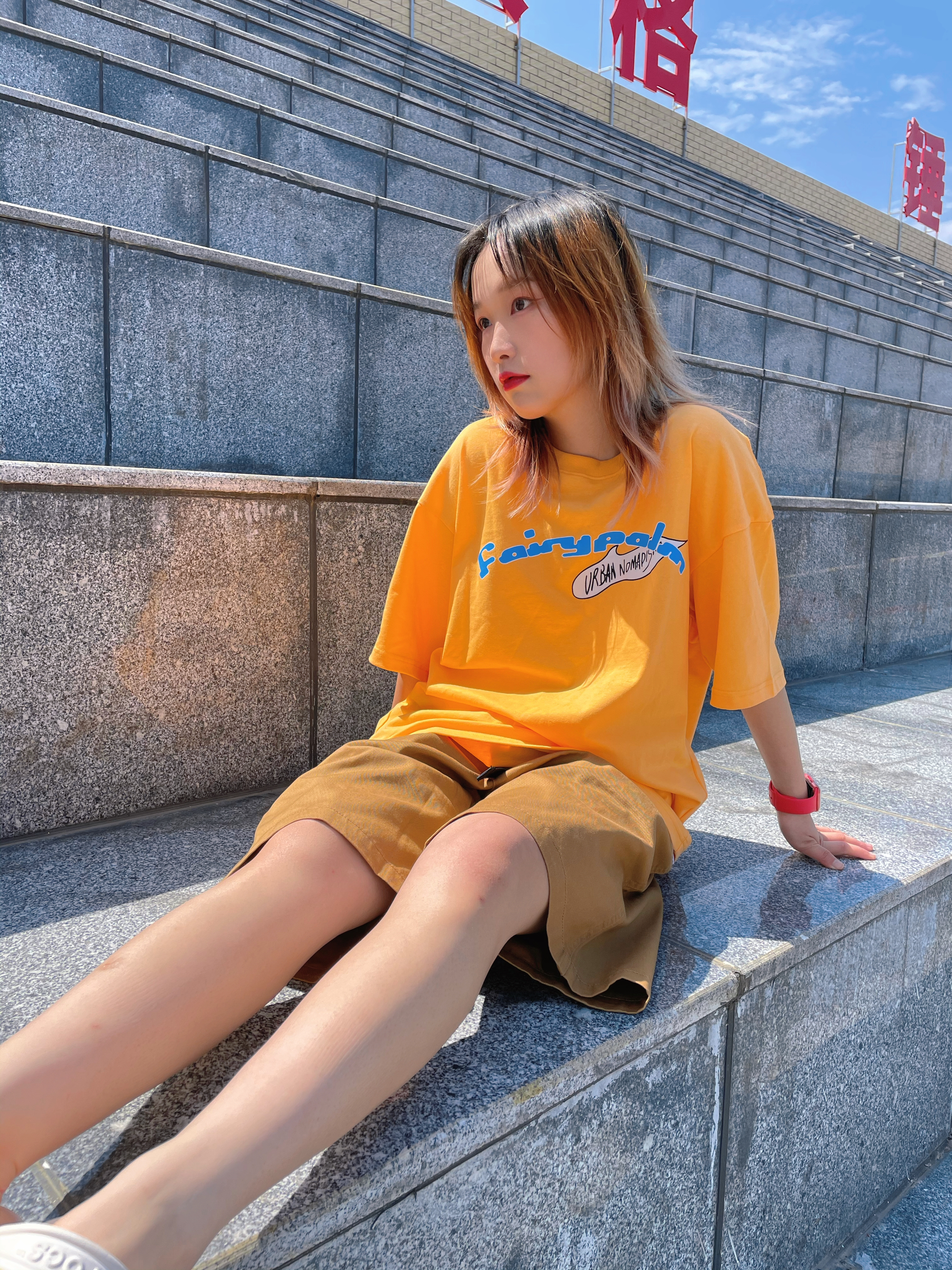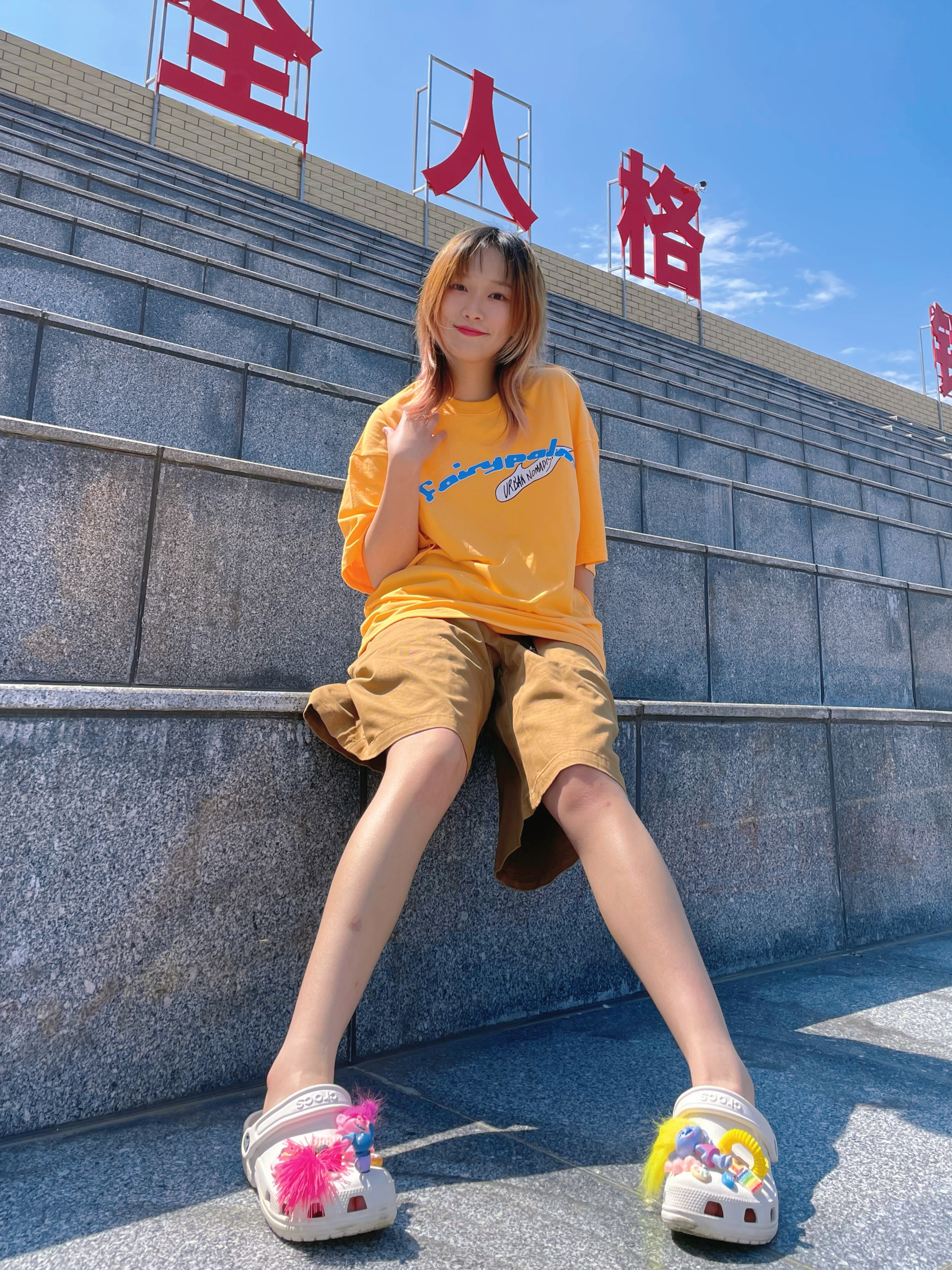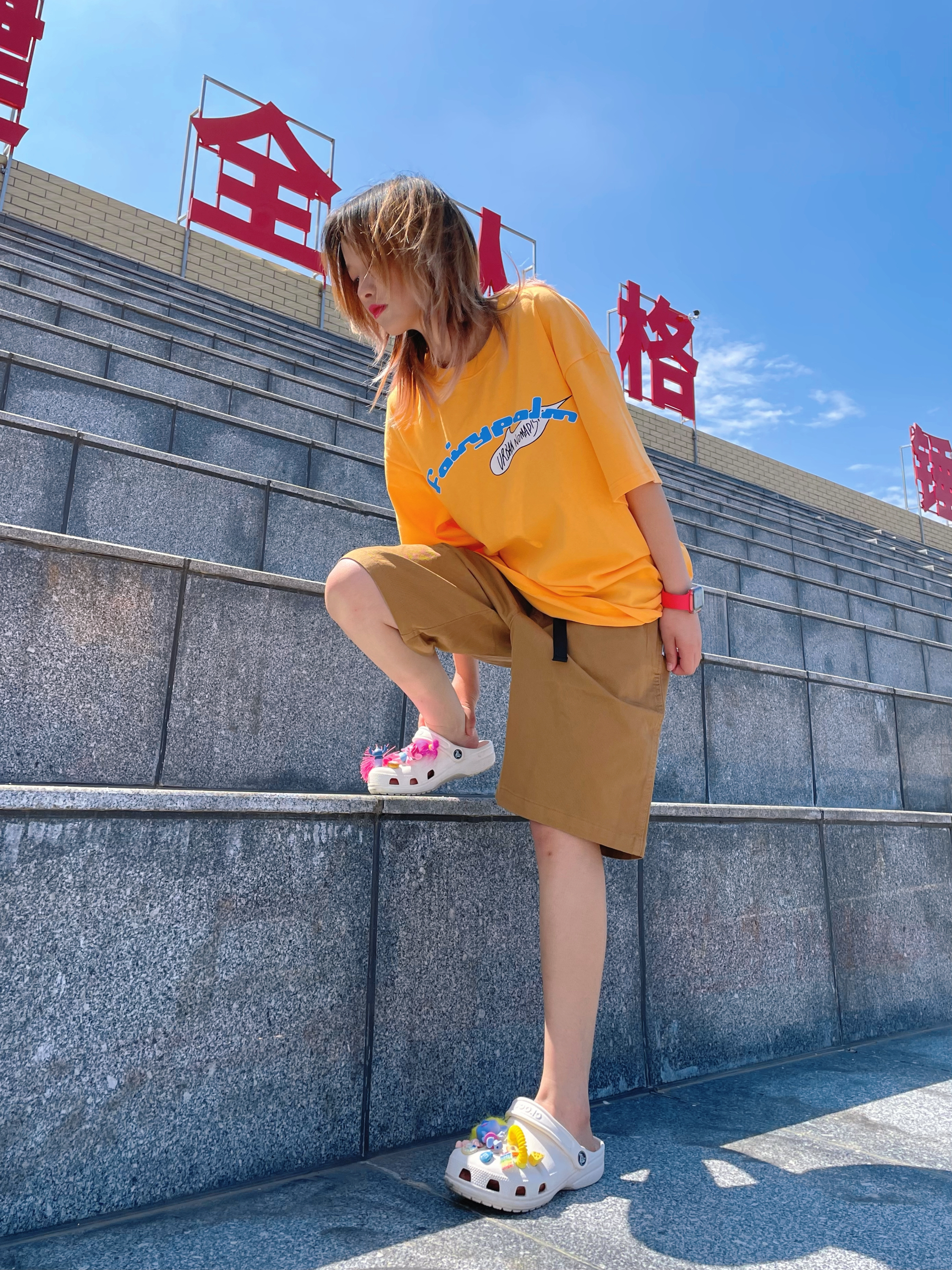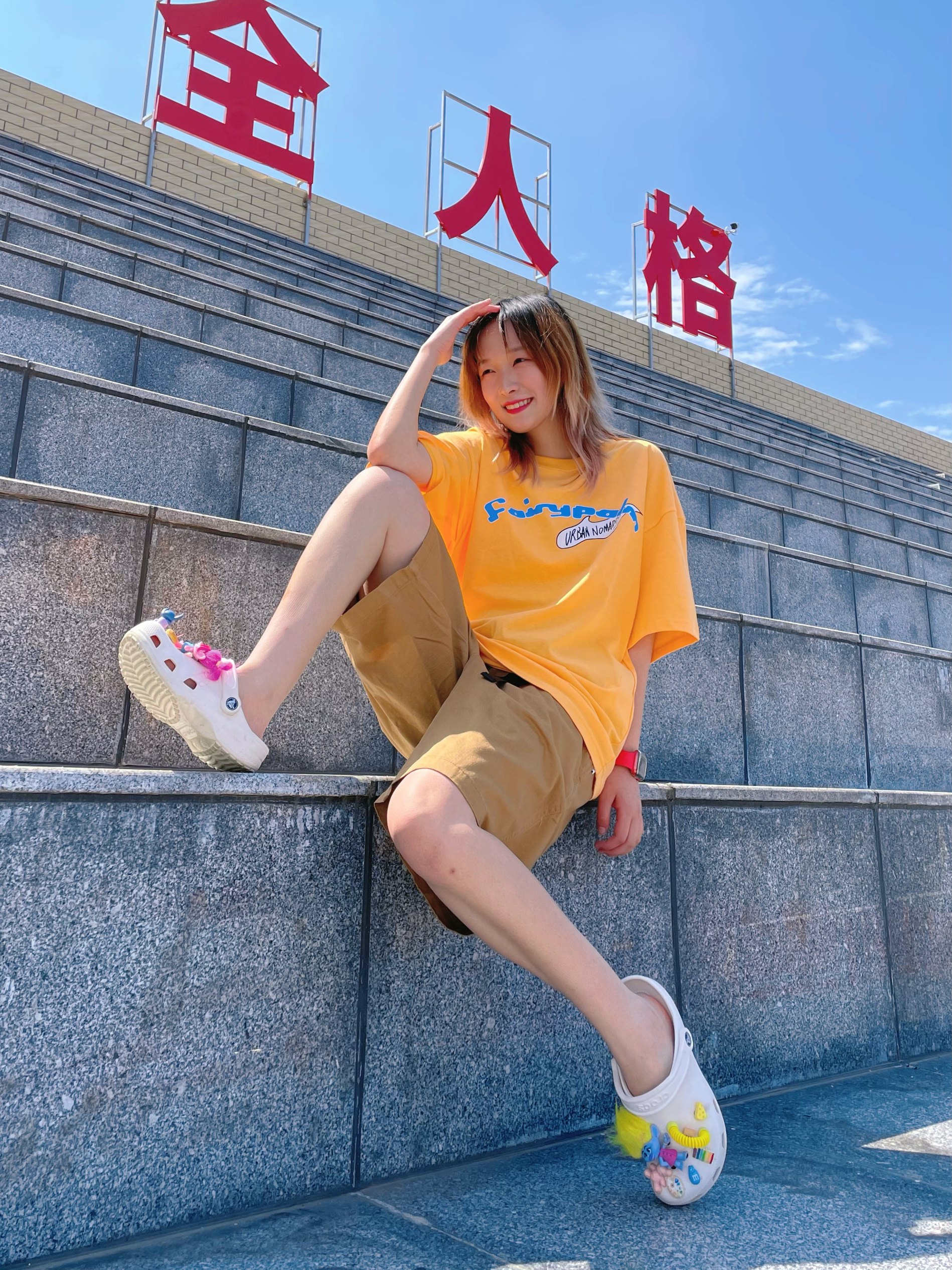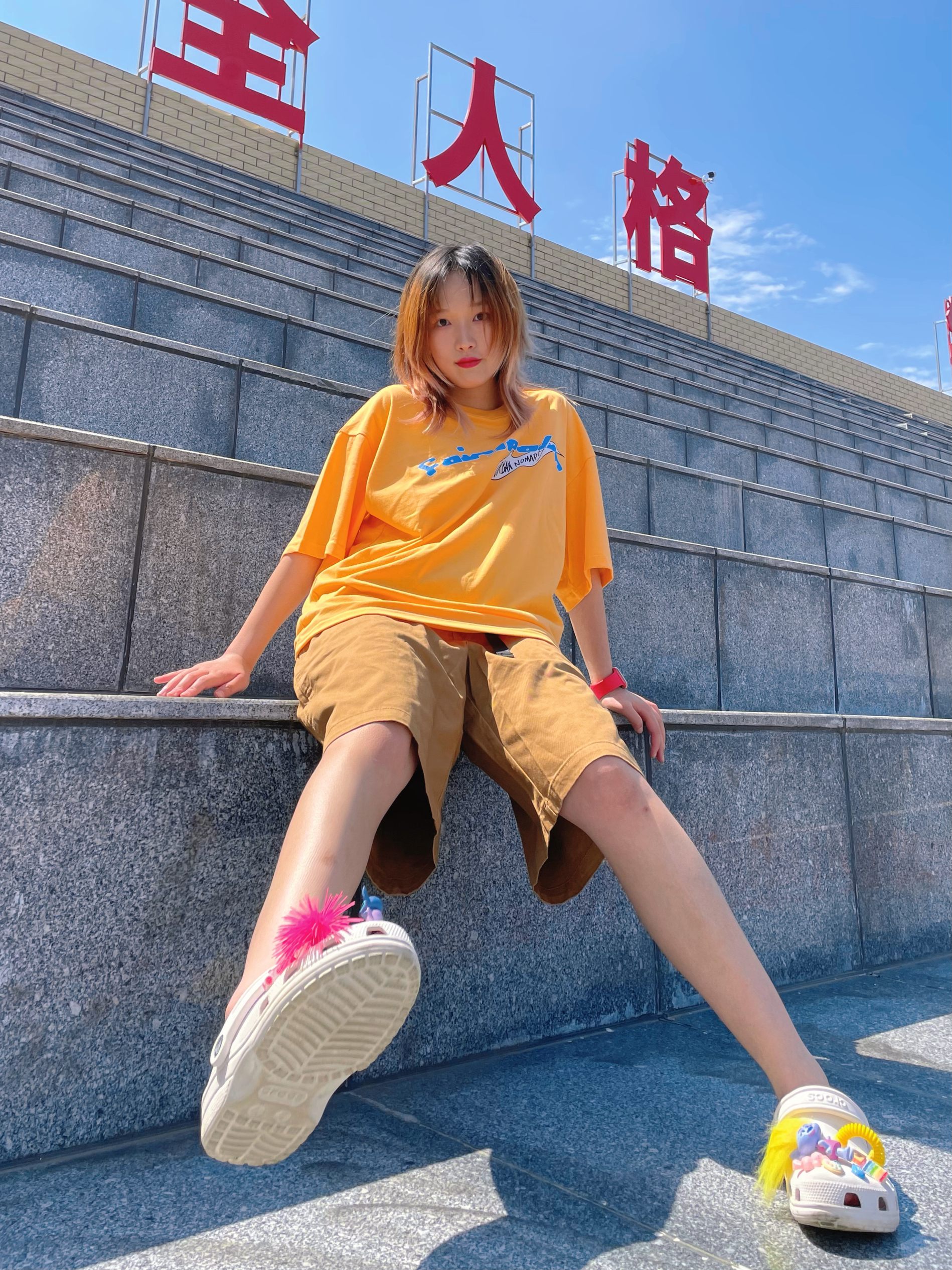 T恤:fyp 裤子:planning 拖鞋:crocs 橙色T恤非常亮眼!哈哈哈哈搭配焦糖色的休闲裤 像奶茶的颜色🥤 周末出去玩这样穿超舒服的哦~