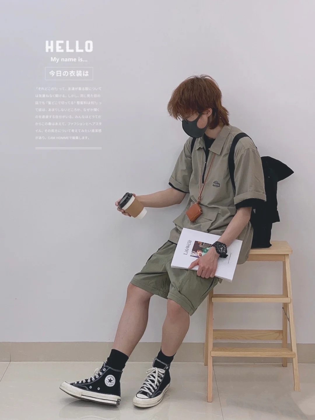 穿腻了黑白灰,也可以来尝试下简约质感的大地色系啦 一件轻薄透气的灰杏色短袖polo衫 一条宽松的军绿色大口袋工装裤 内搭一件黑色短袖作为颜色过渡和增加层次感选择一双经典的黑白帆布鞋,搭配黑袜子和内搭颜色呼应