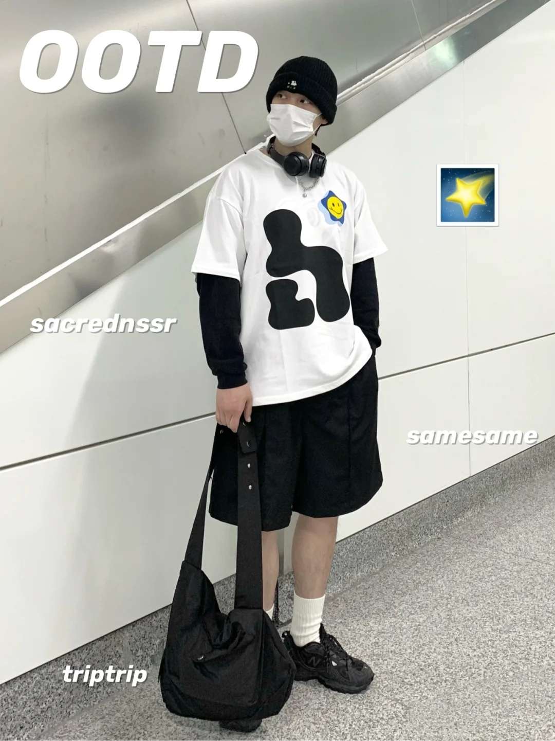 ⑤上次的奥利奥配色穿搭反响不错,今天再来一波一件白色短袖内搭一件黑色打底衫,胸口的印花也是大块奶牛配色,左胸还有一个类似小学时候老师奖励的小星星哈哈哈哈哈 再加一个街头感十足的斜挎包,整个穿搭就十分街头了 让我们再次一起扭一扭,舔一舔,泡一泡吧!