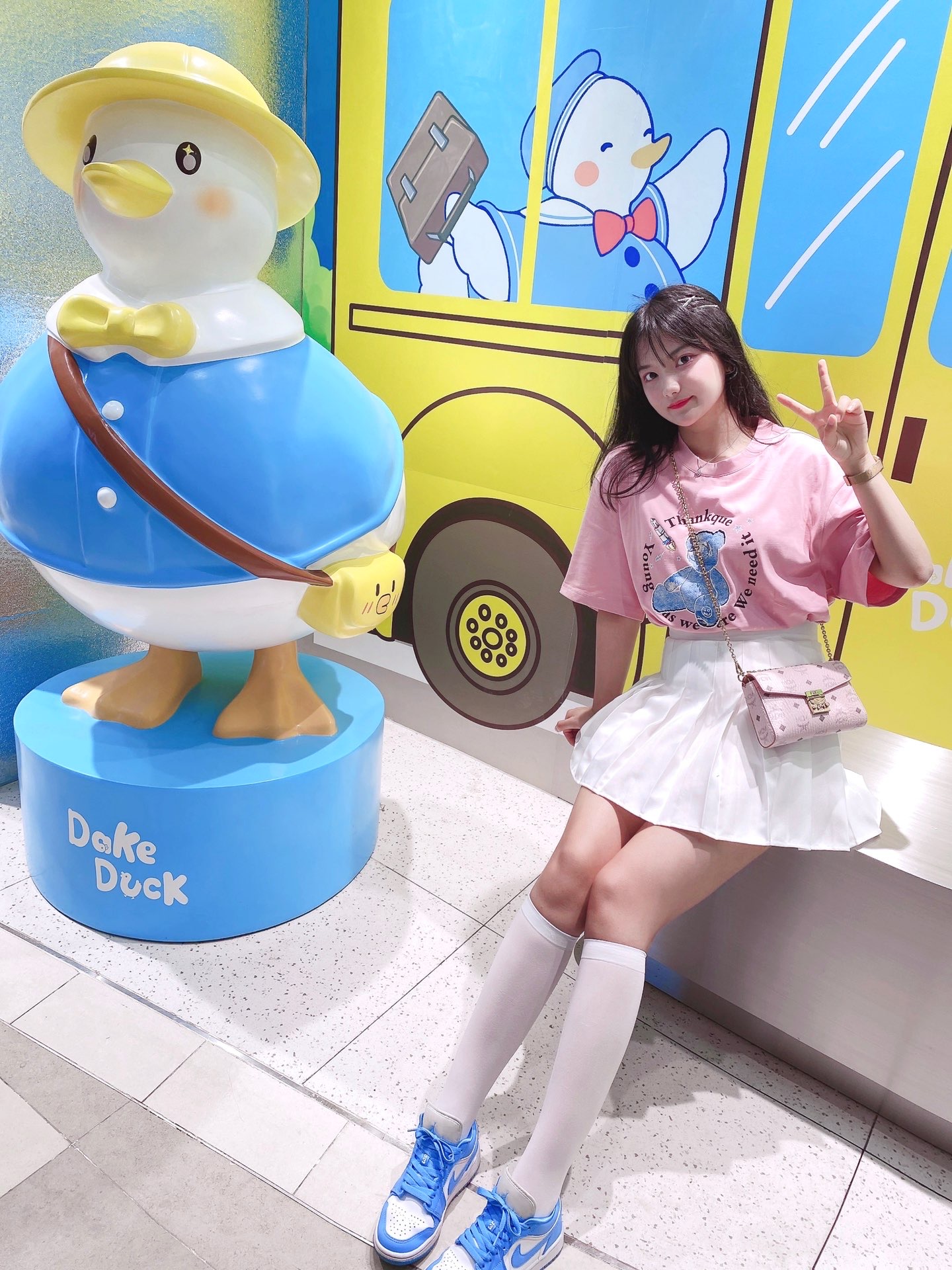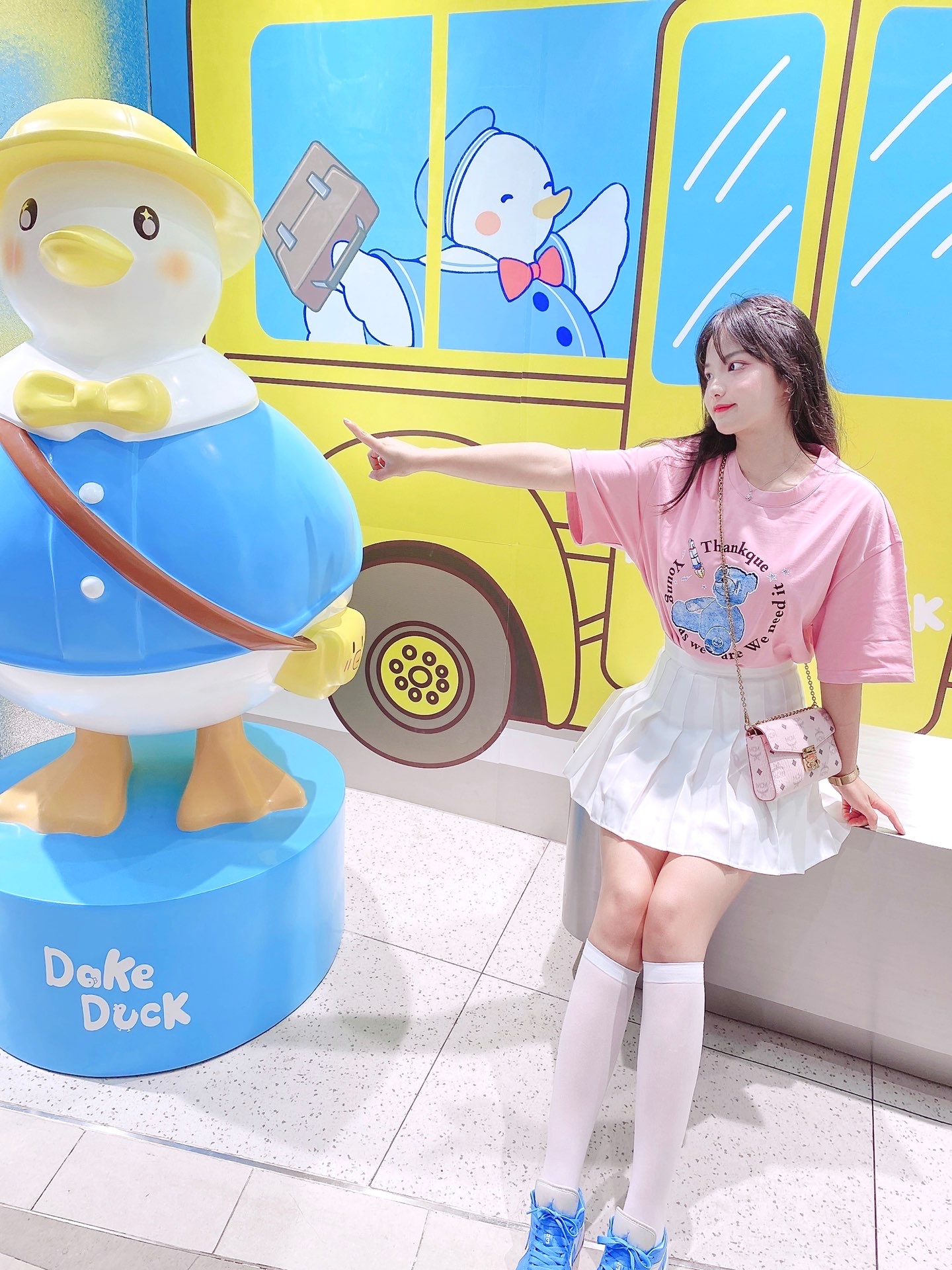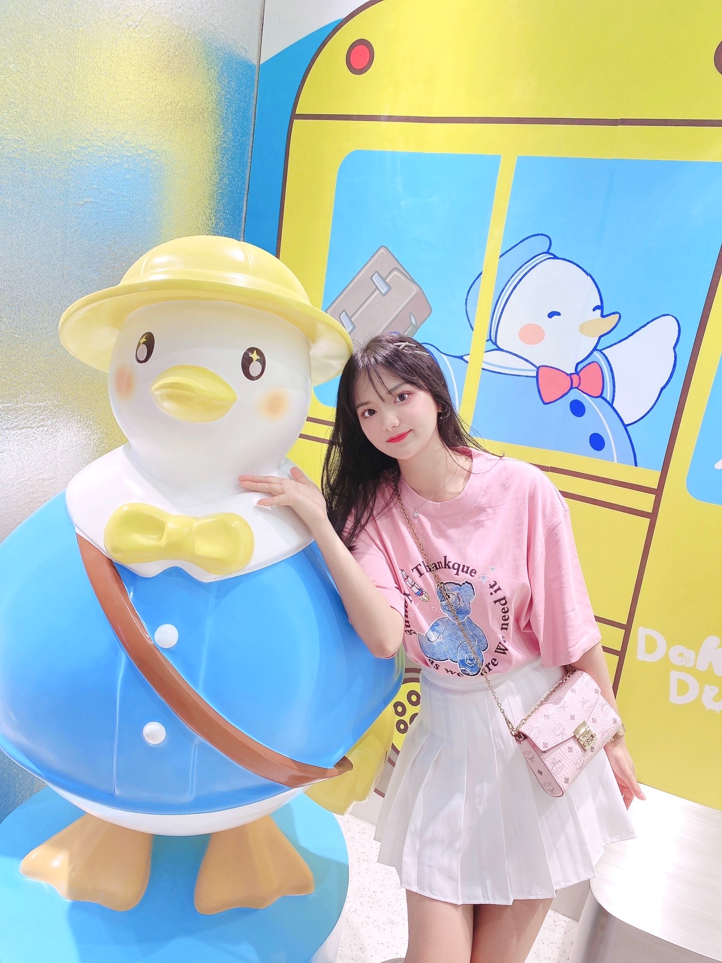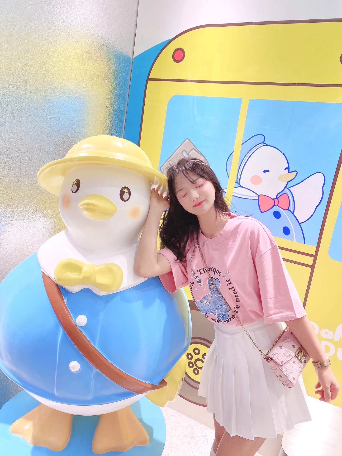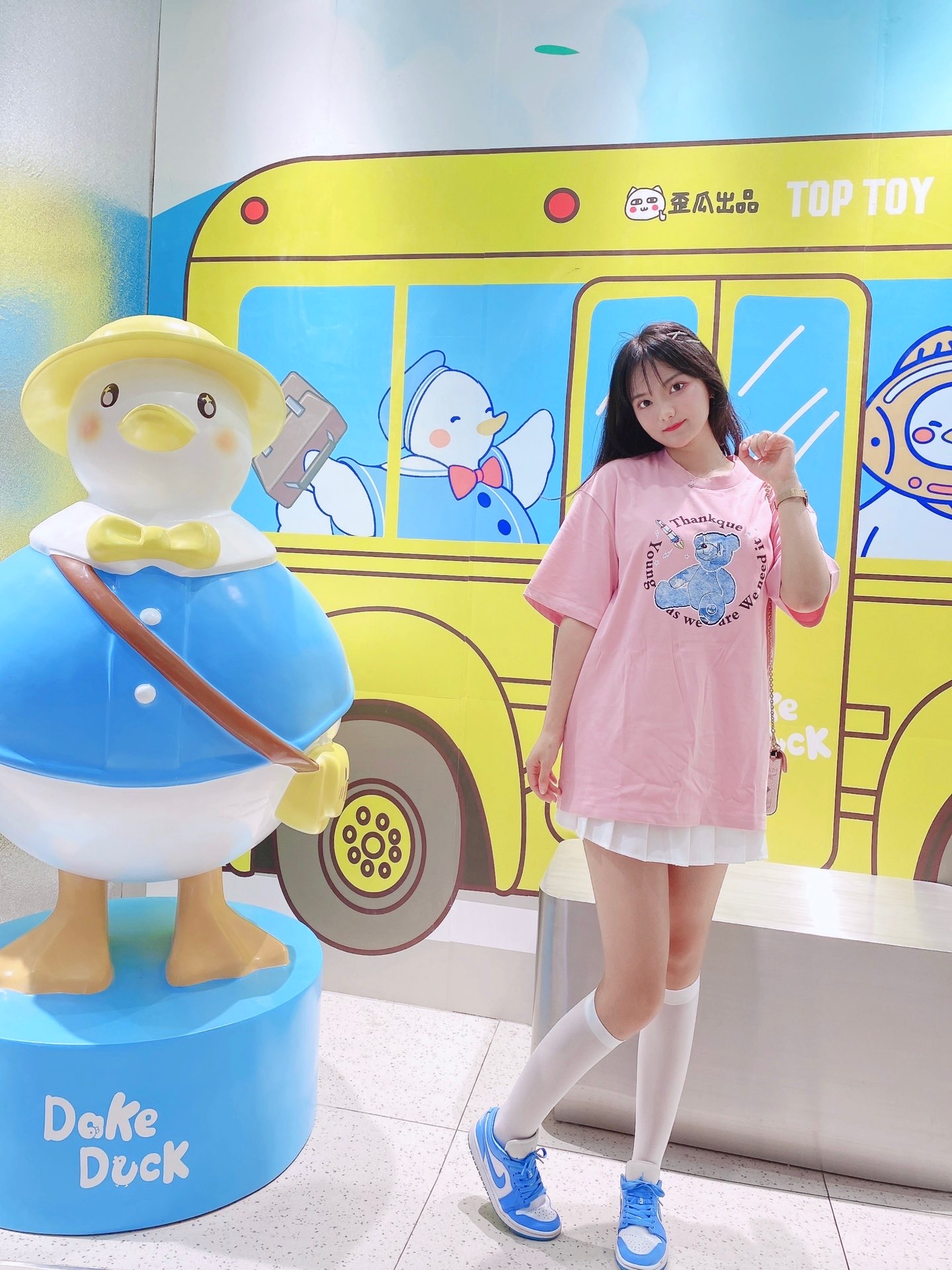 可可爱爱的一天 和朋友逛街的时候看到了一只非常可爱的小鸭子 忍不住跟它合影几张 今天穿的超级粉嫩 是很少女的感觉 有个很可爱的小熊图案🧸 而且衣服面料柔软无比 很适合夏天的感觉 元气满满充满青春感 衣服:Thankque