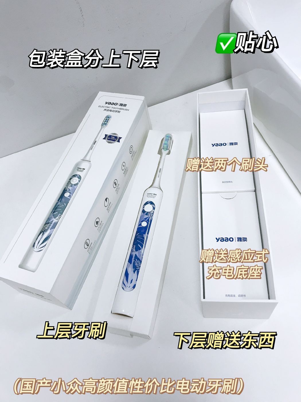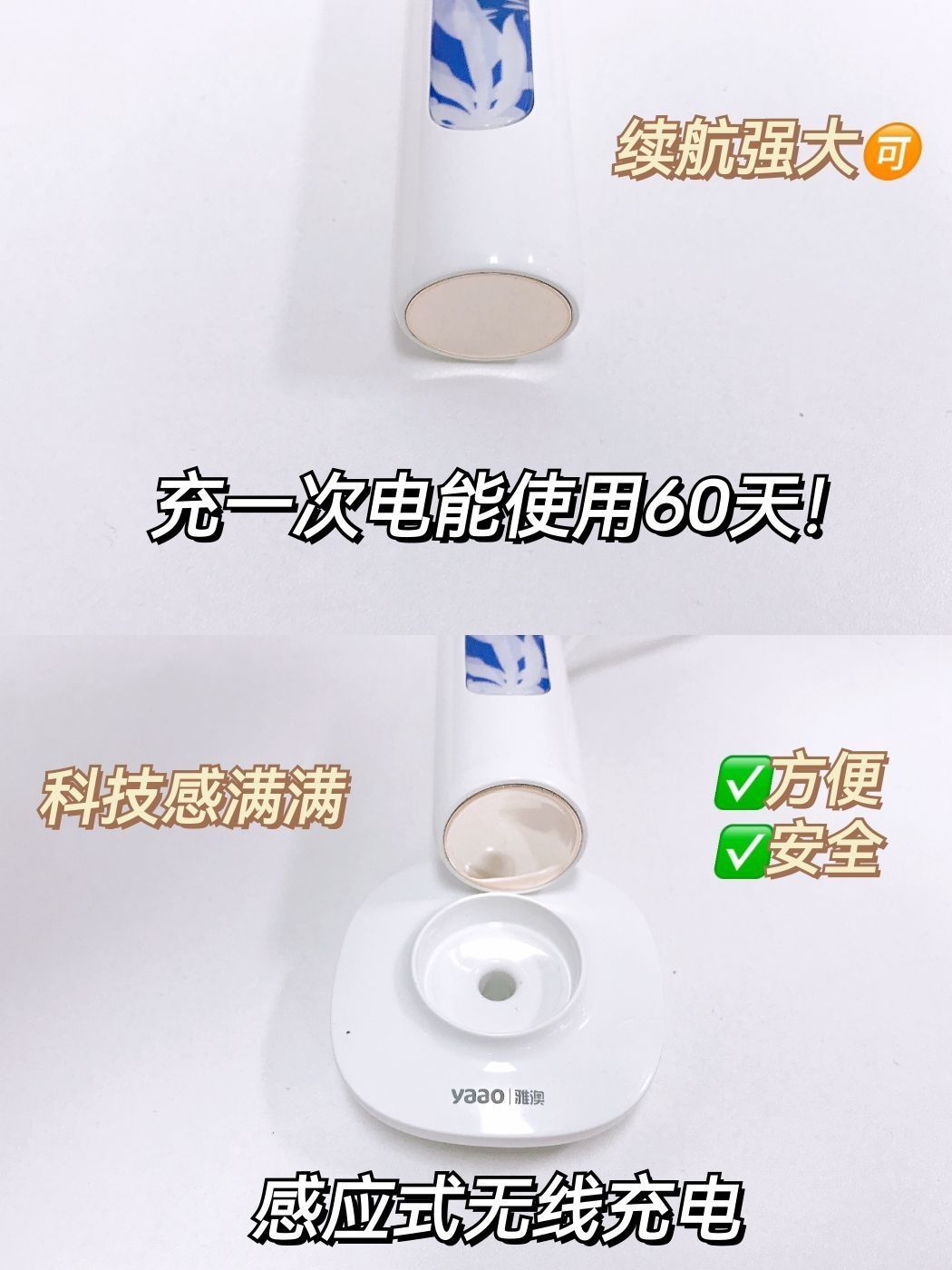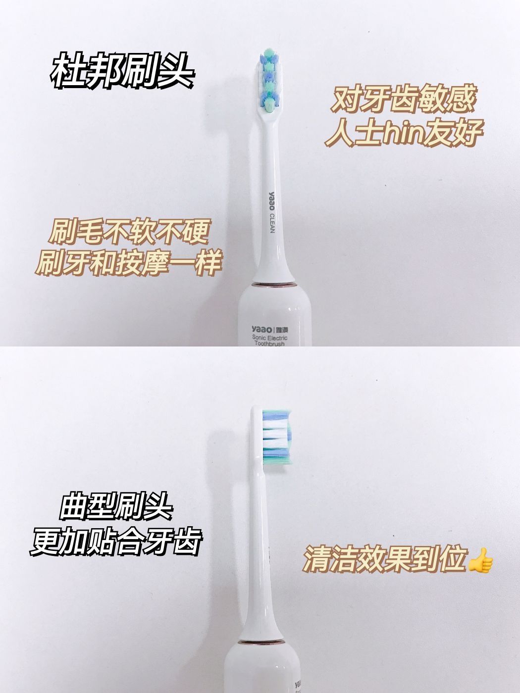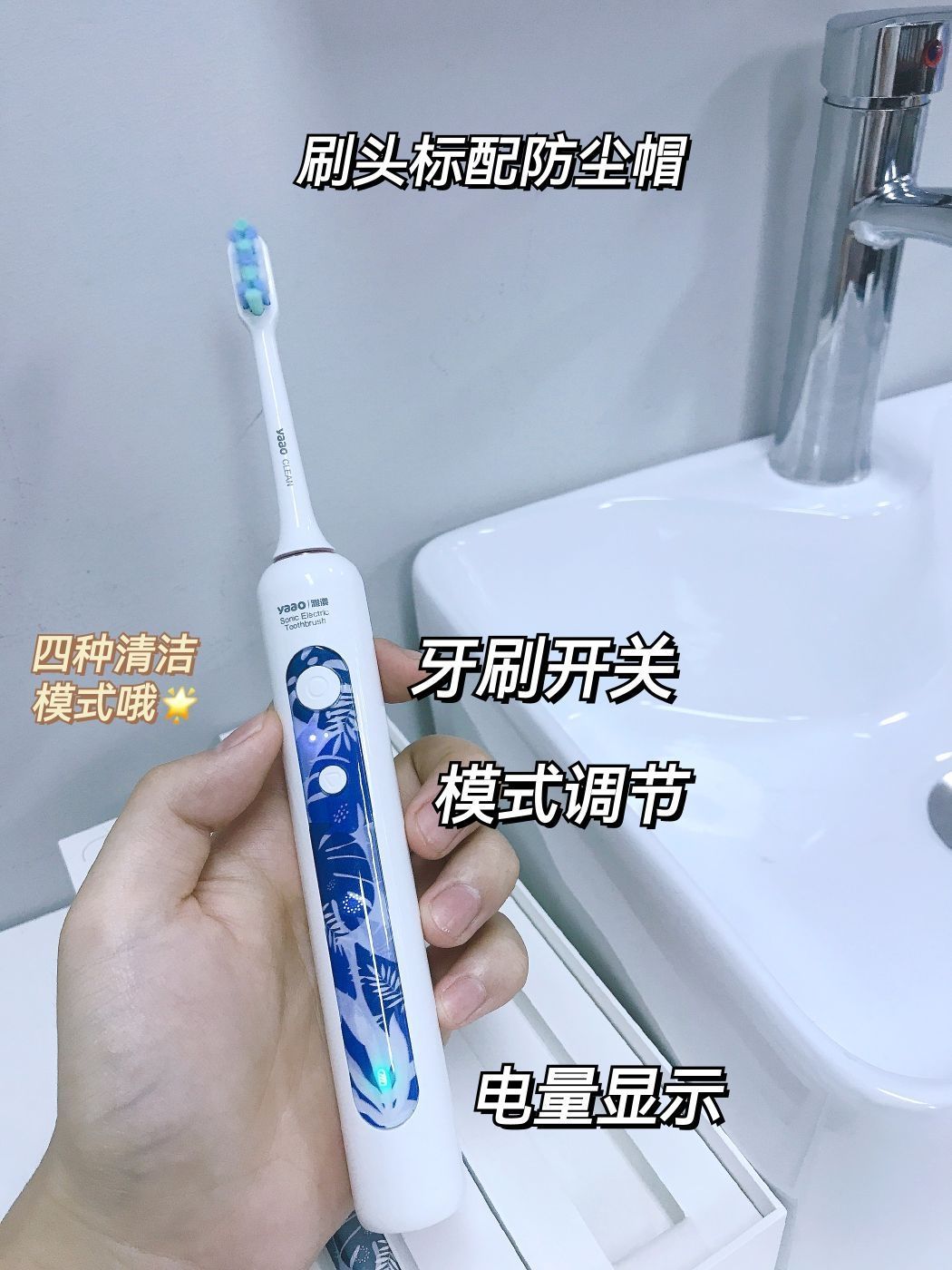 雅澳M2电动牙刷刷头采用了食品级的杜邦刷毛 3D立体波形设计,更适合亚洲人的口腔,刷毛顶端磨圆 使得敏感牙龈使用起来非常舒适。单位面积毛量提升30% 深入牙间隙,清洁不留死角。 功能方面,雅澳M2电动牙刷有四档智能护理模式 点击按键一次的清洁模式为35000次/分钟 强力破渍彻底清洁, 敏感模式为26000次/分钟 初期使用的用户或敏感人士使用 国产再也不是以前的国产了 vvv