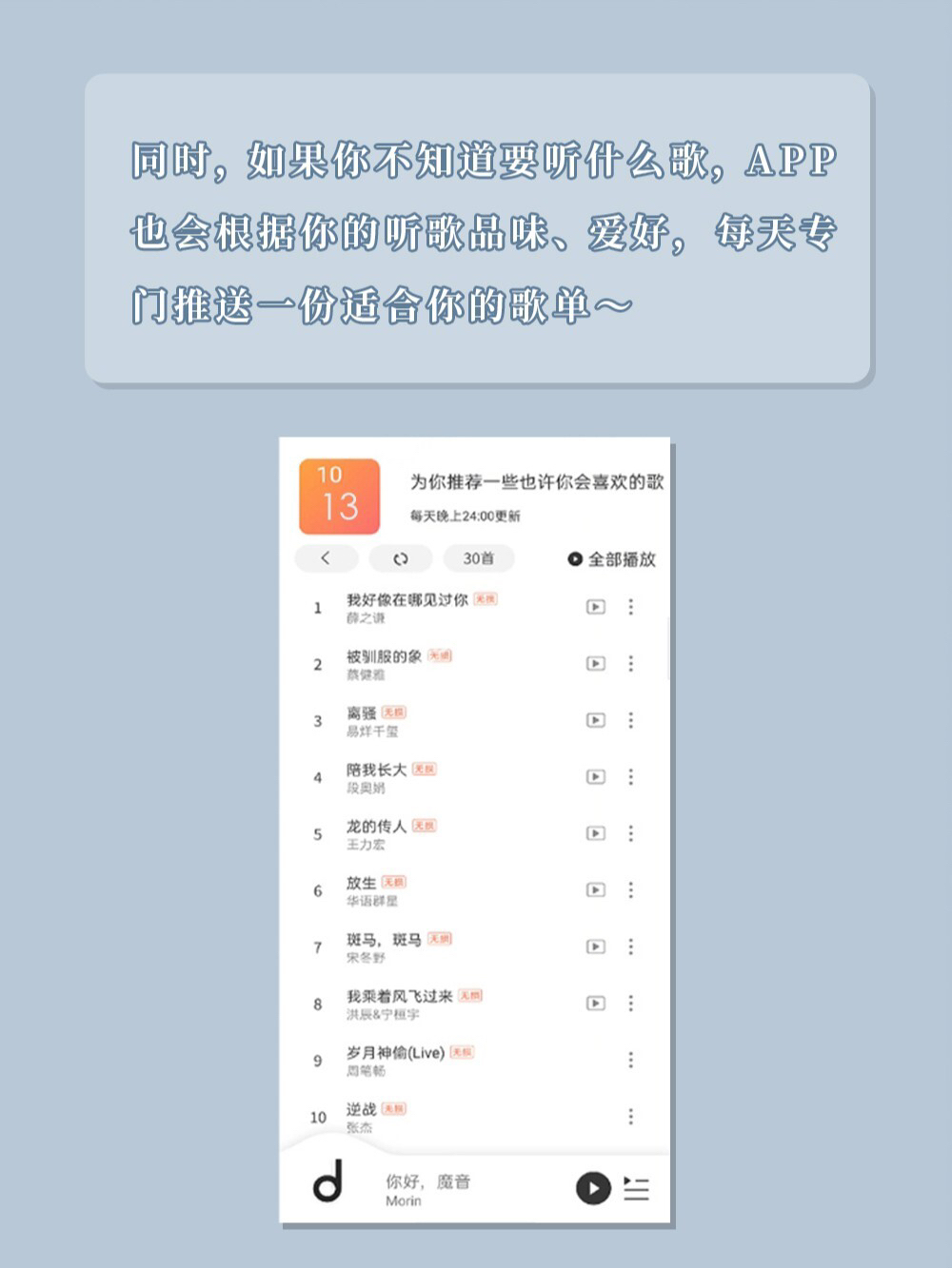 Hello~ 🙃 今天要给大家安利一个宝藏实用app —— 魔音Morin ♬ 这是个可以免费听歌的app, 而且真的可以承包你想听的all音乐! / 👏👏👏 推荐理由: ◼︎ app界面美观/干净简洁/免费! ◼︎ 有很详细的歌单分类和推荐 ◼︎ 手机/电脑都🉑️ ◼︎ 有搜索🔍功能,想听啥都可以直接搜到 ◼︎ 支持播放mv及下载无损音质歌曲 ◼︎ 有歌曲定时功能,助眠💤神器~ ◼︎ 会每日为你...