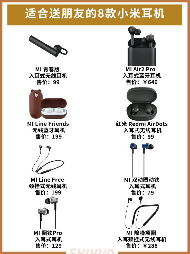 小米/MI 青春版 入耳式无线耳机 售价:99 特点:做工精美,磨砂手感很不错,扁平线条加上磨砂耳塞,续航在充电一小时后可达4小时耳机听,待机80小时,音质方面配合驱动用,降噪方面质量不错,适合开车时打电话的时候佩戴,上班族推荐 小米/MI Air2 Pro 入耳式蓝牙耳机 售价:649 特点:宽频主动降噪面对常见的噪音,通过前馈与反馈双麦克风,终提供至高35dB的混合降噪,而面对1000-30...