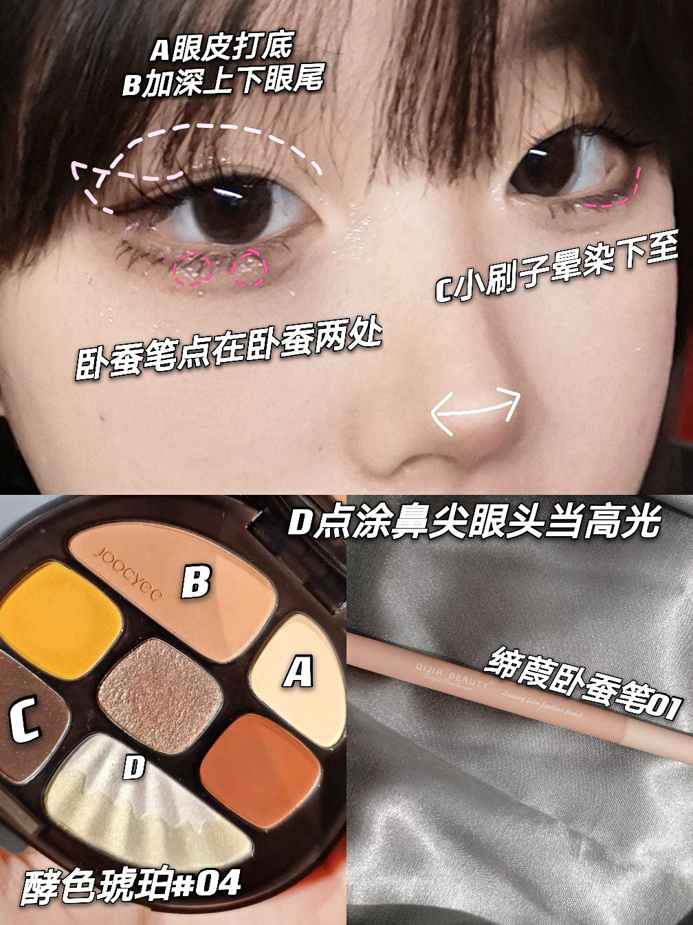 这可能是魔法吧哈哈哈哈 教程和色号有放在图中,眼影整的是酵色黄棕琥珀盘,U1S1我真的很对这种综合盘的胃口,不但化眼妆可以,腮红和高光也一起整,方便又好上手~ 缔葭卧蚕笔其实是我用了好久才来分享,真的很闪很亮,在脸上也扒妆,不会蹭几下就掉,性比价之王! 👄:这个UNNY唇泥是一个蓝调玫红,橄榄皮姐妹可以冲了,质地软糯但不会拔干!爱了爱了~ 眼珠子:绮芙莉的小步舞曲紫,融瞳效果超好,...