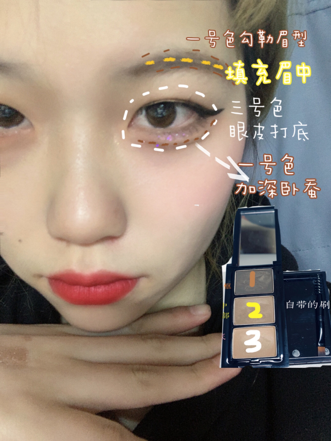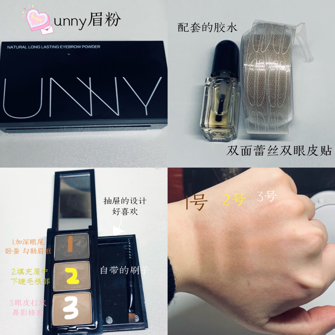 遇到贴双眼皮的瓶颈期了 我觉得我又🉑️了 ‼️我发现我化妆品unny的好多呀有眉粉高光眼线笔都是呜呜呜 ‼️卧蚕好像也是眼妆的灵魂了太棒了用unny眉粉的一号色勾勒卧蚕的形状 ‼️然后用二号色画在双眼皮贴上方加深双眼皮形状!!眉毛我一直不怎么会画unny眉粉二号色简直是宝藏便填充一下就很自然有眉的效果适合我这种手残画眉党 🔗🔗卧蚕提亮用的芭贝拉液体眼影二号色 bling bling很好看哒 05...