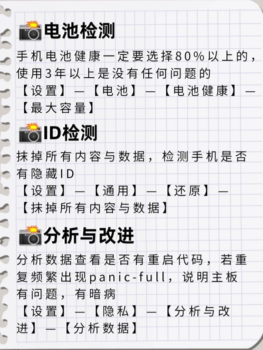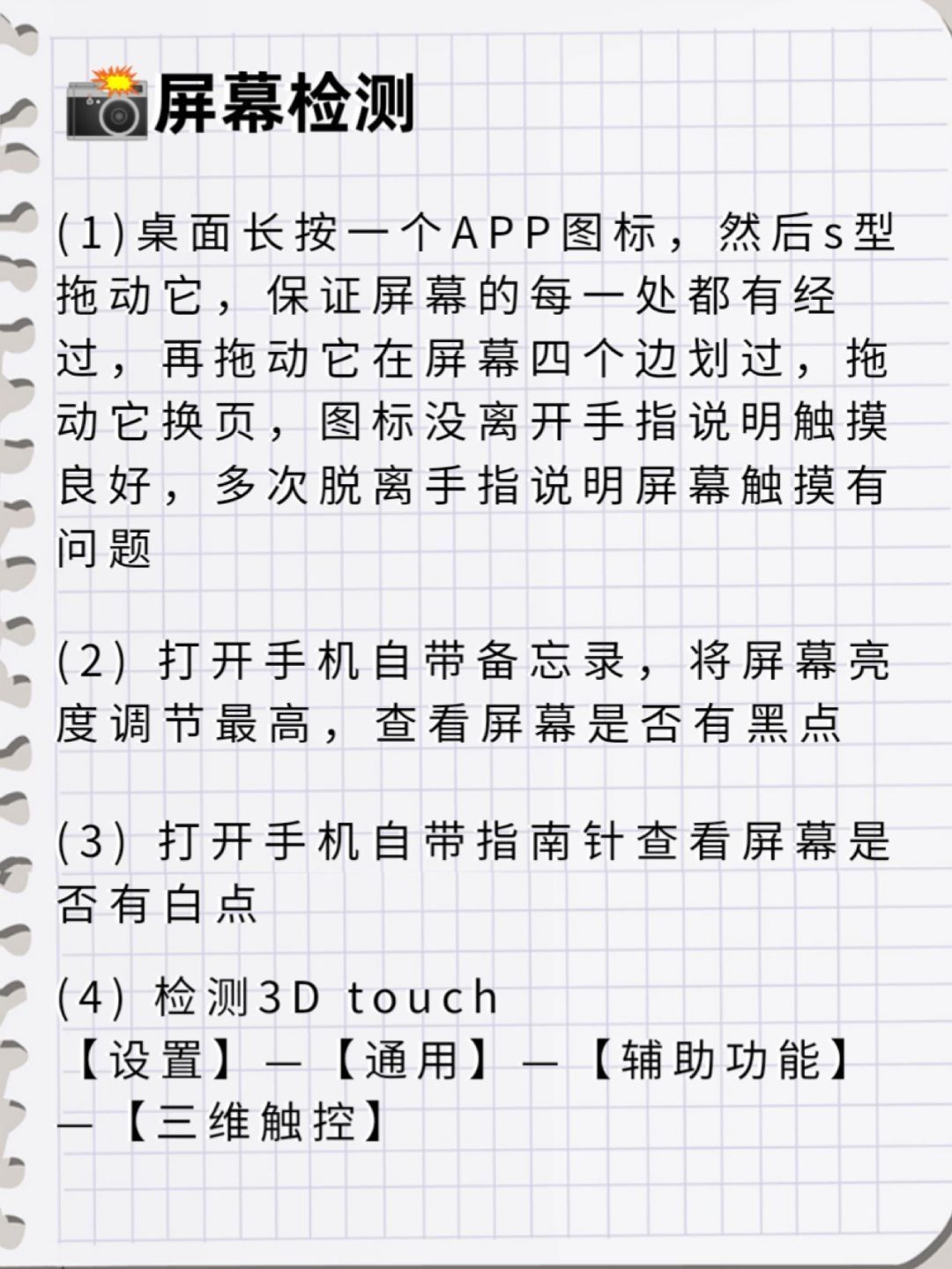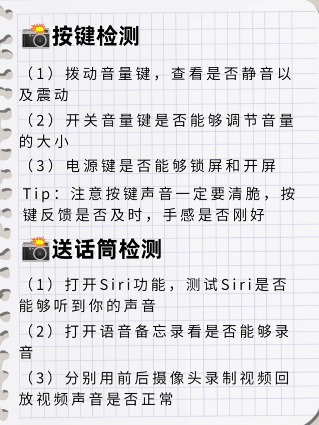 🌟Tip:开箱验机请录制视频,若机子有问题可以视频为证!👍👍 快速检测手机,判断你的二手机是否正常! ✅检测外观和成色,有无划痕磕碰,有无变形弯曲,判断成色是否与卖家叙述一致~ ✅用爱思助手或者沙漏检测手机,看看用没用更换零件,比如电池、屏幕…… 🔥扩容机基本可以在上面检测出来,但爱思全绿也并一定代表完全没有问题~ ✅进入系统,进行手机功能检测: ☞ 1⃣️屏幕检测 2⃣️按键检测 3⃣️送话筒检...