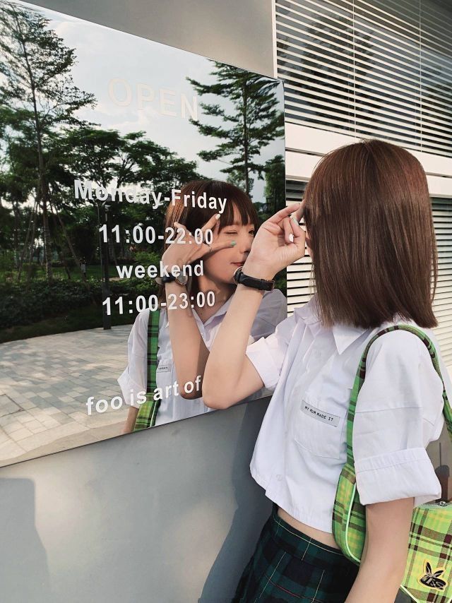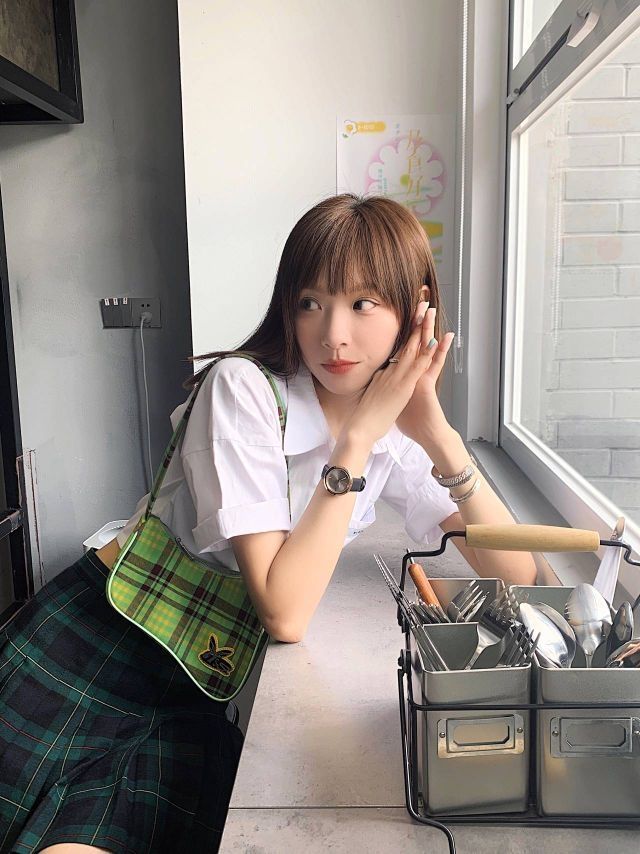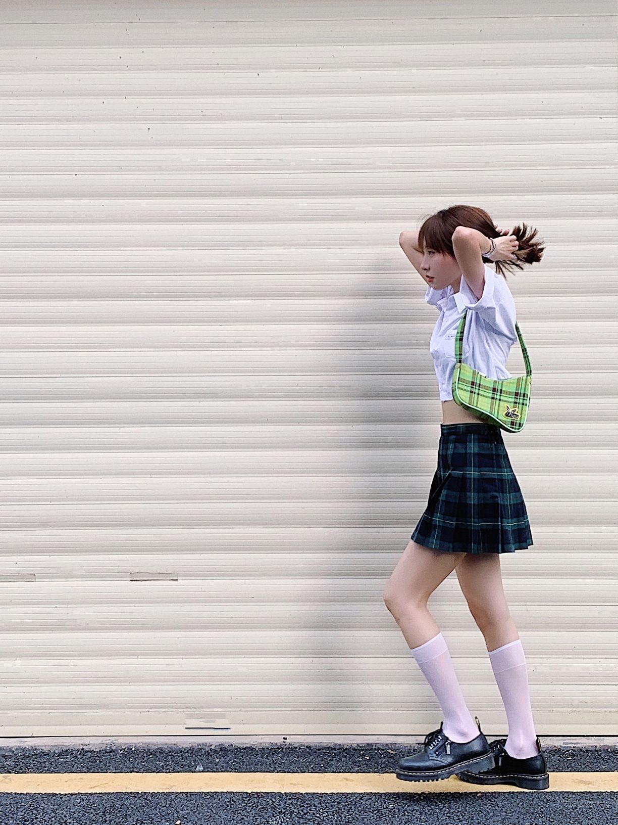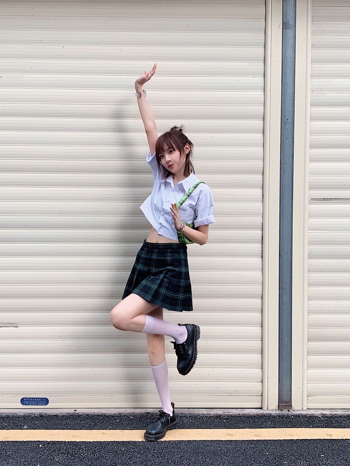 哦豁 想搭层次感的穿搭又怕太热 没关系 同色系也可以做叠层穿搭🤭 日系学生风穿搭必备:白色衬衫 、绿色格子百褶裙 、过膝袜还有小皮孩 🍏那我会再搭个同色系亮色的青草绿的包包 咳咳这是 是重点喔 让绿色瞬间元气起来👌 走在路上 都有不少可爱妹妹来问我包包单品儿 嘿嘿 就是不告诉你 就是玩儿🤭